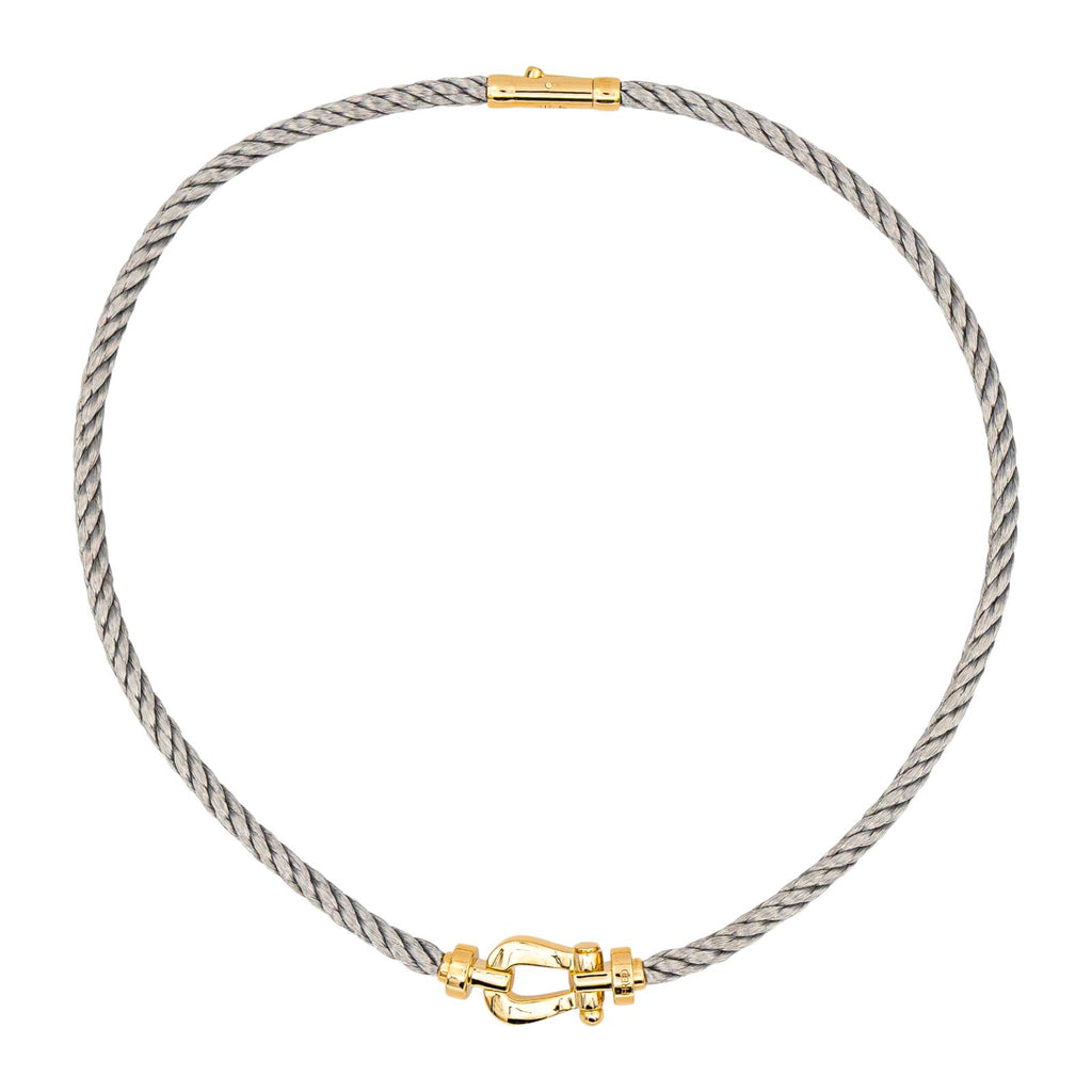 Collier signé de la Maison Fred en acier et or jaune 750 millièmes (18 carats), modèle Force 10, maille torsadée, longueur : 44,00 cm, largeur : 1,35 cm, épaisseur : 0,80 cm, poids total : 41,63 g, poinçon tête d’aigle, vendu avec écrin d’origine et d’époque, numéroté : 907534, excellent état