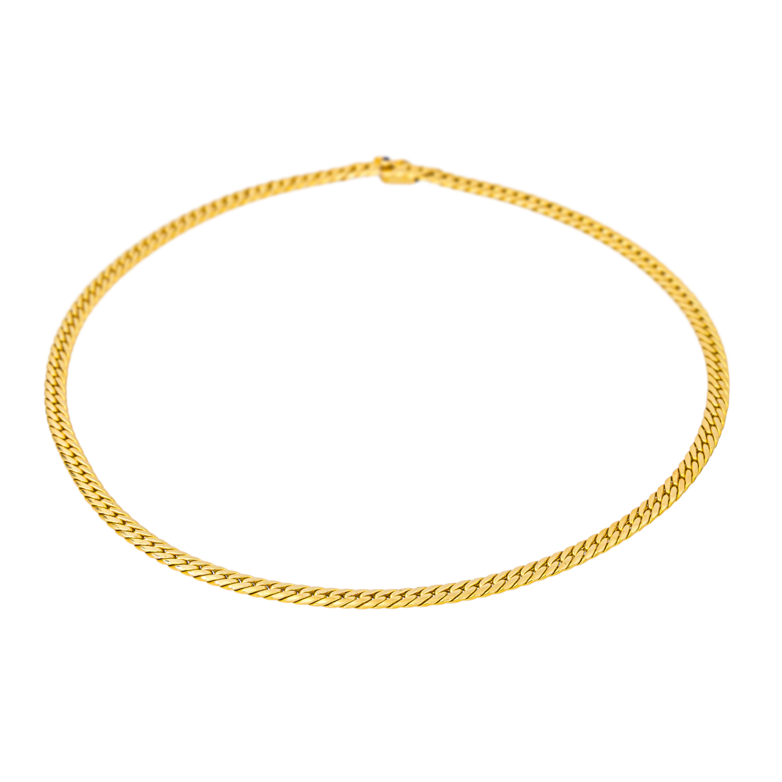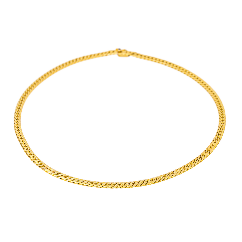 Chaine signée de la Maison Caplain Paris en or jaune 750 millièmes (18 carats), maille anglaise, fermoir cliquet avec 8 de sécurité serti d'un saphir de 0,02 ct environ taillé en cabochon, longueur : 41 cm, largeur : 0,40 cm, épaisseur : 0,10 cm, poids total : 14,99 g, poinçon tête d’aigle, excellent état