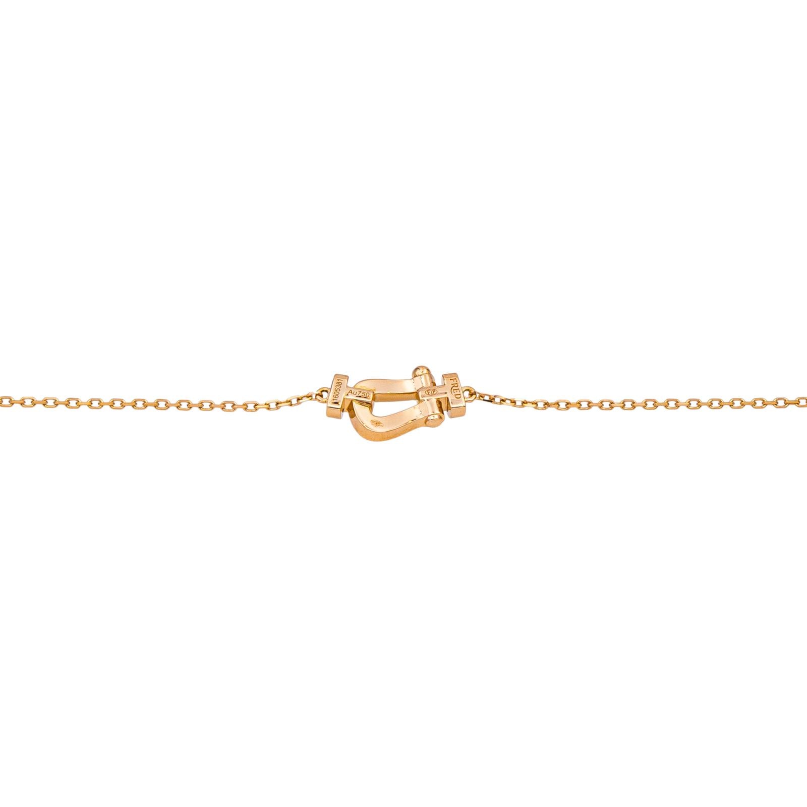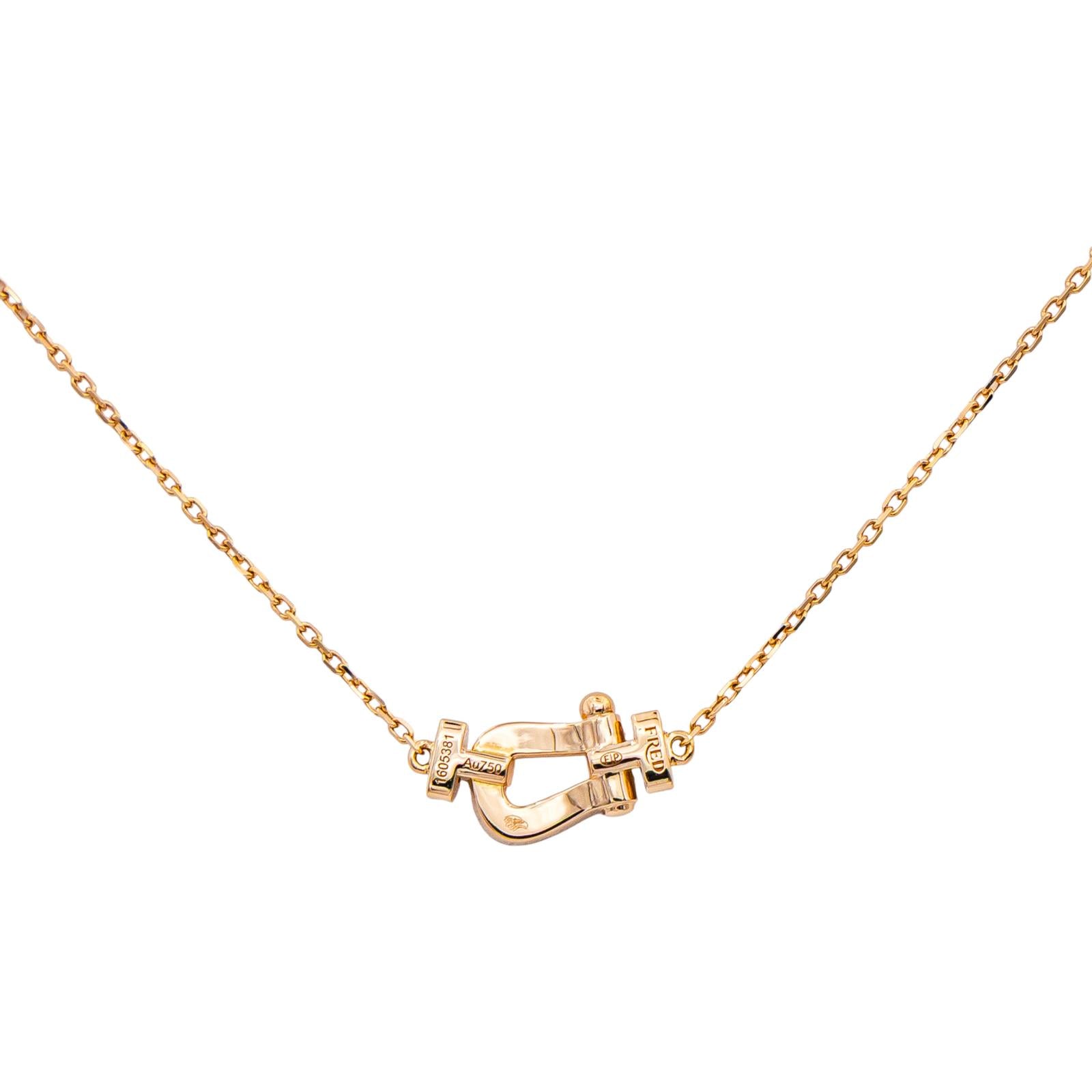 Collier signé de la Maison Fred, collection foce 10, petit modèle, en or rose 750 millièmes (18 carats), motif pavé de diamants taille brillant, environ G/VS, pour un total d'environ 0,06 ct, longueur : 40 cm avec anneau intermédiaire à 38 cm, dimensions motif: 1,25 cm x 0,63 cm, poids total: 2,76 g, numéroté, poinçon tête d'aigle, livré avec écrin Fred d'origine, excellent état