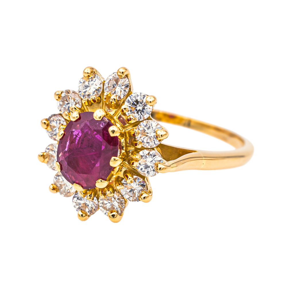 Bague marguerite en or jaune 750 millièmes (18 carats), sertie d'un rubis glassfield et de diamants, 1 rubis taille ovale, d'un poids total d'environ 1,00 cts, entouré de 12 diamants taille brillant, environ G/VS, d'un poids total d'environ 0,72 ct, (chaque diamant d'un poids d'environ 0,06 ct), largeur sur le dessus : 1,60 cm, tour de doigt : 60, poids total : 5,65 g, poinçon hibou, excellent état
