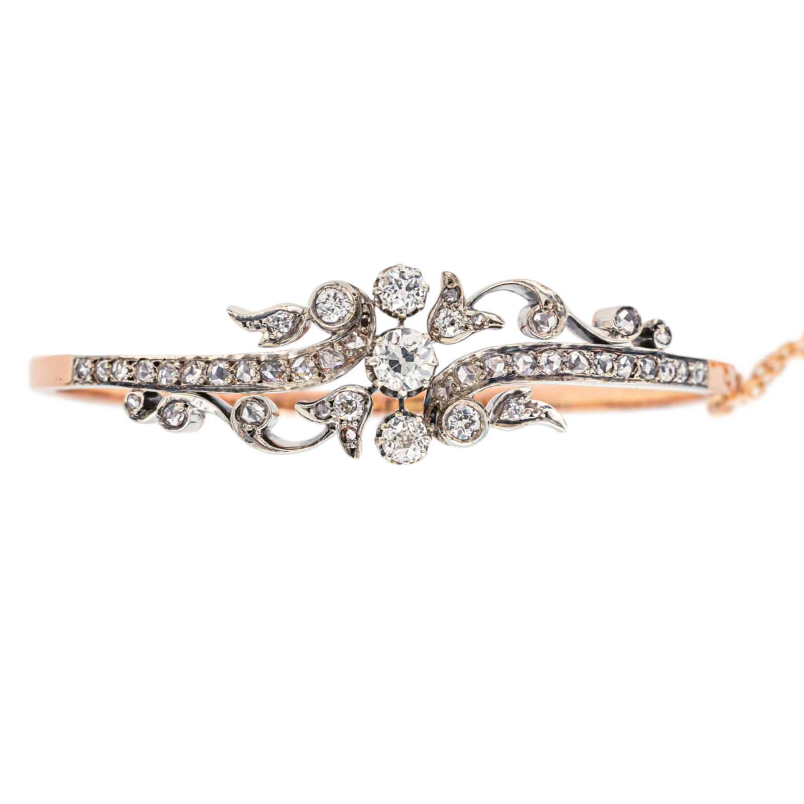 Bracelet jonc en or rose et blanc 750 millièmes (18 carats), serti de 39 diamants, 3 diamants taille ancienne, environ G-SI, d'un poids total d'environ 0,92 ct, (un diamant d'un poids d'environ 0,74 ct, et 2 diamants d'un poids d'environ 0,09 ct), 2 diamants taille ancienne, environ H-SI, d'un poids total d'environ 0,48 ct, (chaque diamant d'un poids d'environ 0,24 ct), 34 diamants taille rose, environ G-SI, d'un poids total d'environ 0,68 ct, (chaque diamant d'un poids d'environ 0,02 ct), poids total diamants environ : 2,08 cts, diamètre intérieur : 6,12 cm x 4,55 cm, largeur : 1,76 cm, tour de poignet : 19,50 cm, ouvrant, fermoir languette avec chaine de sécurité, poids total : 18,86 g, poinçon tête d’aigle, excellent état