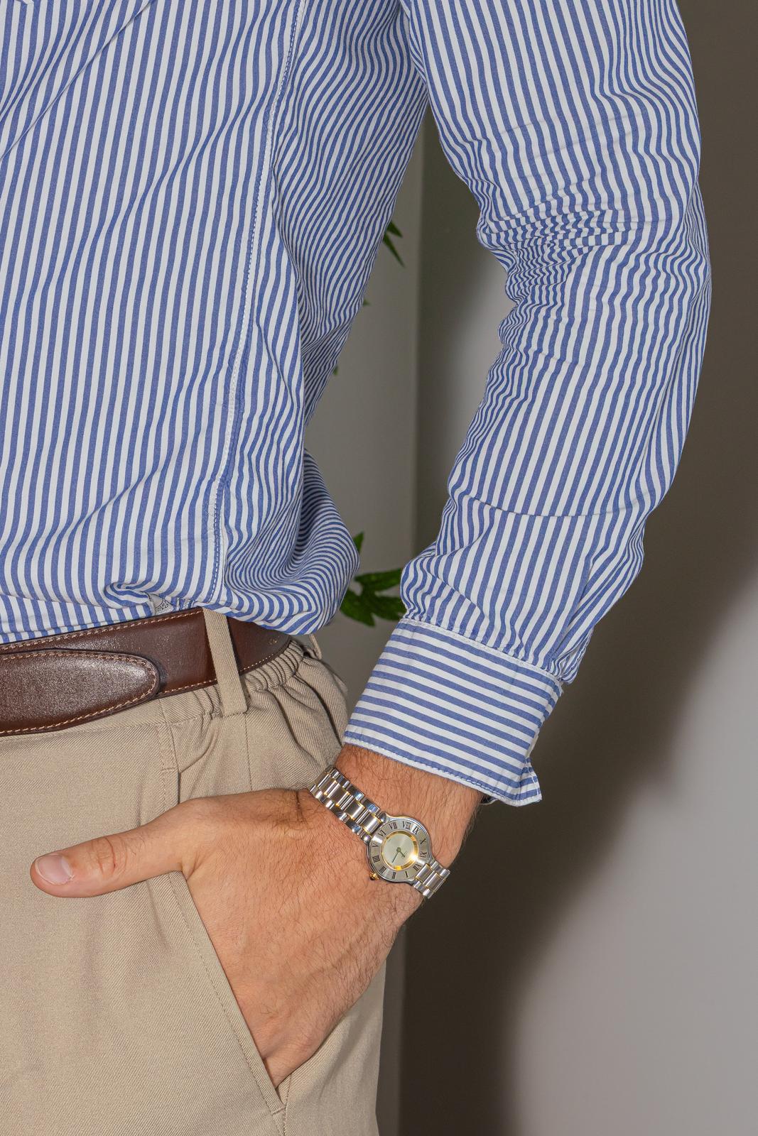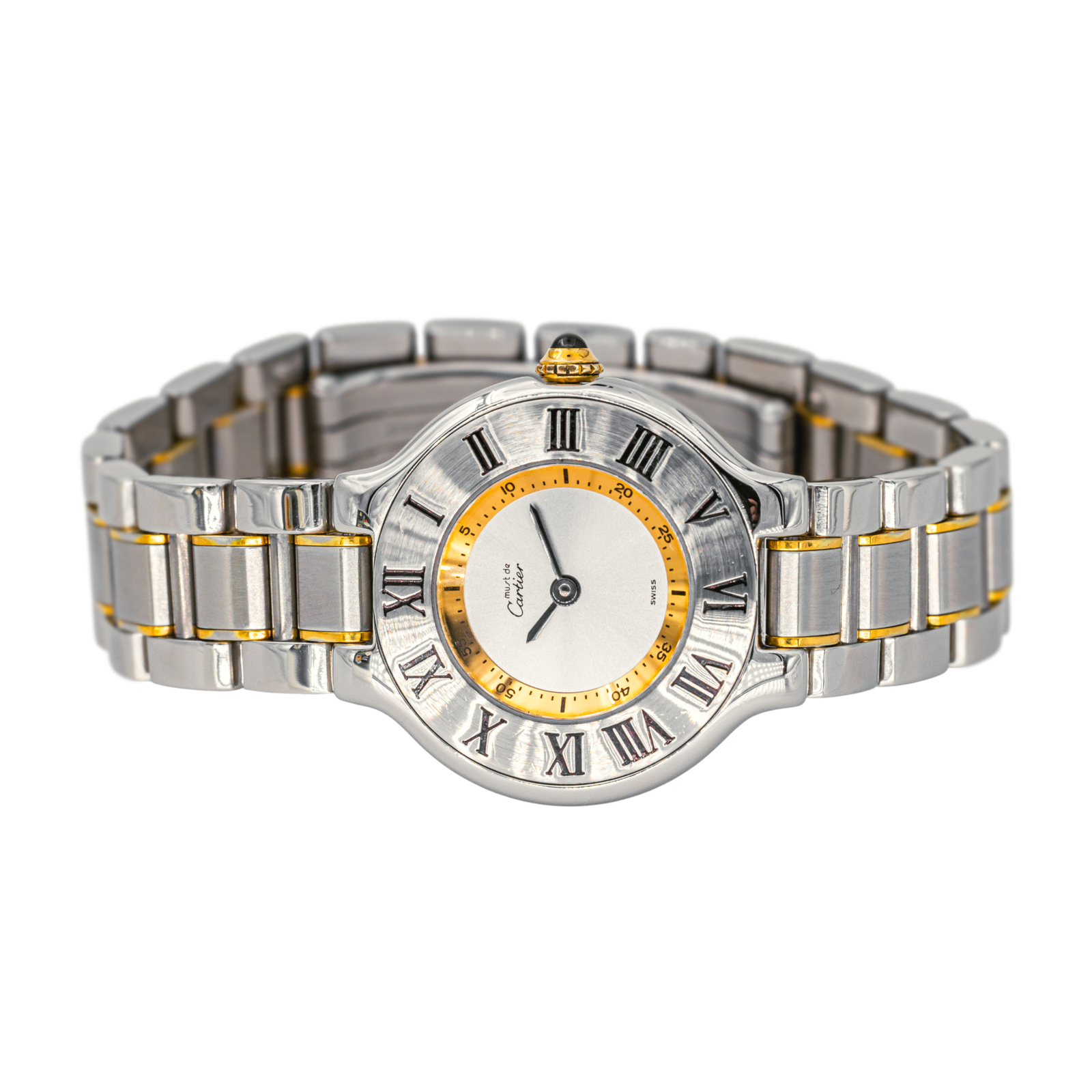 Montre Cartier modèle Must de Cartier 21 référence1340 en acier et or jaune 750 millièmes (18 carats), n°série PL161100, cadran argenté à chiffres romains, mouvement à quartz, boîtier 28 mm, verre saphir, bracelet en acier et or jaune boucle déployant (taille poignet 17 cm, largeur bracelet 1,4 cm), poids total : 61,20 g, vendue avec sa boite d'origine, années 1990, révision complète et garantie 1 an, excellent état
