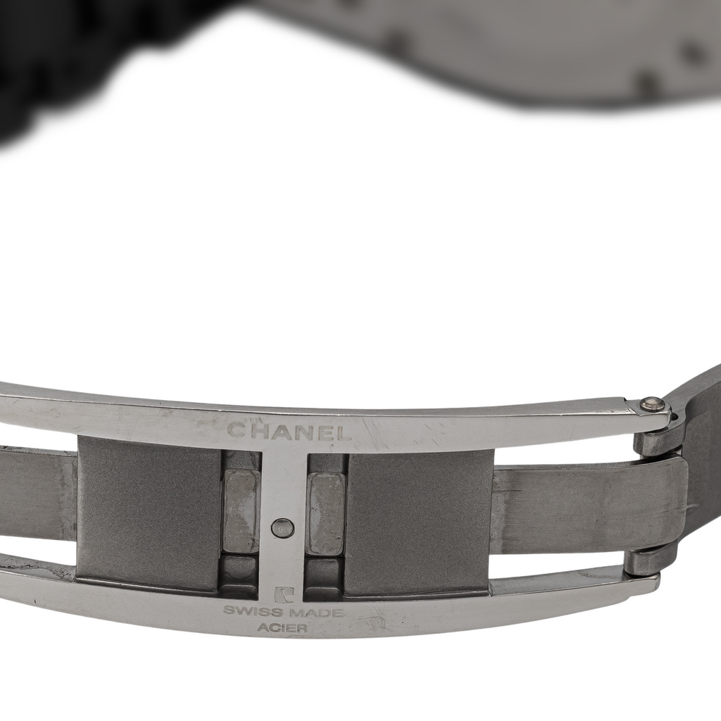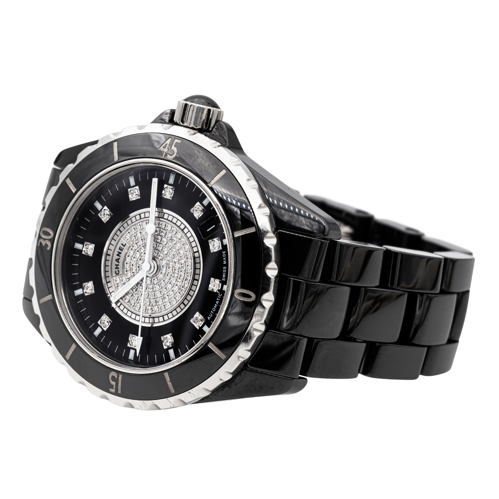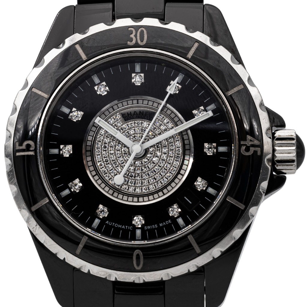 Montre Chanel J12, céramique noire, index diamants, mouvement mécanique à remontage automatique, boîtier 38 mm, poignet: 19,5 cm, largeur bracelet: 1,8 cm, pavage diamants sur le cadran centrale, poids total diamants: environ 0,60 ct, taille brillant environ G/VS, numérotée n° LN85004, révisée, écrin d'origine avec 2 maillons suplémentaires, poids total: 135,84 g, excellent état