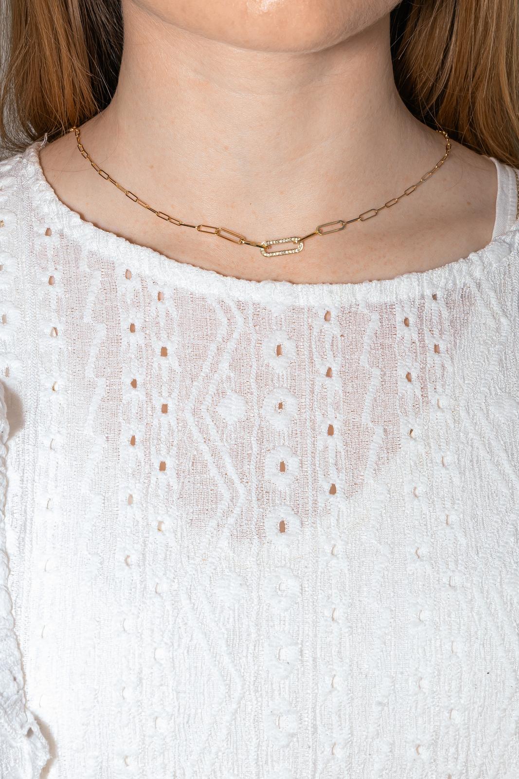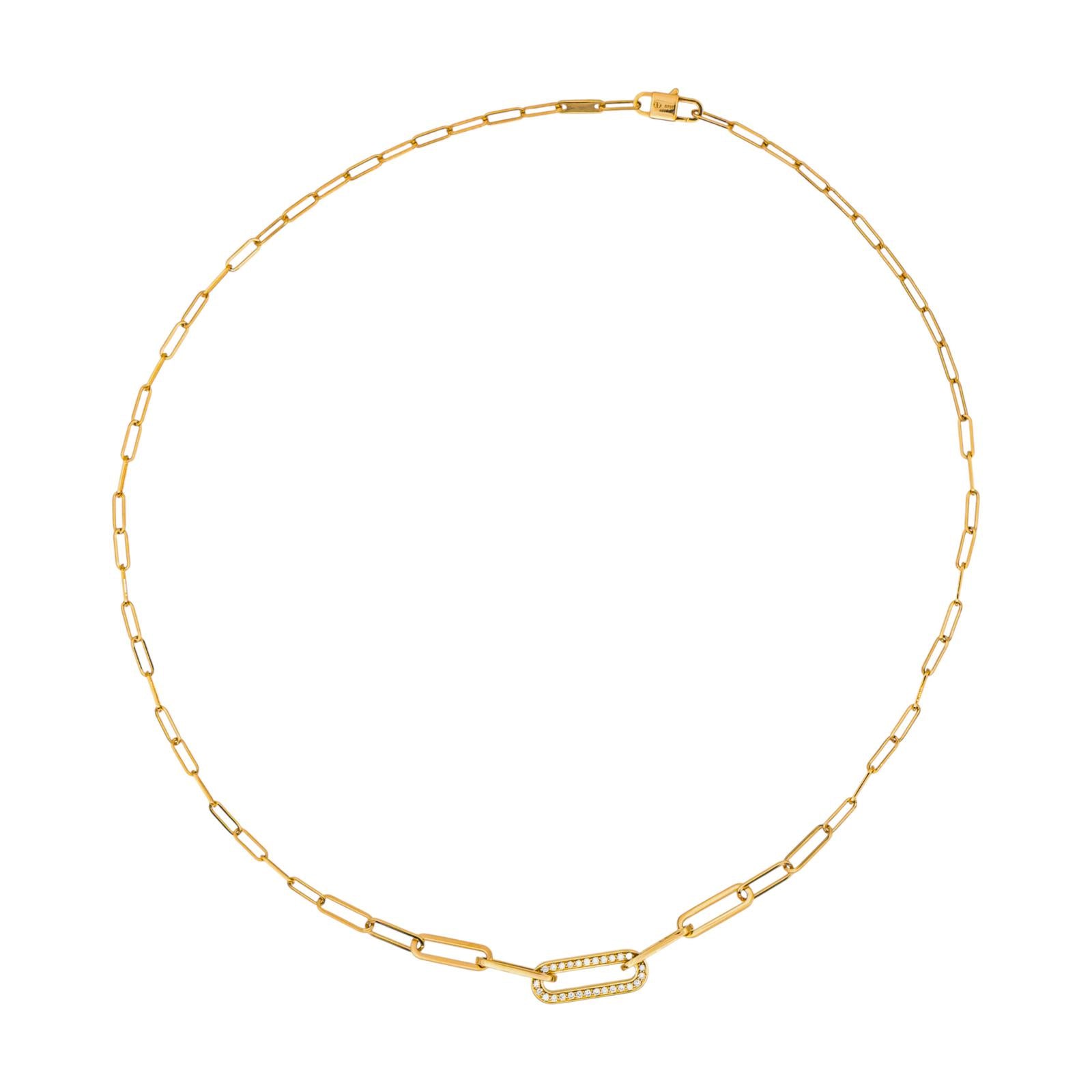 Collier signé de la Maison Dinh van en or jaune 750 millièmes (18 carats), petite modèle Maillon, motif géométrique serti de 27 diamants, environ G-VS, taille brillant, poids total diamants : environ 0,13 ct, (chaque diamant d'un poids d'environ 0,005 ct), longueur : 38,50 cm, largeur de la chaîne : 0,22 cm, longueur de la partie comprenant le motif : 1,60 cm, largeur : 0,64 cm, poids total : 5,16 g, poinçon tête d’aigle, vendue avec écrin d’origine et d’époque, excellent état
