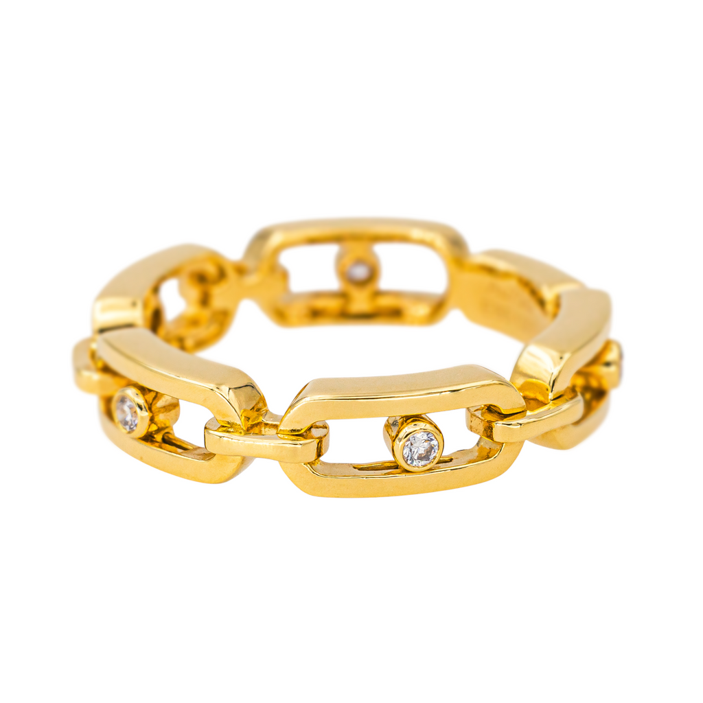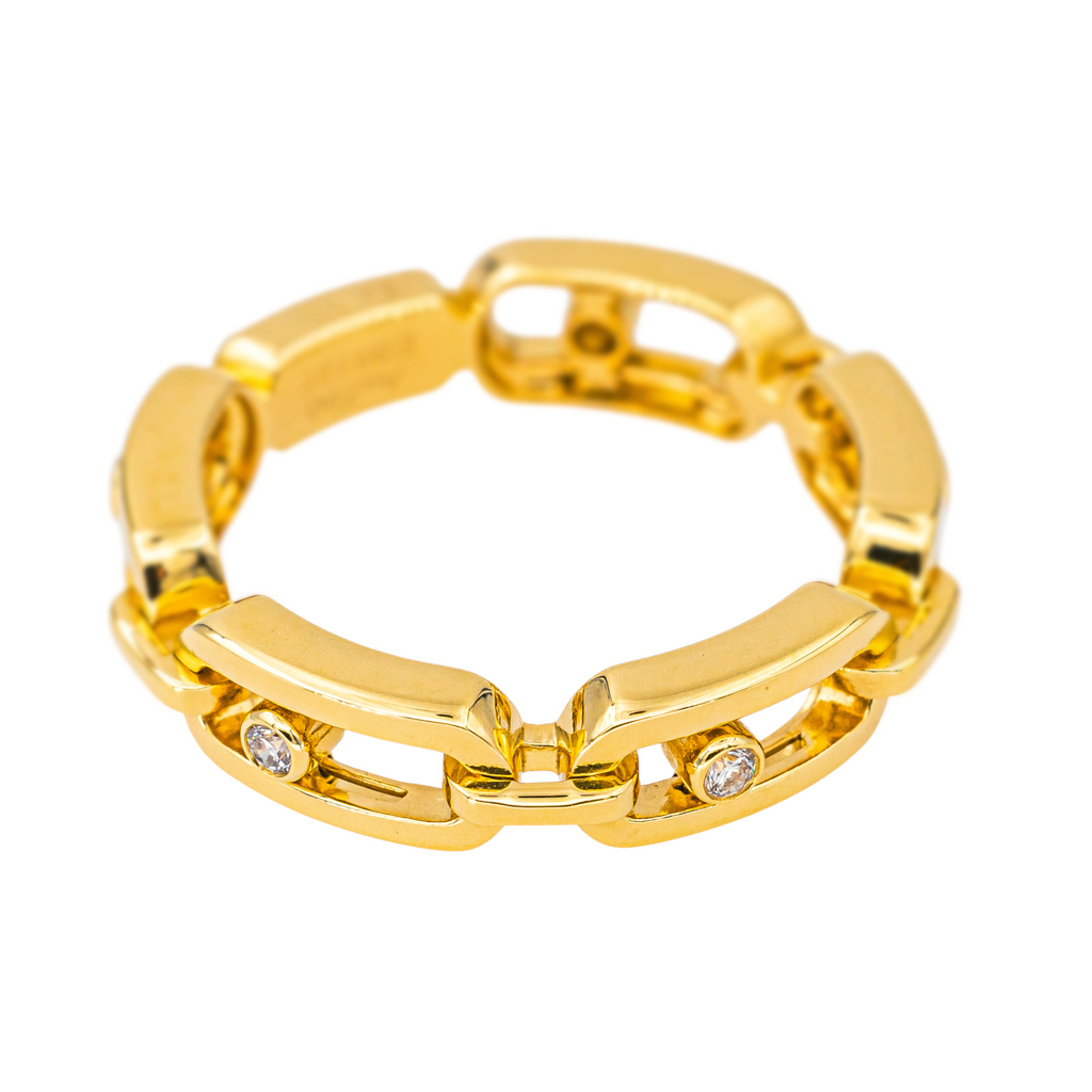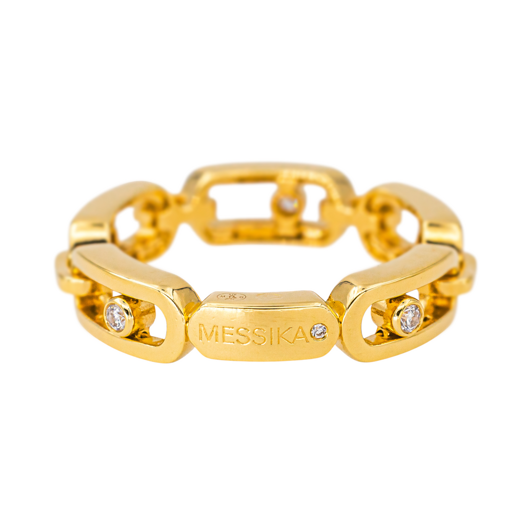 Bague signée de la Maison Messika en or jaune 750 millièmes (18 carats), modèle Move Link muti, sertie 5 diamants, taille brillant, environ G-VS, d'un poids total d'environ 0,09 ct, (chaque diamant d'un poids d'environ 0,018 ct), largeur sur le dessus : 0,45 cm, tour de doigt : 51, poids total : 4,40 g, poinçon tête d'aigle, numérotée : E85127, excellent état