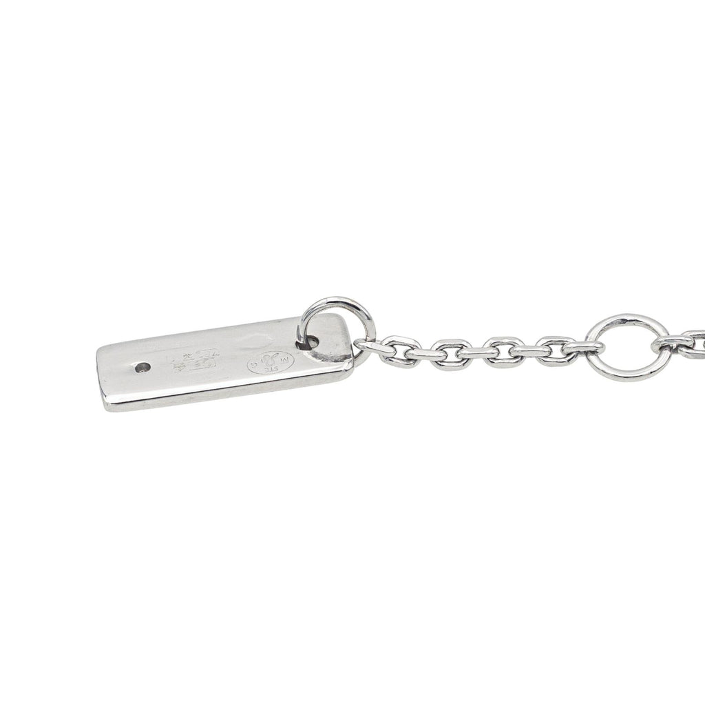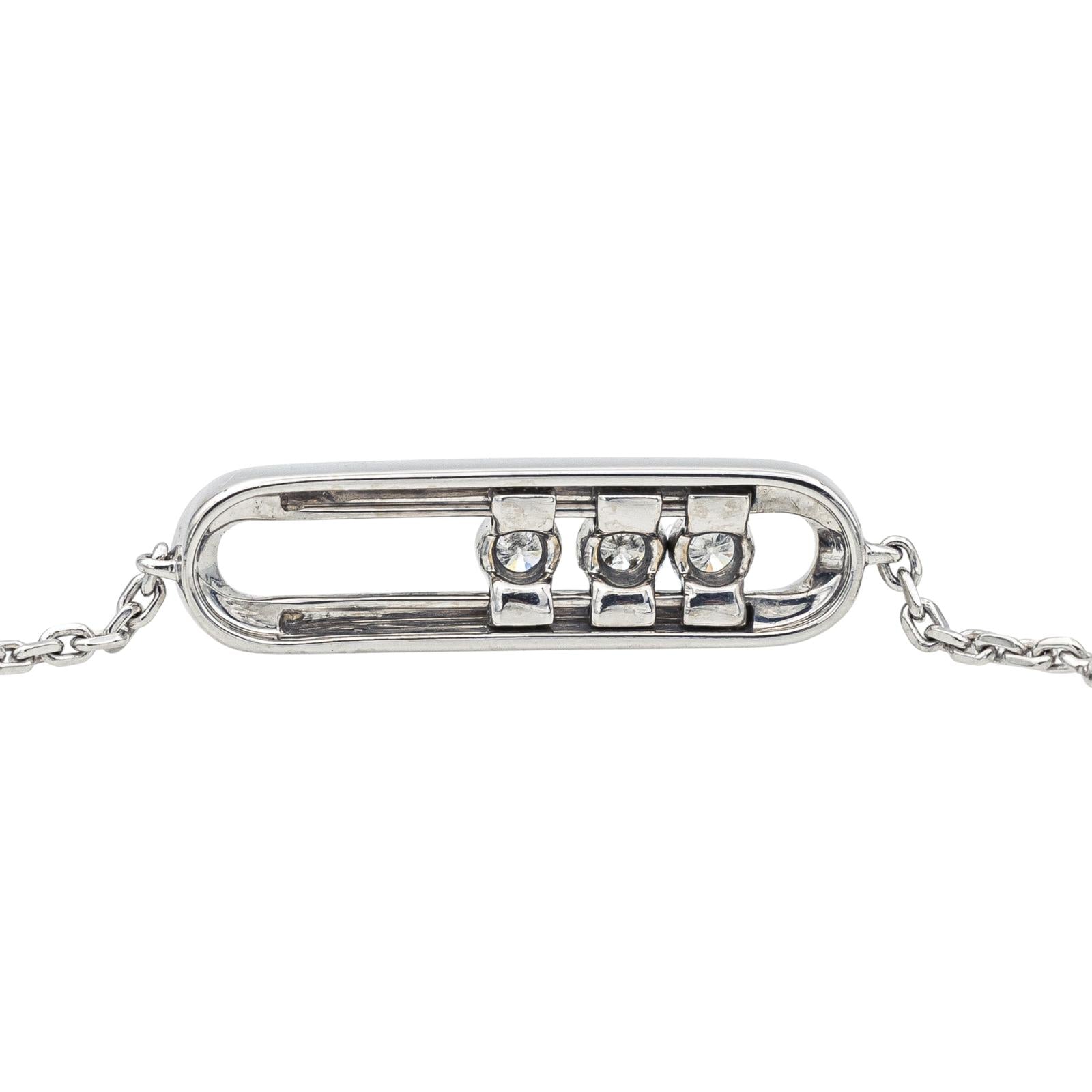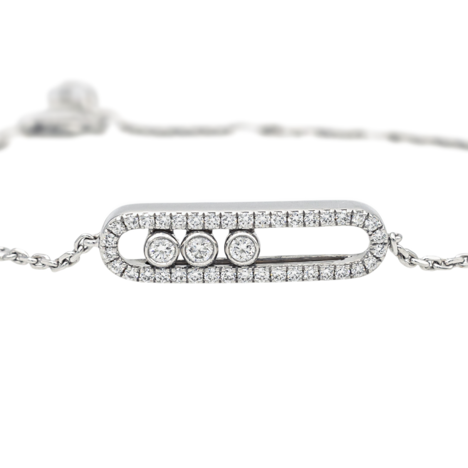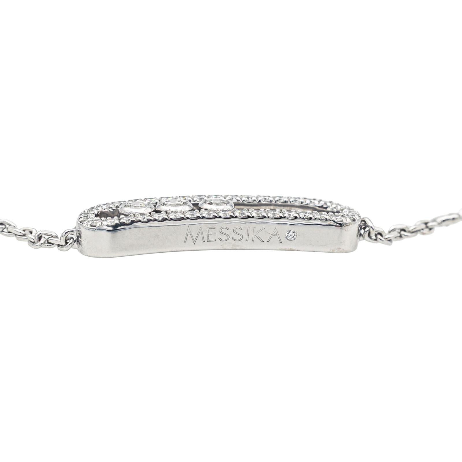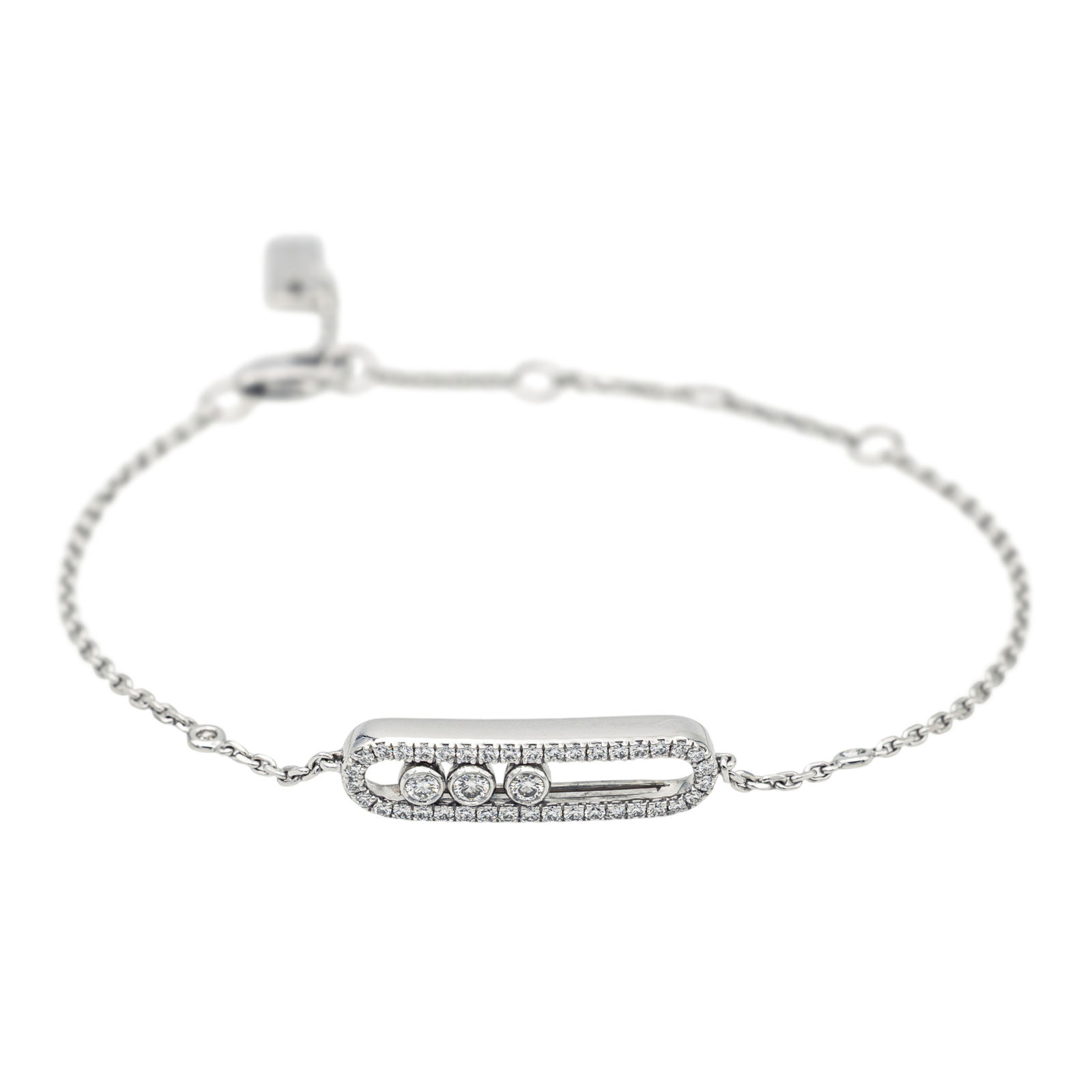 Bracelet signé de la Maison Messika en or blanc 750 millièmes (18 carats), modèle Baby Move, pavé de 46 diamants, taille brillant, enviorn G-VS, poids total des diamants : environ 0,30 ct, (3 diamants d'un poids d'environ 0,035 ct, 38 diamants d'un poids d'environ 0,005 ct et 4 diamants d'un poids d'environ 0,002 ct), maille forçat, longueur : 18,50 cm, largeur : 0,08 cm, dimension du motif : 2,00 cm x 0,50 cm, épaisseur : 0,30 cm, poids total : 3,55 g, poinçon tête d’aigle, vendu avec écrin d’origine et d’époque, numéroté : A17203, excellent état