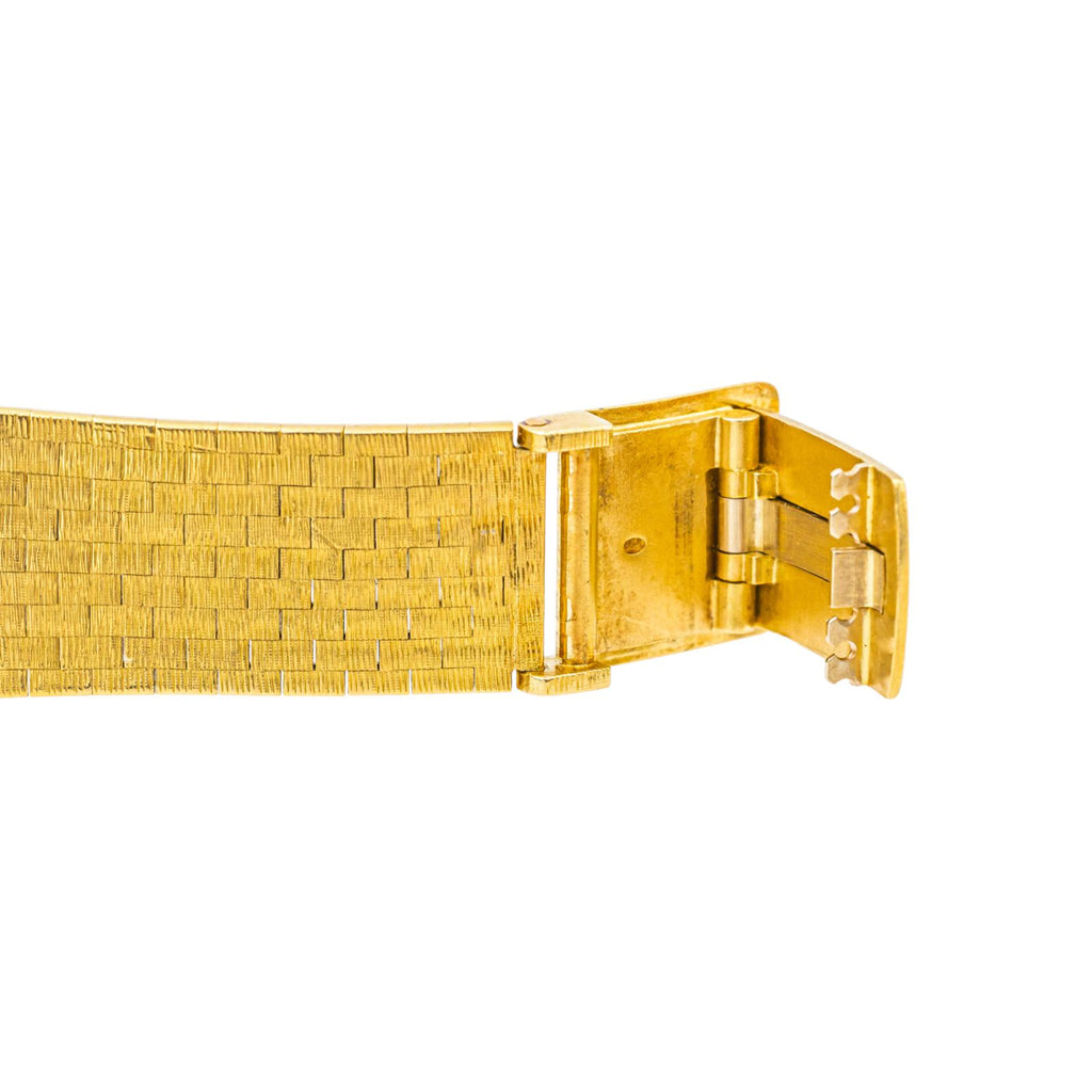 Montre Zenith/Movado modèle d'époque moderne or jaune "750 millièmes (18 carats)", cadran champagne guilloché à index bâton, mouvement mécanique à remontage manuel, boîtier 32 mm, verre minérale, 1 cabochon oeil de tigre sertie sur la couronne, bracelet or jaune à boucle à clip (taille poignet 18 cm, largeur bracelet 1,38 cm), poids total : 85,24 g, poinçon charençon et hibou, années 70, révision complète et garantie 1 an, excellent état