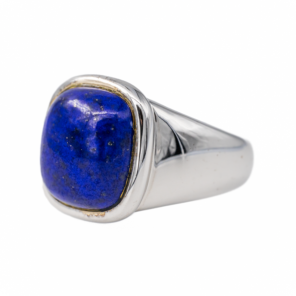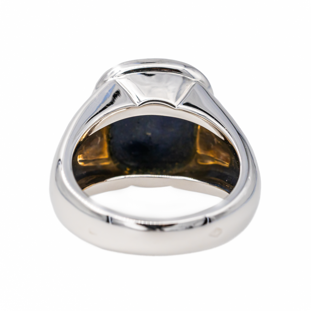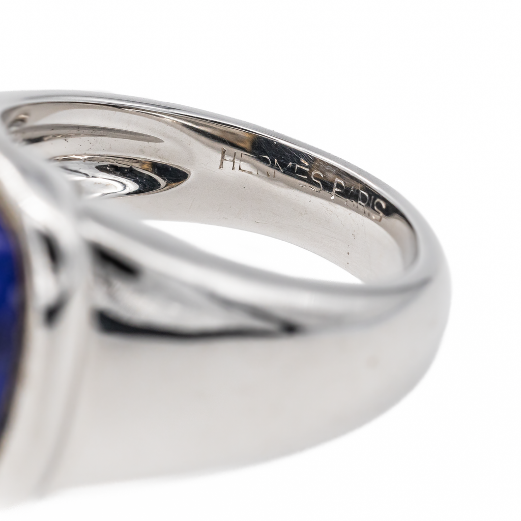 Bague signée de la Maison Hermès, en or blanc 750 millièmes (18 carats), modèle Birmanie GM, années 90', sertie d'un lapis lazuli, taille cabochon, d'un poids total d'environ 7,11 cts, largeur sur le dessus : 0,8 cm, tour de doigt : 53, poids total : 13,45 g, poinçon tête d'aigle, excellent état