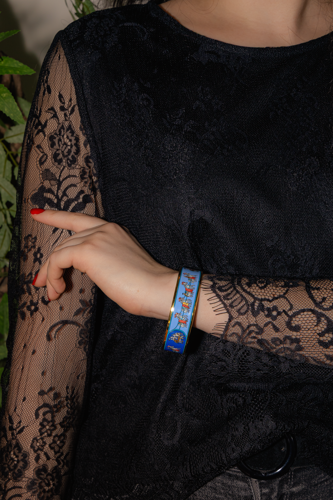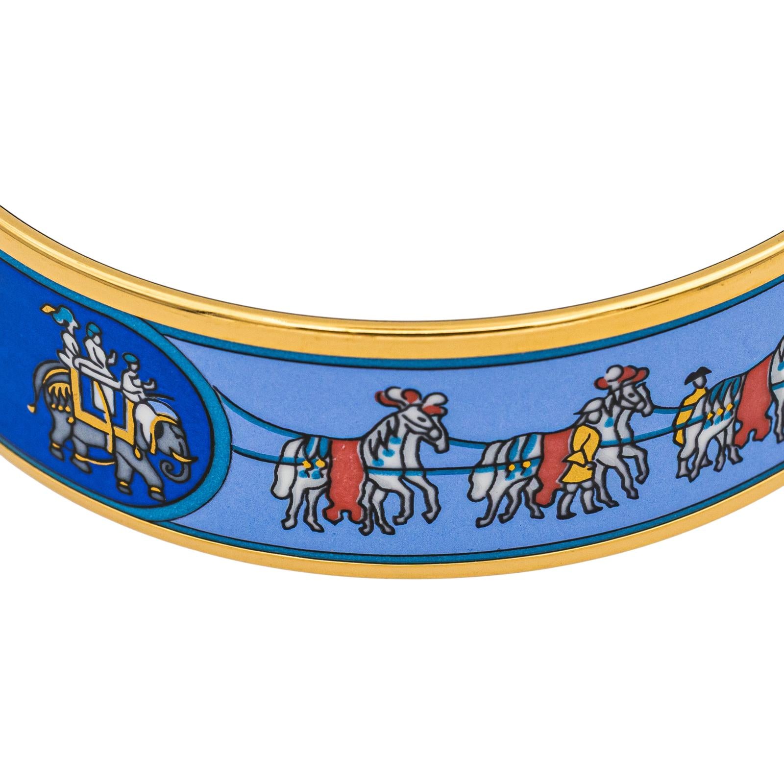 Bracelet signé de la maison Hermès, finition plaqué or jaune, motif en émail, diamètre: 7 cm, largeur: 2 cm, poids total: 41,42 g, excellent état