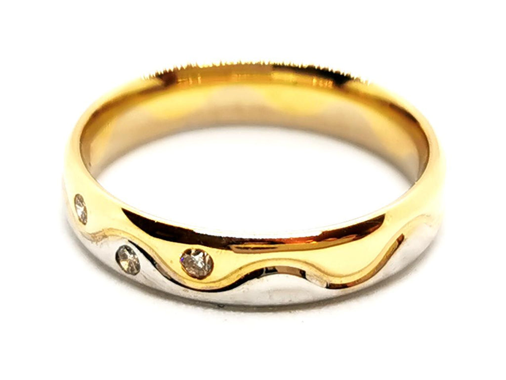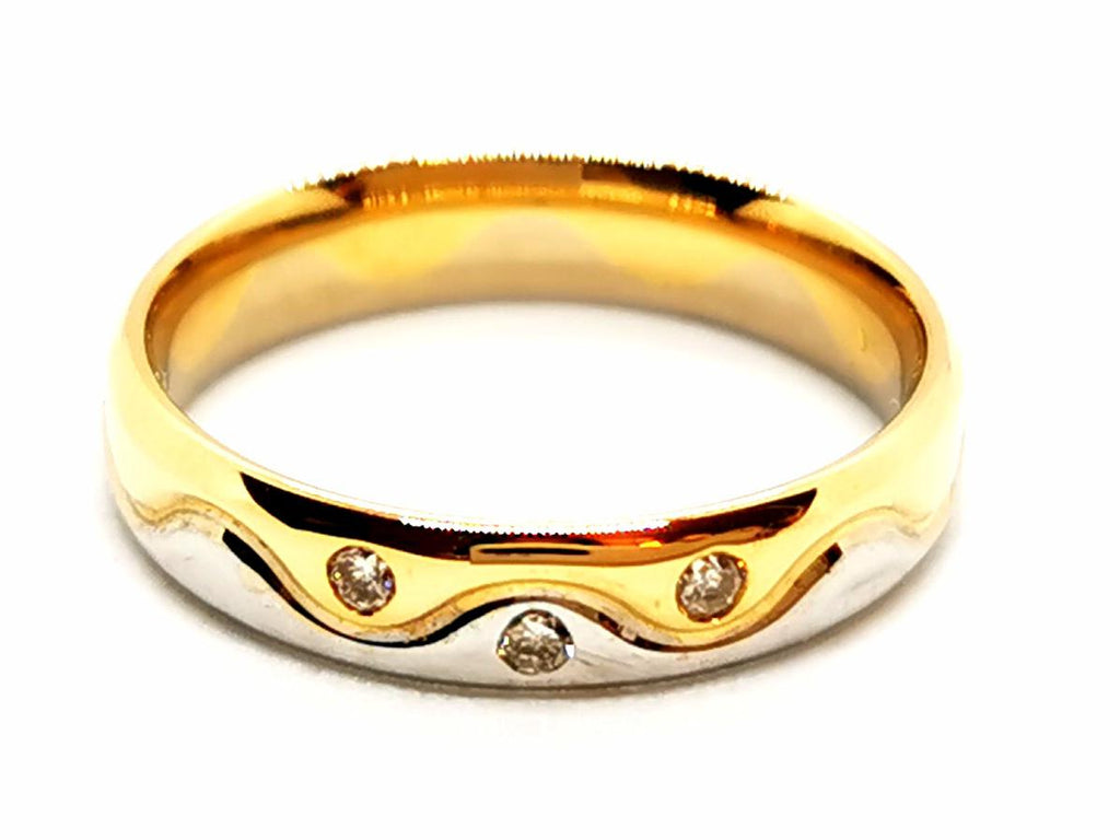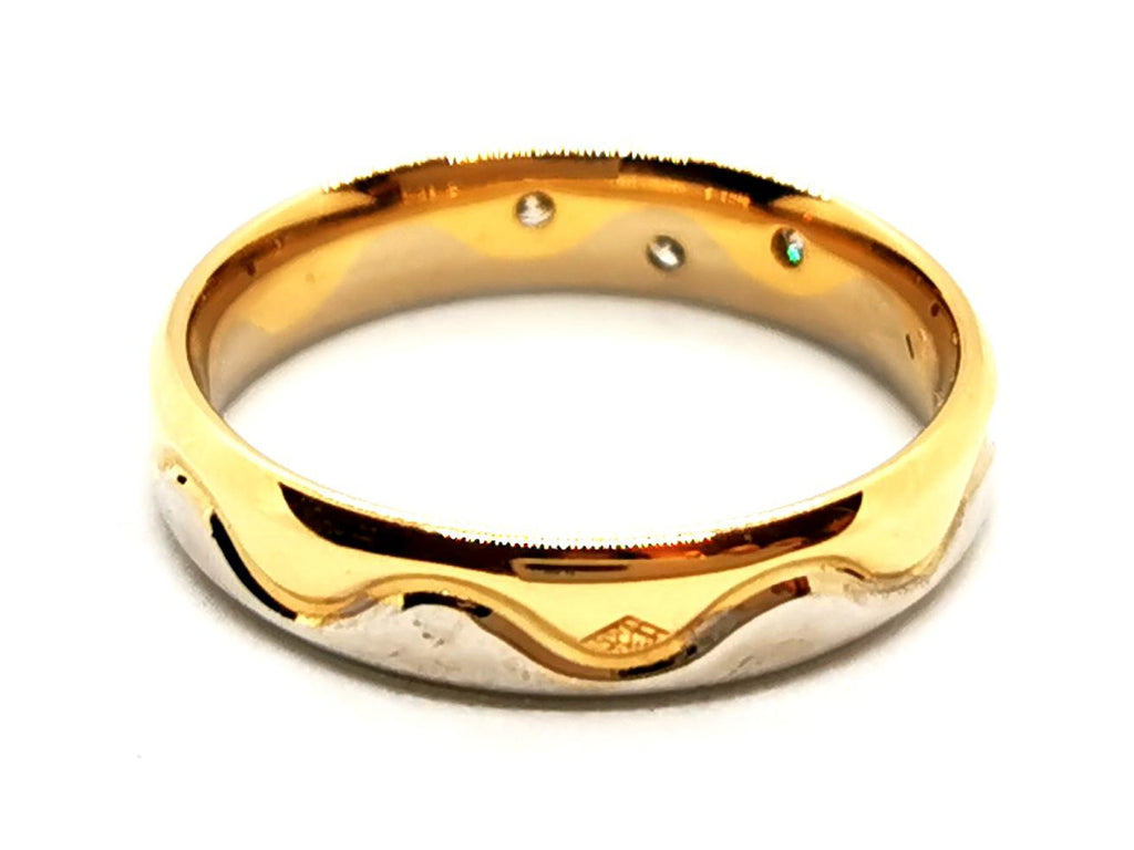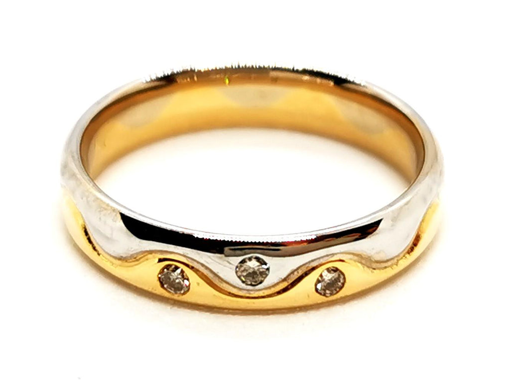 Wedding ring in 750 thousandths (18 carat) yellow and white gold bezel set with 3 brilliant-cut H-SI diamonds of approximately 0.01 ct each, total diamond weight: 0.03 ct, size: 49.5, width: 0 .38 cm, eagle head hallmark, excellent condition, Internet exclusive