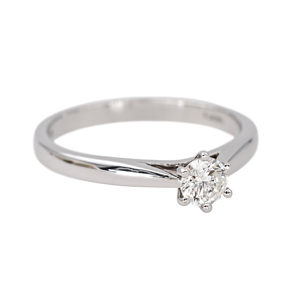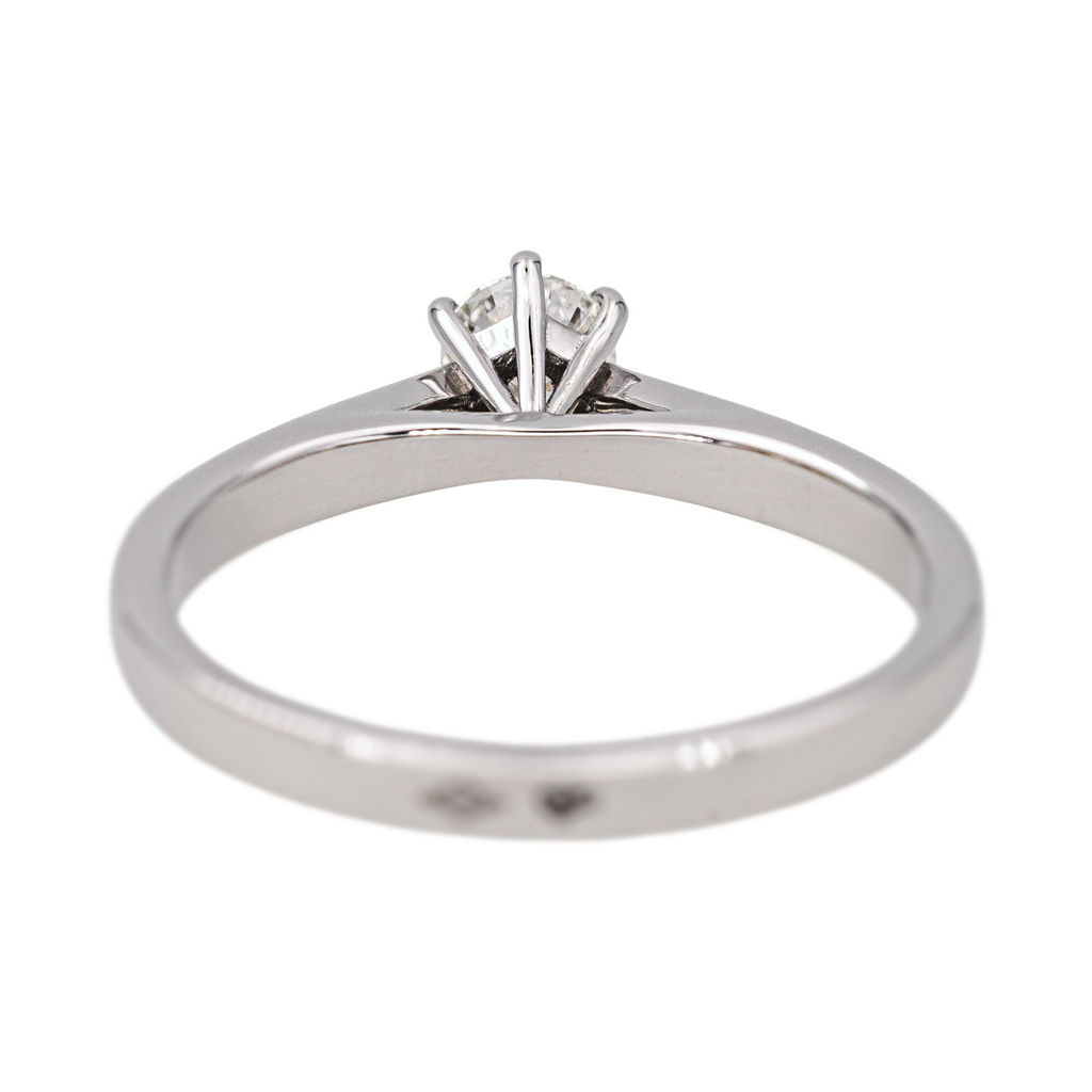 Bague solitaire signée de la Maison Mauboussin en or blanc 750 millièmes (18 carats), modèle Solitaire Six de Toi, sertie d’un diamant taille brillant environ H-SI, d'un poids total d’environ 0,28 ct, largeur sur le dessus : 0,53 cm, tour de doigt : 53, poids total : 3,11 g, poinçon tête d'aigle, numérotée : FJ4385, excellent état