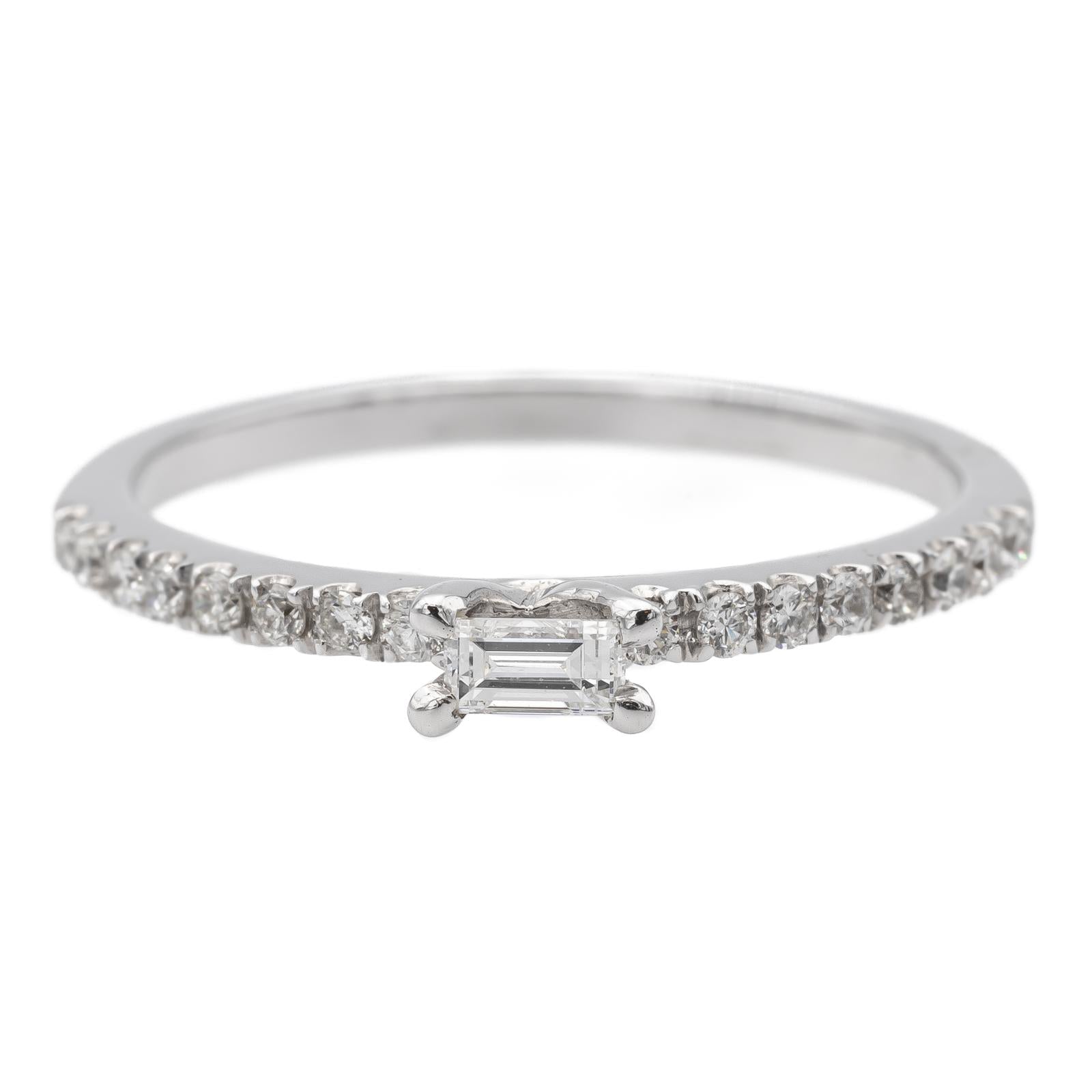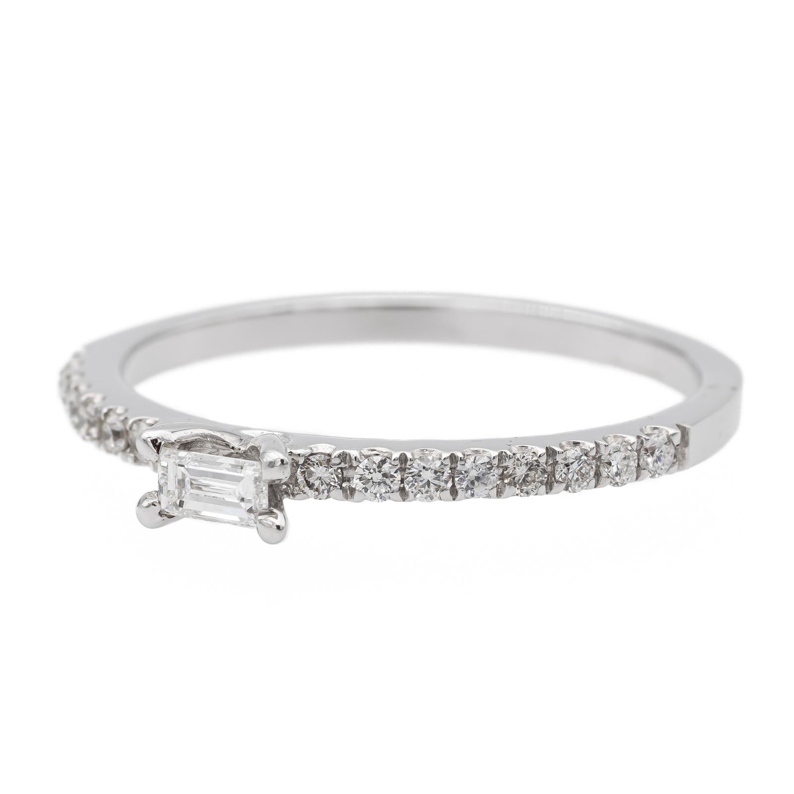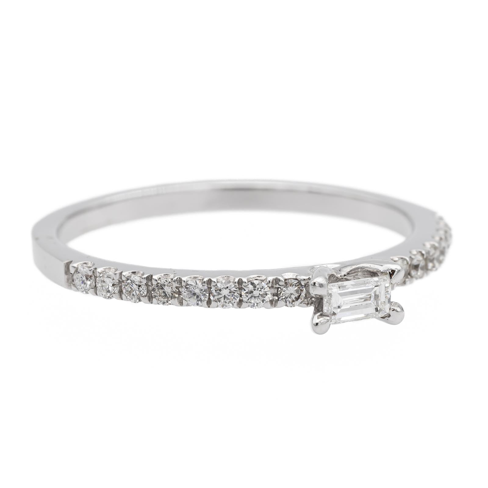 Solitaire in 750 thousandths (18 carat) white gold, set with EF VVS diamonds for a total of 0.28 ct, Emerald-cut central diamond of approximately 0.12 ct (3.4 mm x 1.8 mm) and shouldered with 16 brilliant-cut diamonds for approximately 0.16 ct in total, ring size: 53, width of the ring: 0.14 cm, total weight: 1.78 g, eagle's head hallmark, new condition, Visible in Marseille