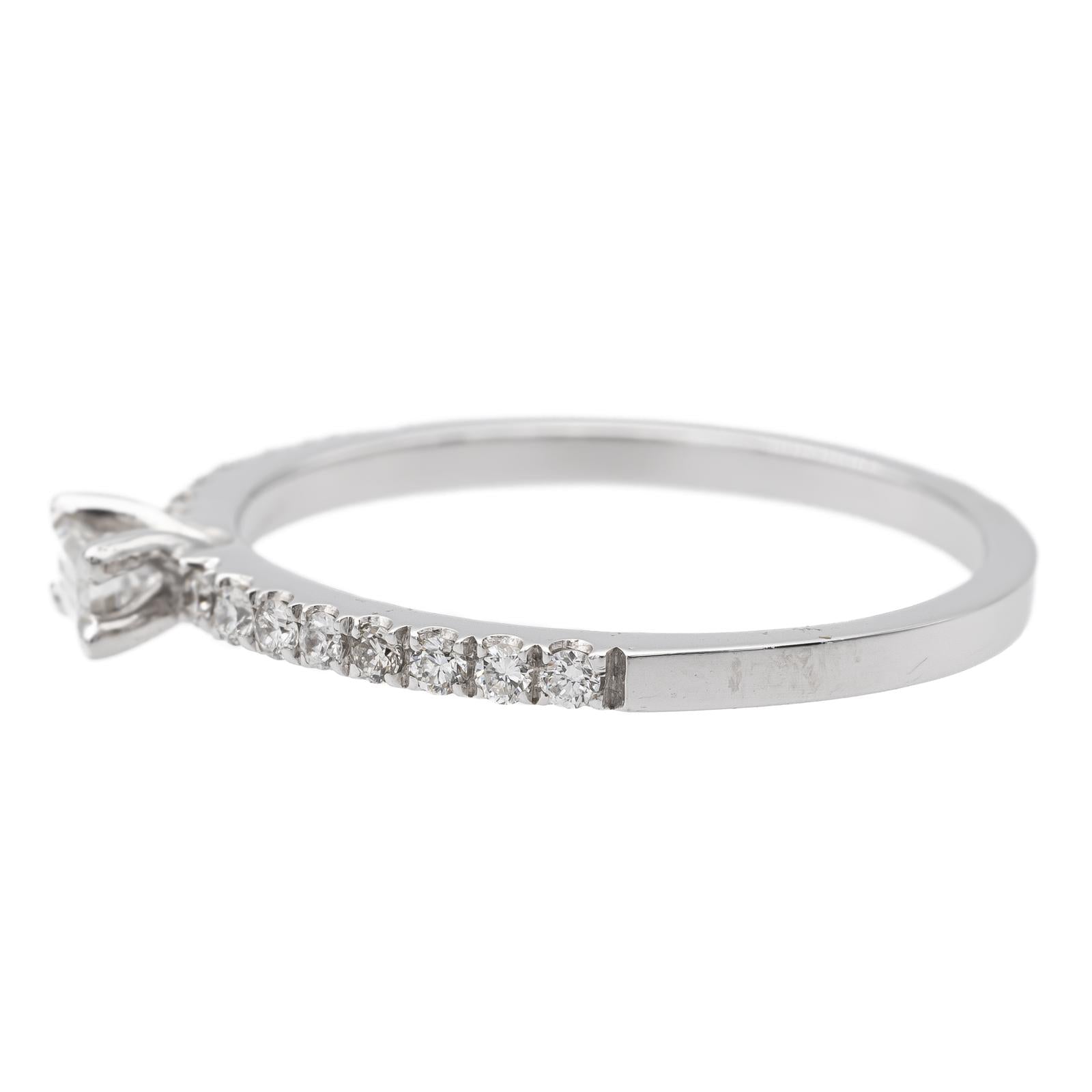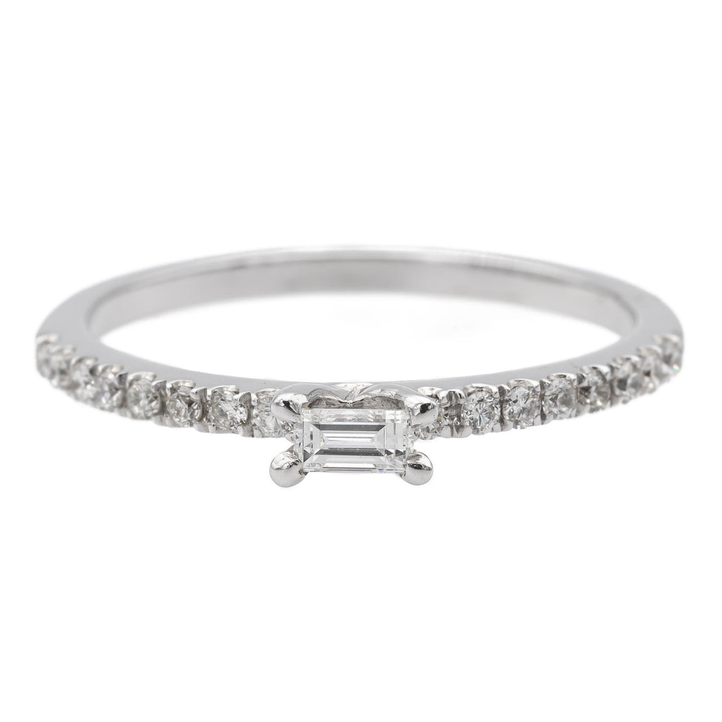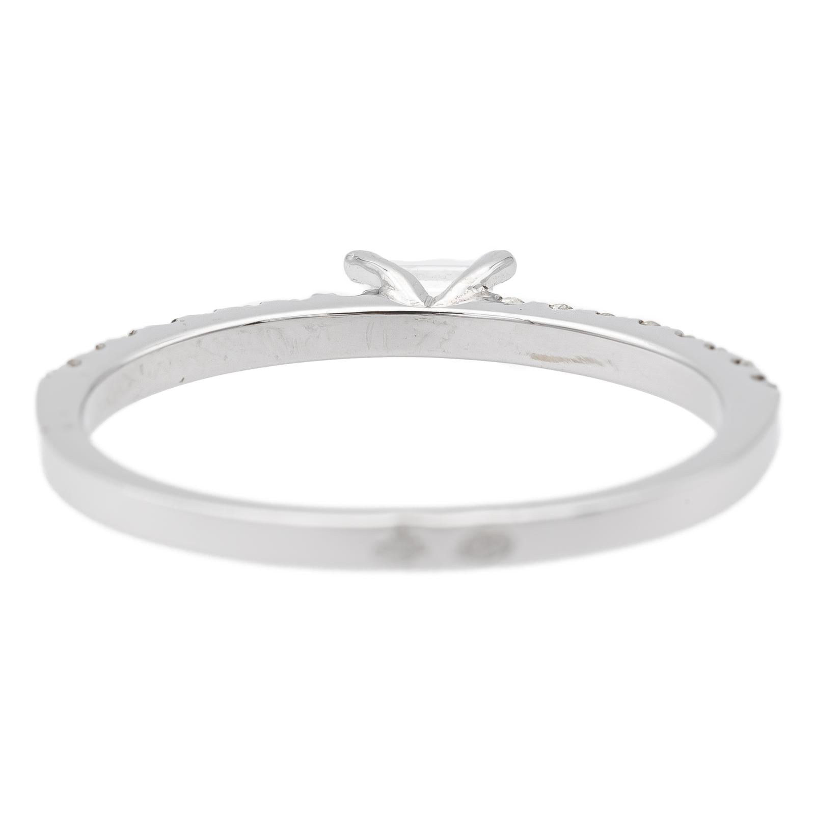 Solitaire in 750 thousandths (18 carat) white gold, set with EF VVS diamonds for a total of 0.28 ct, Emerald-cut central diamond of approximately 0.12 ct (3.4 mm x 1.8 mm) and shouldered with 16 brilliant-cut diamonds for approximately 0.16 ct in total, ring size: 53, width of the ring: 0.14 cm, total weight: 1.78 g, eagle's head hallmark, new condition, Visible in Marseille