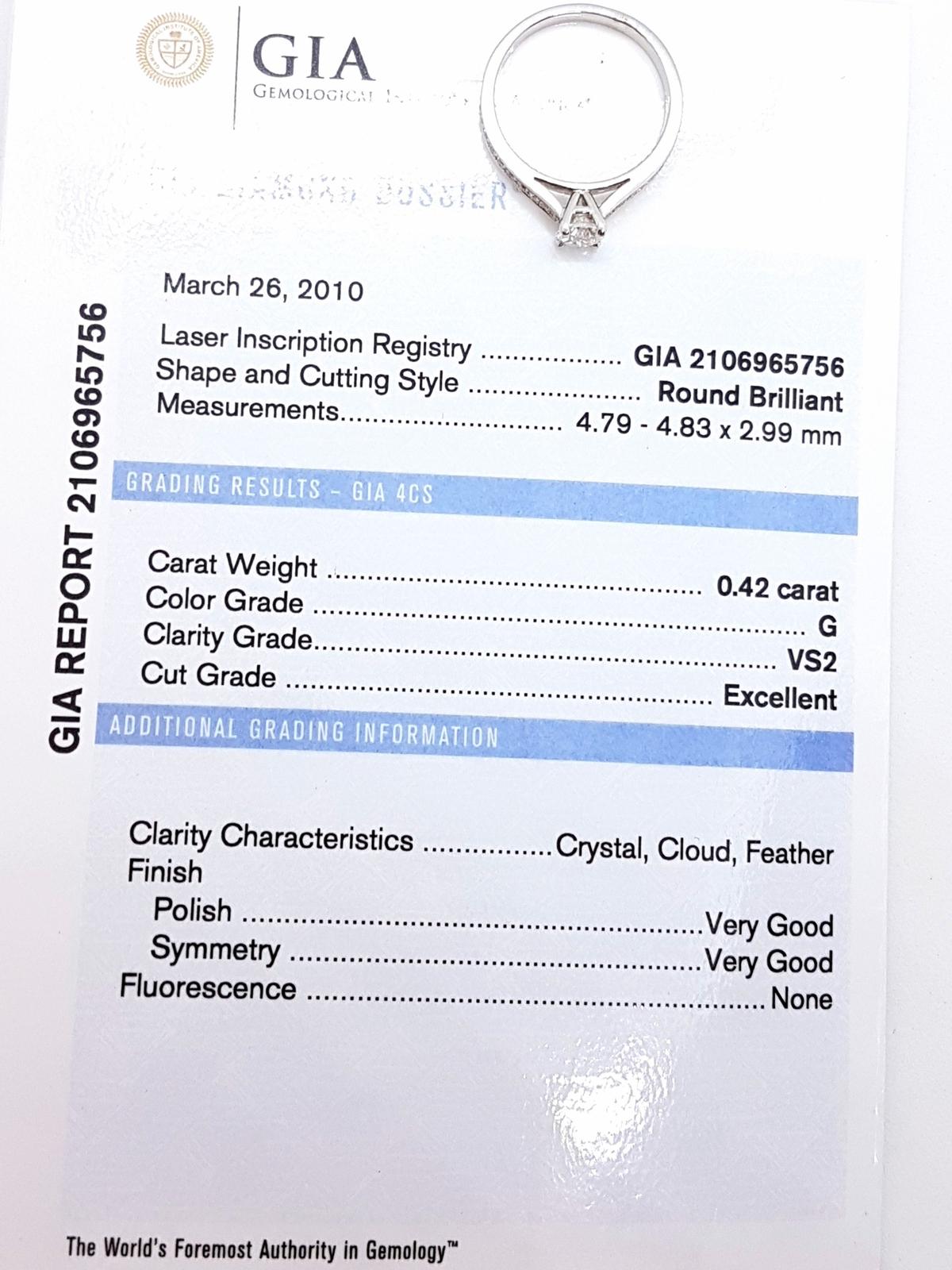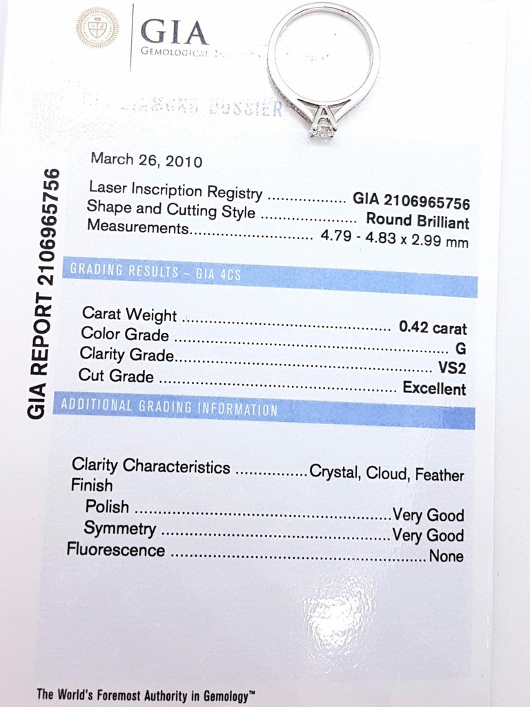 Solitaire in 750 thousandths (18 carat) white gold, set with brilliant-cut G-VS2 diamonds for a total of 0.61 carats, including a 0.42 ct GIA-certified central diamond, brilliant-cut G-VS2 and supported by 20 brilliant-cut diamonds for 0.19 ct in total, finger circumference: 53, width on top: 0.48 cm, band width: 0.20 cm, total weight: 2.67 g, eagle's head hallmark, mint condition , Visible in Nice