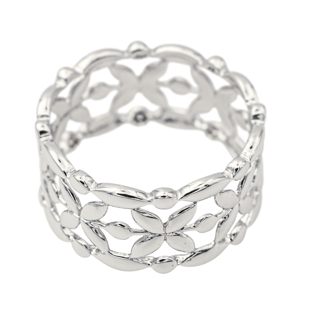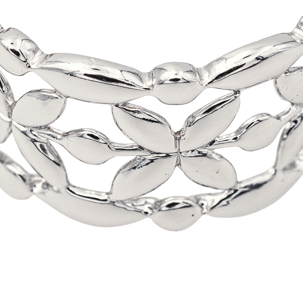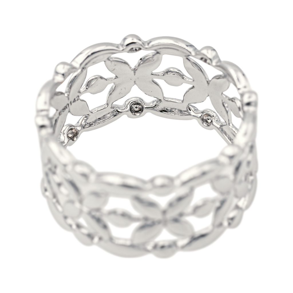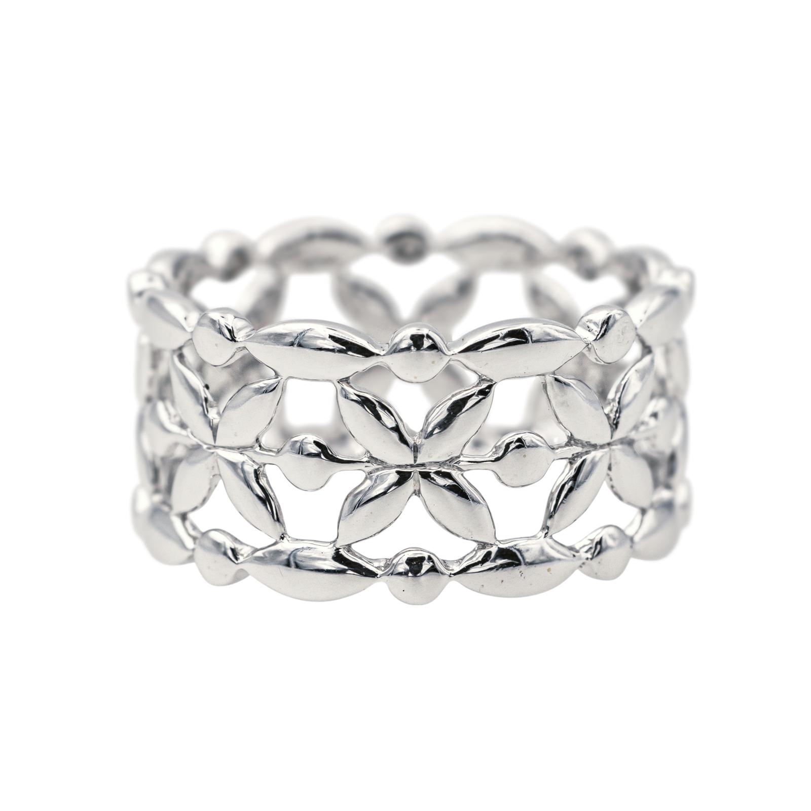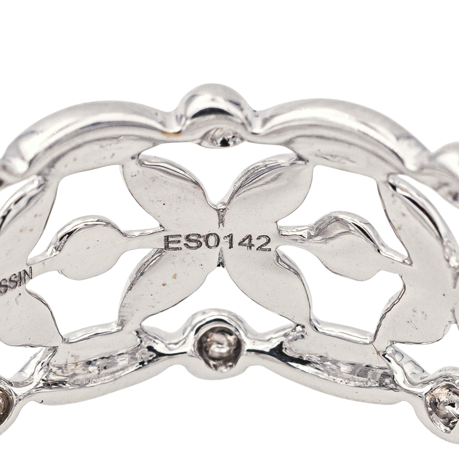 Bague bandeau signée de la maison Mauboussin en or blanc 750 millièmes (18 carats) à motif floral, largeur : 1,00 cm, tour de doigt : 54, poids total : 4,25g, poinçon tête d'aigle, excellent état