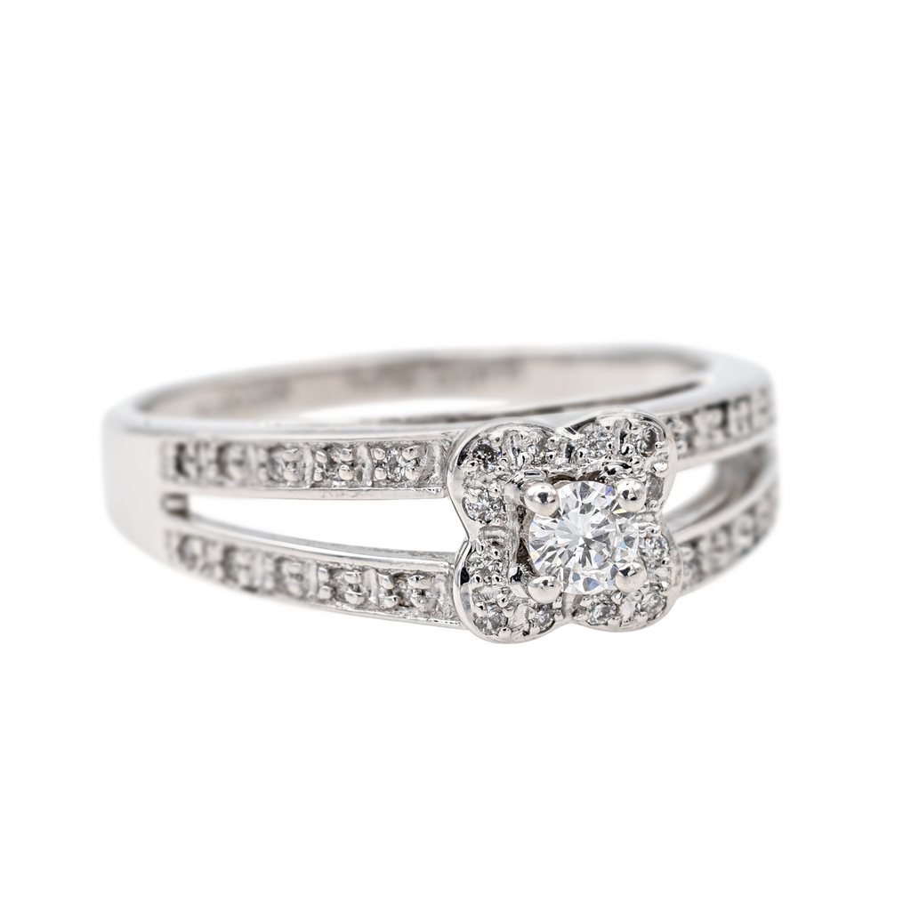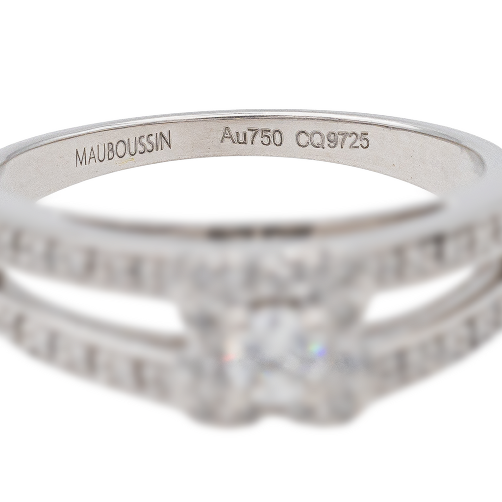 Bague signée de la Maison Mauboussin en or blanc 750 millièmes (18 carats), modèle Chance of Love N°1, sertie de 33 diamants taille brillant, environ H-SI, d'un poids total d'environ 0,24 ct, (un diamant d'un poids d'environ 0,08 ct et 32 diamants d'un poids d'environ 0,005 ct), largeur sur le dessus : 0,57 cm, tour de doigt : 47, poids total : 3.04 g, poinçon tête d'aigle, numérotée : CQ9725, excellent état