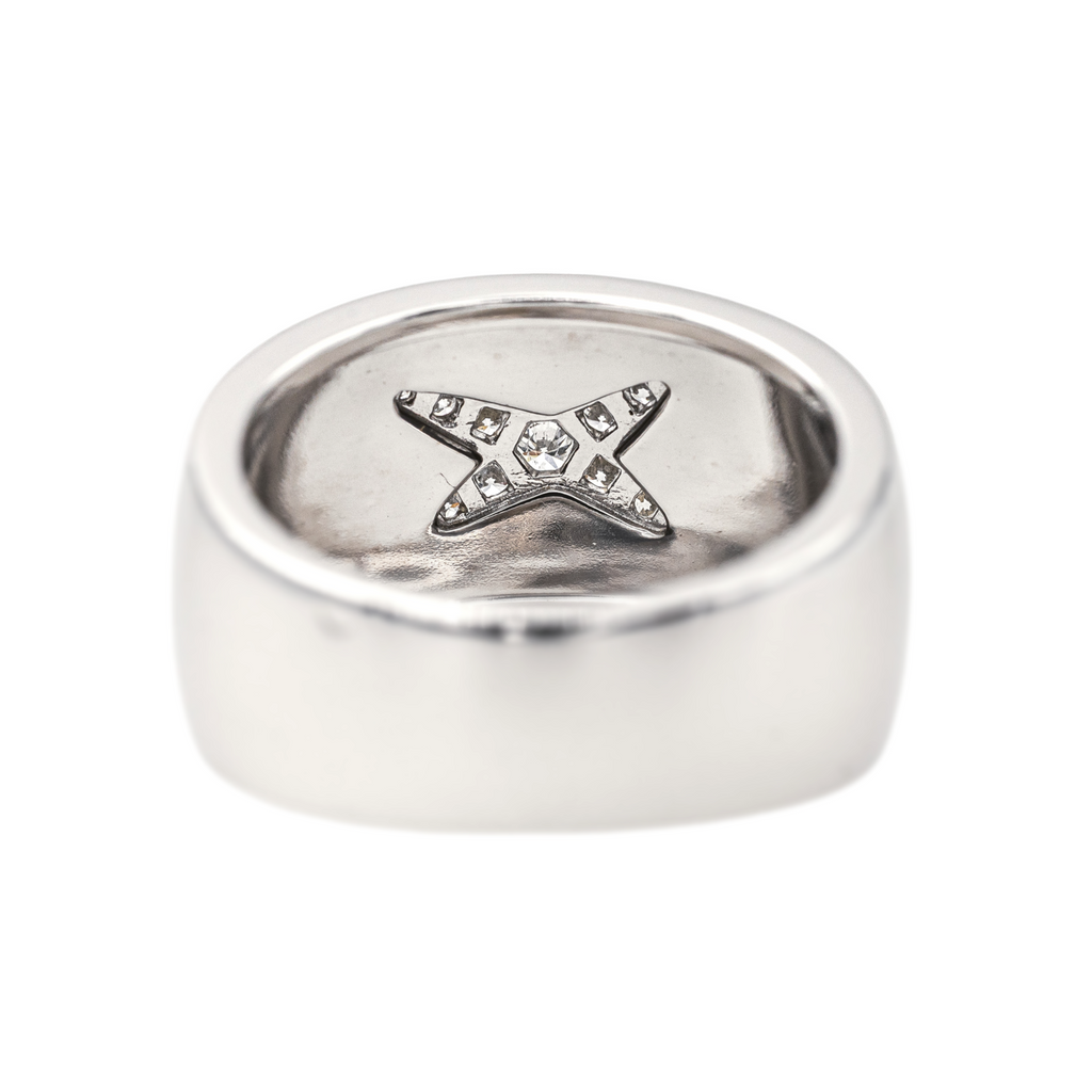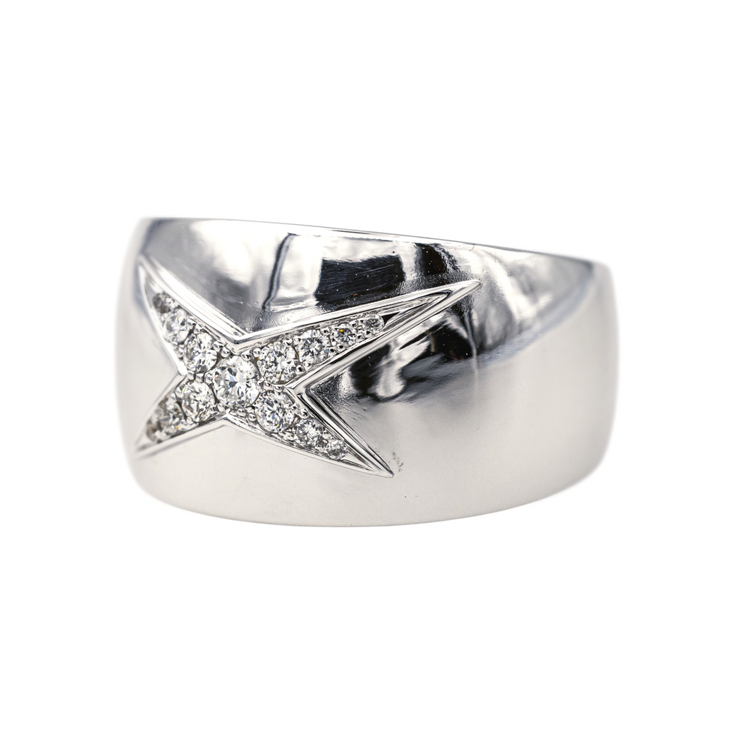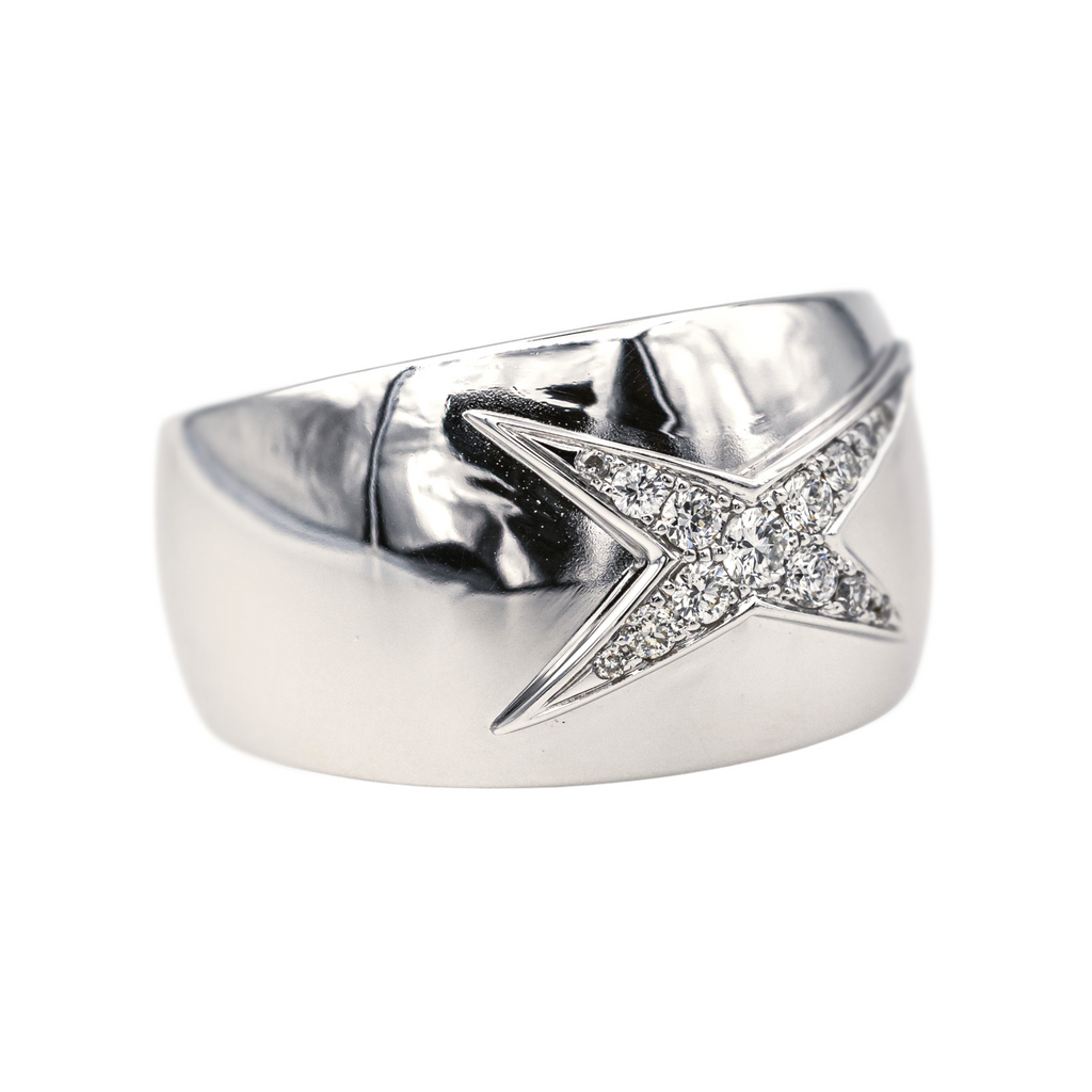 Bague signée de la Maison Mauboussin en or blanc 750 millièmes (18 carats), modèle Etoile divine, pavée de diamants, 14 diamants taille brillant, environ H-VS, d'un poids total d'environ 0,2 ct(s), (chaque diamant d'un poids d'environ 0,05 ct à 0,002 ct), largeur sur le dessus : 1,28 cm, tour de doigt : 55, poids total : 7,58 g, poinçon tête d'aigle, numérotée : AR4463, excellent état