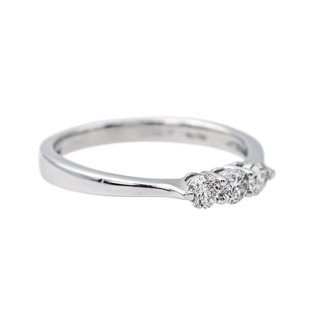 Alliance signée de la Maison Mauboussin en or blanc 750 millièmes (18 carats), modèle l'Alliance du Nouveau Monde, sertie de 3 diamants taille brillant environ H-SI, d'environ 0,10 ct chacun, poids total diamants : environ 0,30 ct, largeur sur le dessus : 0,31 cm, tour de doigt : 54, poids total : 2,82 g, poinçon tête d'aigle, numérotée : EL0642, excellent état