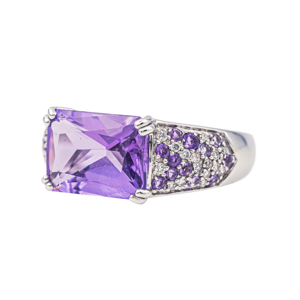 Bague signée de la Maison Mauboussin en or blanc 750 millièmes (18 carats) testé, modèle Ma princesse d'amour, sertie d'améthystes et de diamants, 1 améthyste taille rectangle, d'un poids total d'environ 4,21 cts, entourée de 24 améthystes taillée en rond, d'un poids total d'environ 0,48 ct, (chaque améthyste d'un poids d'environ 0,02 ct), 30 diamants taille brillant, environ H/VS, d'un poids total d'environ 0,21 ct, (chaque diamant d'un poids d'environ 0,007 ct(s)), poids total diamants environ : 0,21 ct, largeur sur le dessus : 0,80 cm, tour de doigt : 56, poids total : 6,46 g, numérotée : AI9368, poinçon hibou, excellent état