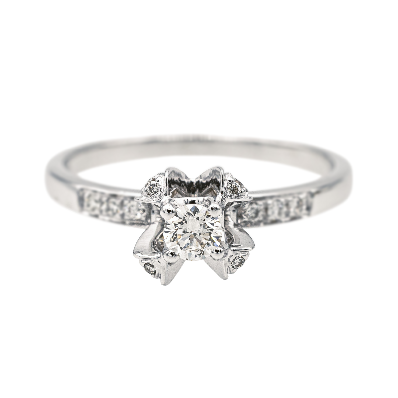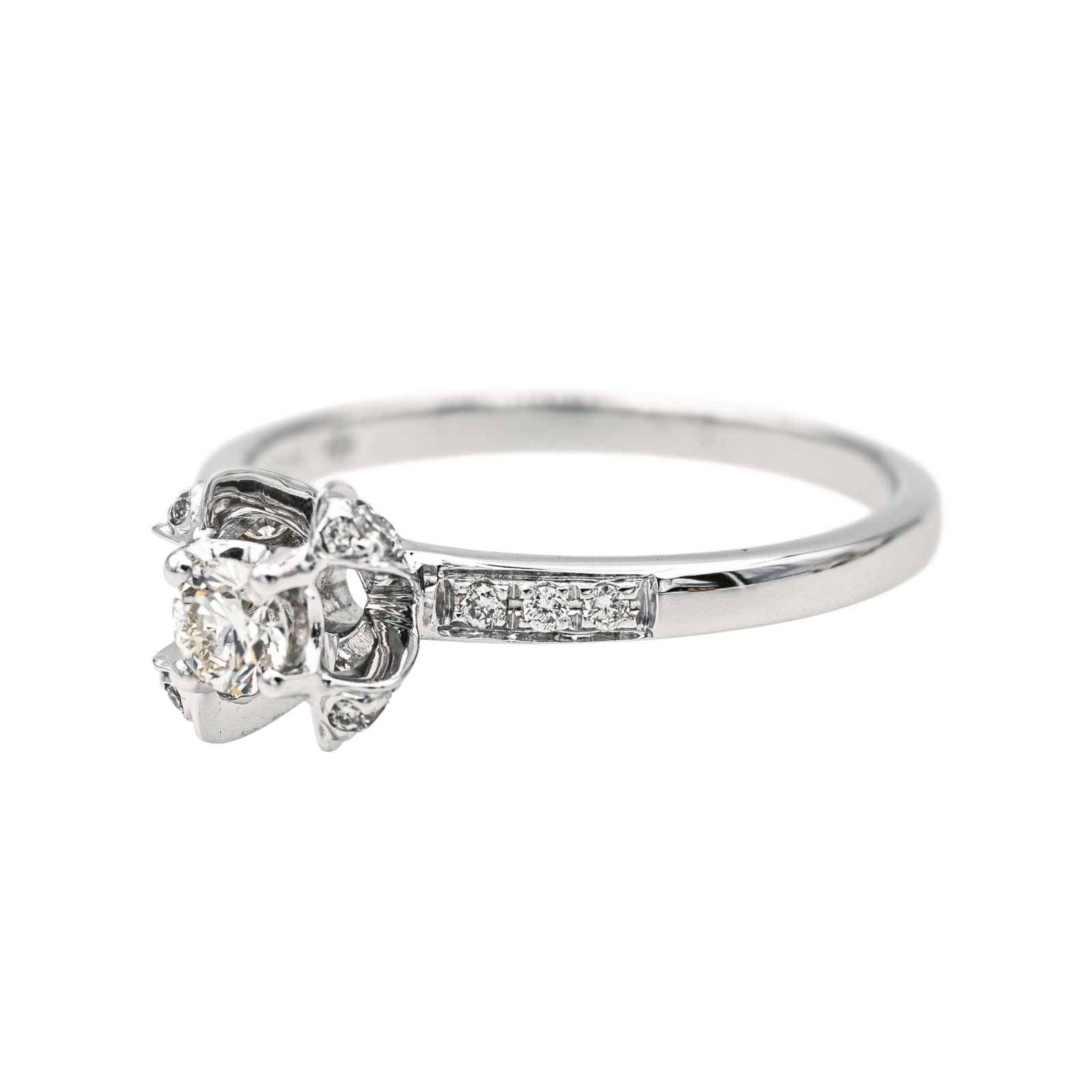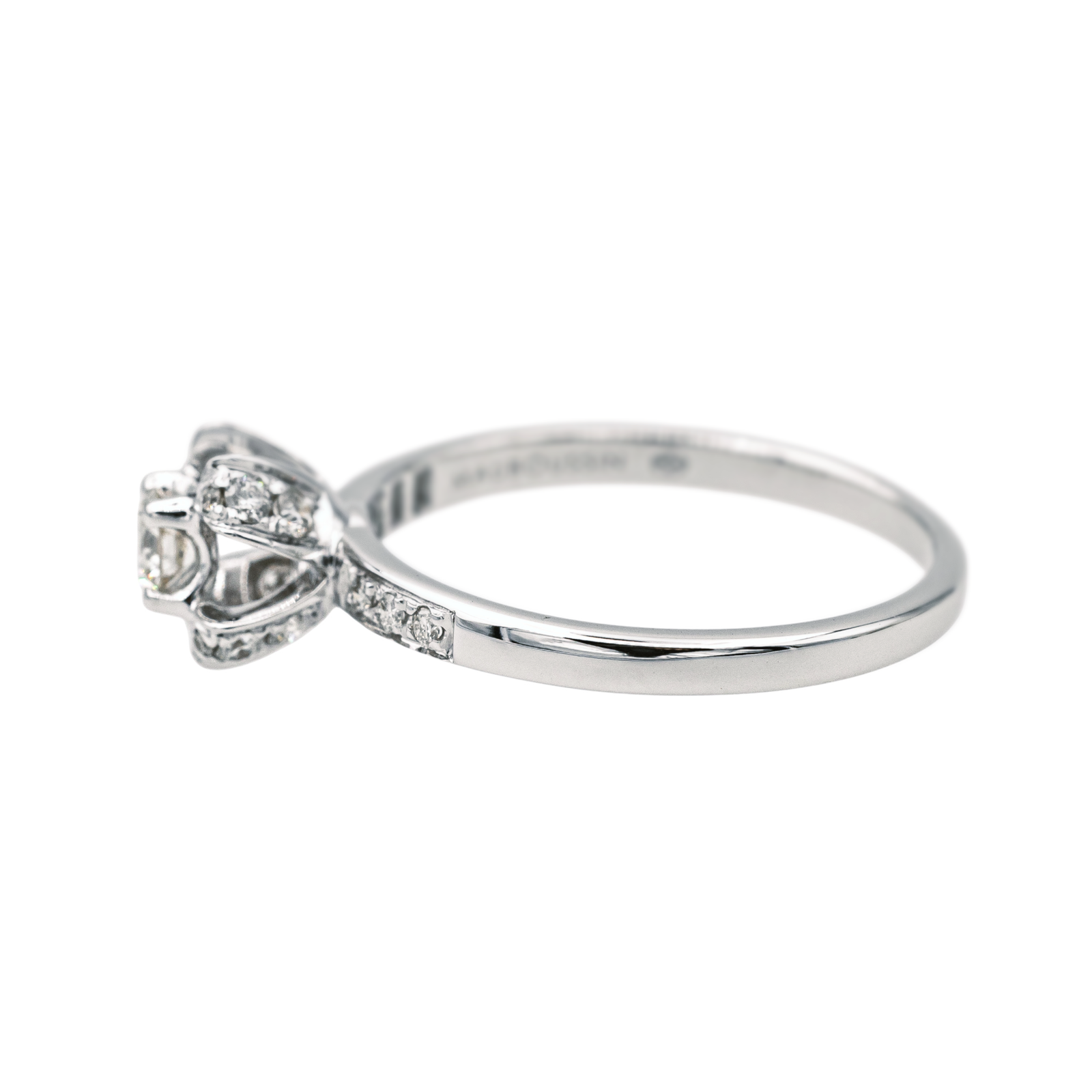 Bague solitaire signée de la Maison Mauboussin en or blanc 750 millièmes (18 carats), modèle Sacré Désir N°2, sertie de 19 diamants taille brillant, environ H-VS, d'un poids total d'environ 0,24 ct, (un diamant d'un poids d'environ 0,15 ct, et 18 diamants d'un poids d'environ 0,005 ct), largeur sur le dessus : 0,72 cm, tour de doigt : 54, poids total : 2,59 g, numérotée : FC4028, poinçon tête d'aigle, excellent état