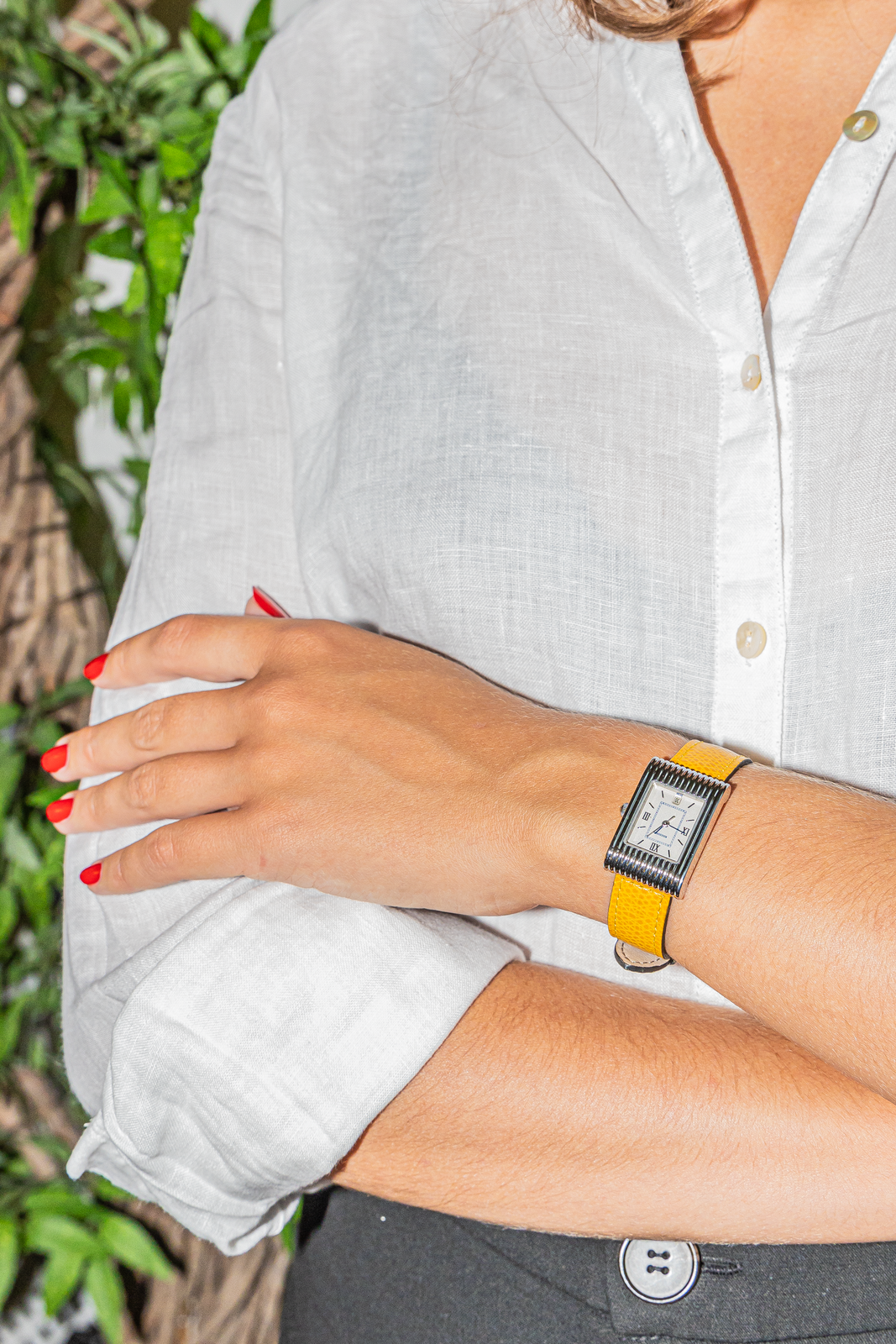 Montre Boucheron modèle Reflet acier, n°série AD70084, cadran argent à chiffres romains, mouvement à quartz, boitier 31,90 x 21 mm, verre saphir, bracelet cuir d'origine à boucle ardillon (taille poignet 20 cm ajustables, largeur bracelet 1,52cm), poids total : 25,59 g, papier d'origine, année 1995, Excellent état