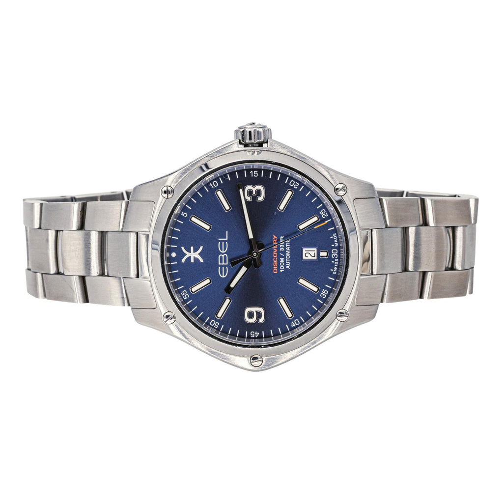 Montre Ebel modèle Discovery 1216458 en acier, n°série 24195353, cadran bleu à chiffres arabes, mouvement mécanique à remontage automatique, boîtier 41 mm, verre saphir, bracelet en acier boucle papillon (taille poignet 18,00 cm, largeur bracelet 1,96 à 1,79 cm en chute), poids total : 147,06 g, full set (boite et papier d'origine), année 2015, révision complète et garantie 1 an, excellent état vendue avec maillon supplémentaire