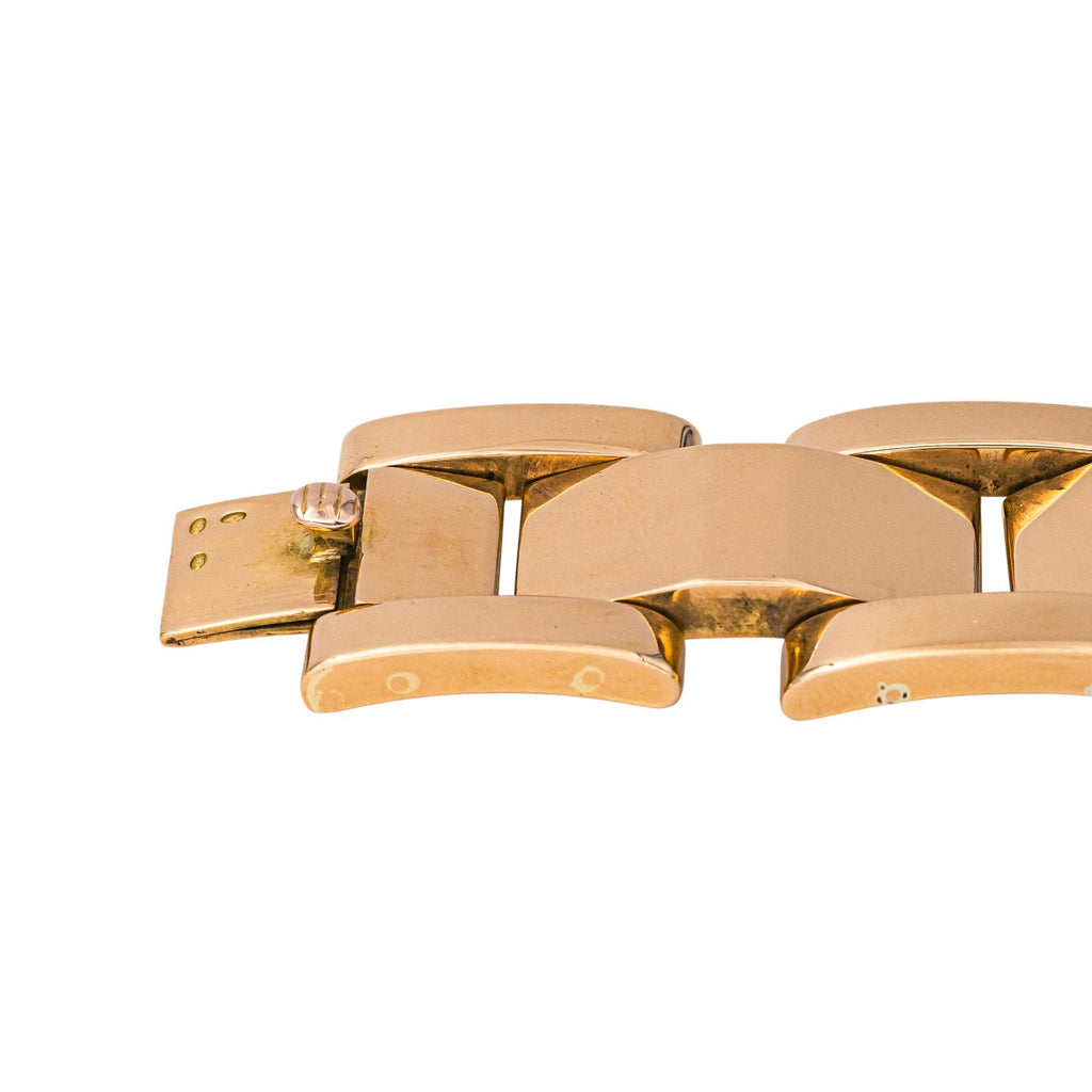 Montre Rolex en or rose 750 millièmes (18 carats), cadran champagne à chiffres arabes en partie effacé, mouvement mécanique à remontage manuel boîtier 28 mm, verre minérale, bracelet or rose à languette et huit de sécurité (taille poignet 19,50 cm, largeur bracelet 2,00 cm), poids total : 85,88 g, années 1950, révision complète et garantie 1 an, bon état