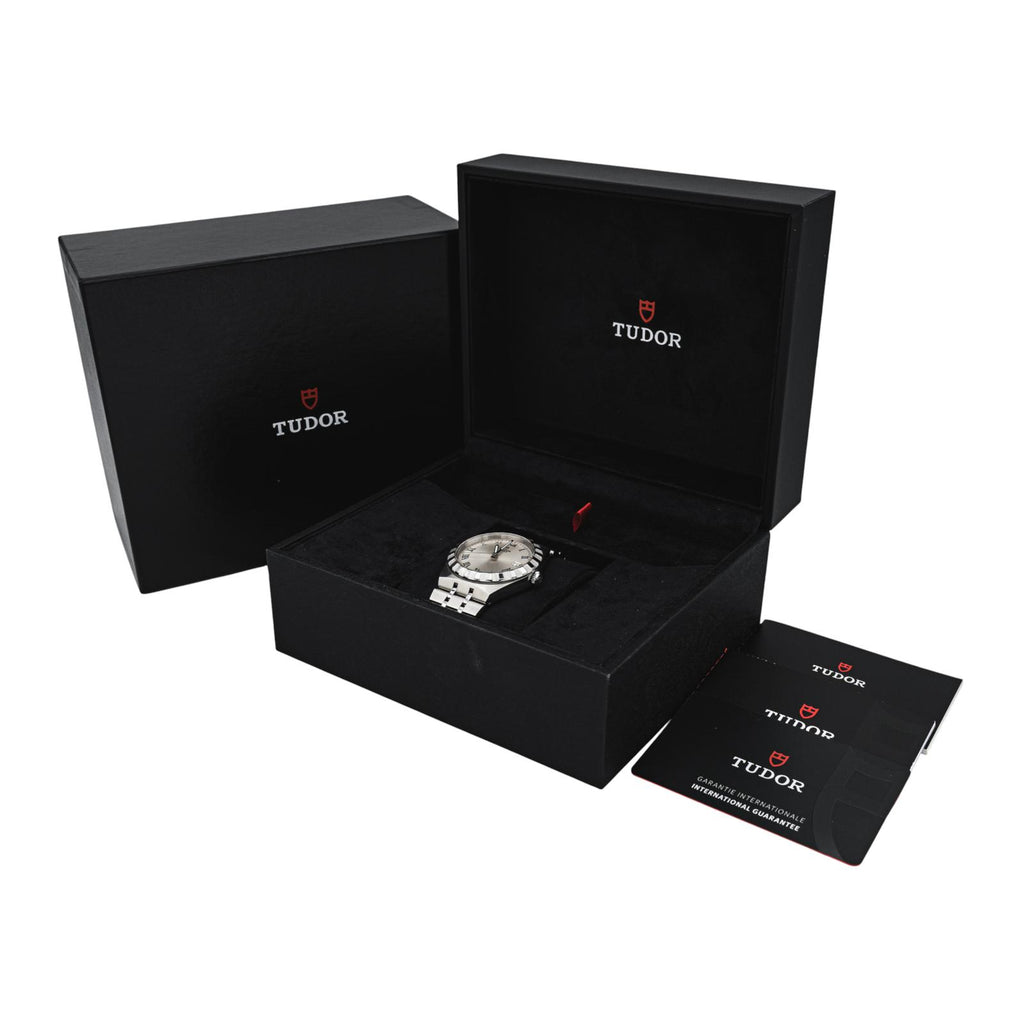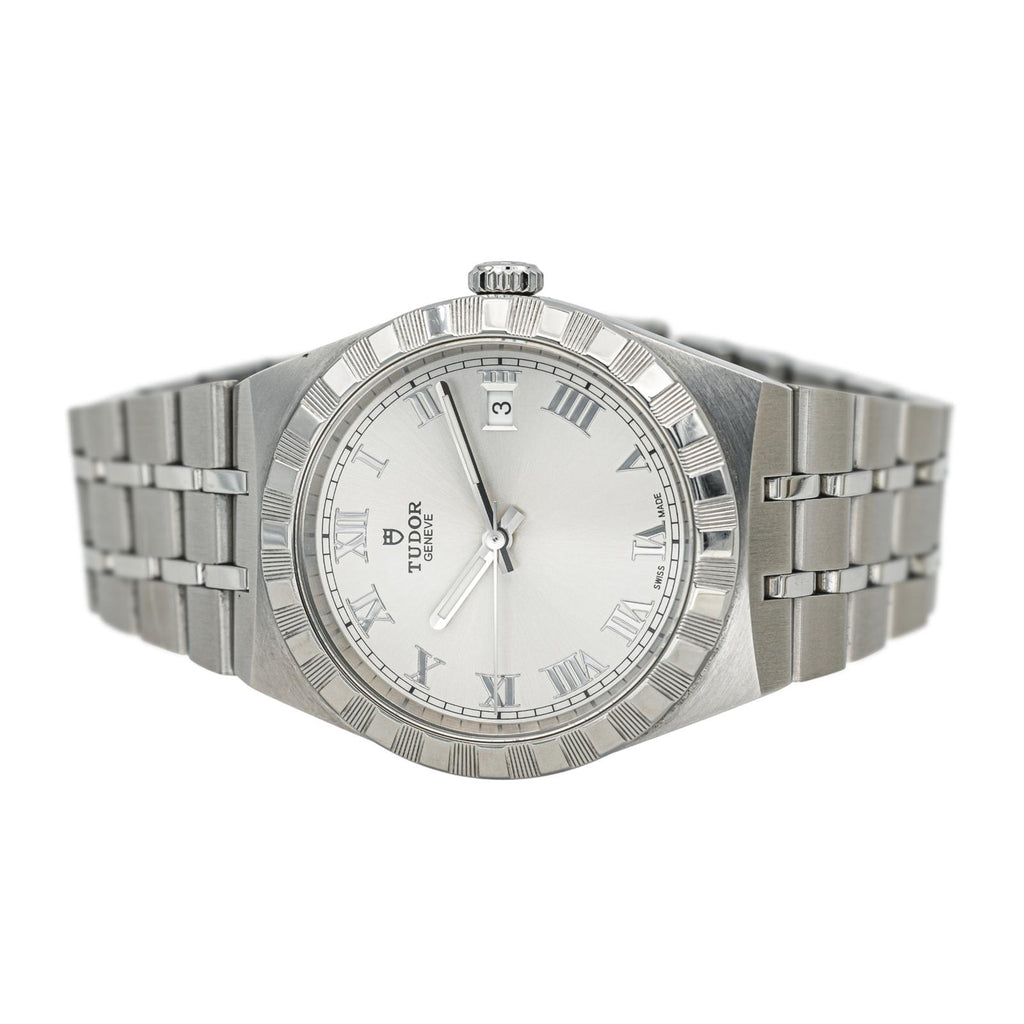 Montre signée de la Maison Tudor, modèle Royal en acier, réf 28500, n°série Q369316, cadran silver à chiffres romains, mouvement mécanique à remontage automatique, boîtier 38 mm, verre saphir, bracelet acier boucle déployante (taille poignet 21 cm, largeur bracelet 23,00 cm), poids total : 130,42 g, full set (boite et papier d'origine), année 2021, révision complète et garantie 1 an, excellent état