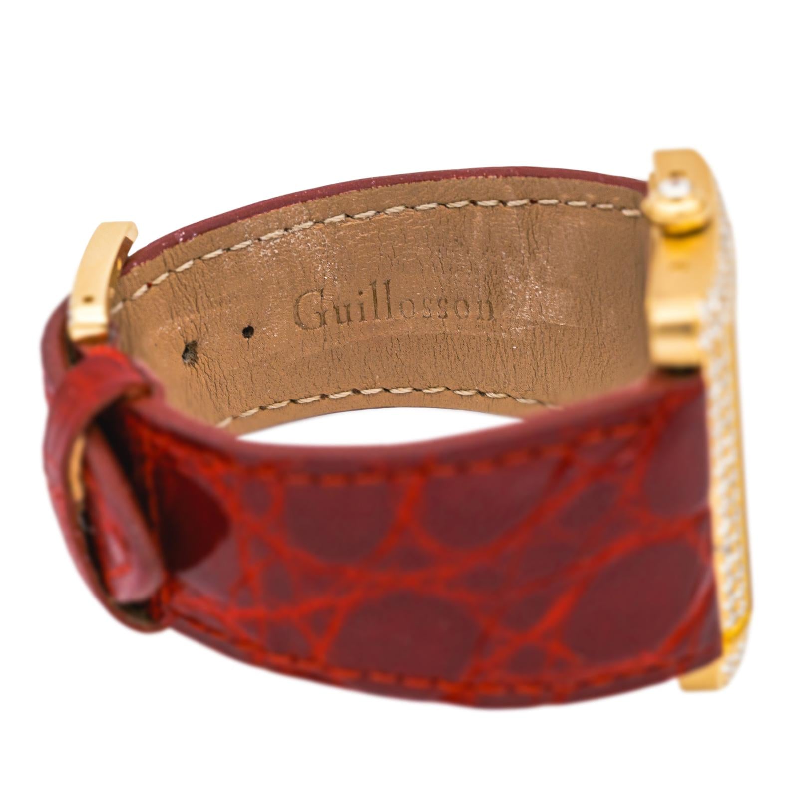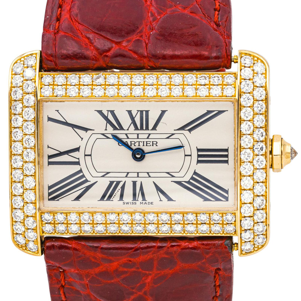 Montre Cartier modèle Tank Divan en or jaune 750 millièmes (18 carats), sertie de 118 diamants taille brillant H/VS, Poids total estimé des diamants : 2,88 cts, n°série 2602284620CE, cadran blanc à chiffres romains, mouvement quartz, boîtier 38 mm, verre saphir, bracelet cuir, boucle ardillon, taille poignet 18,5 cm, poids total : 70,01 g, full set (boite et papier d'origine), année 2004, poinçon Saint Bernard, révision complète et garantie 1 an, excellent état
