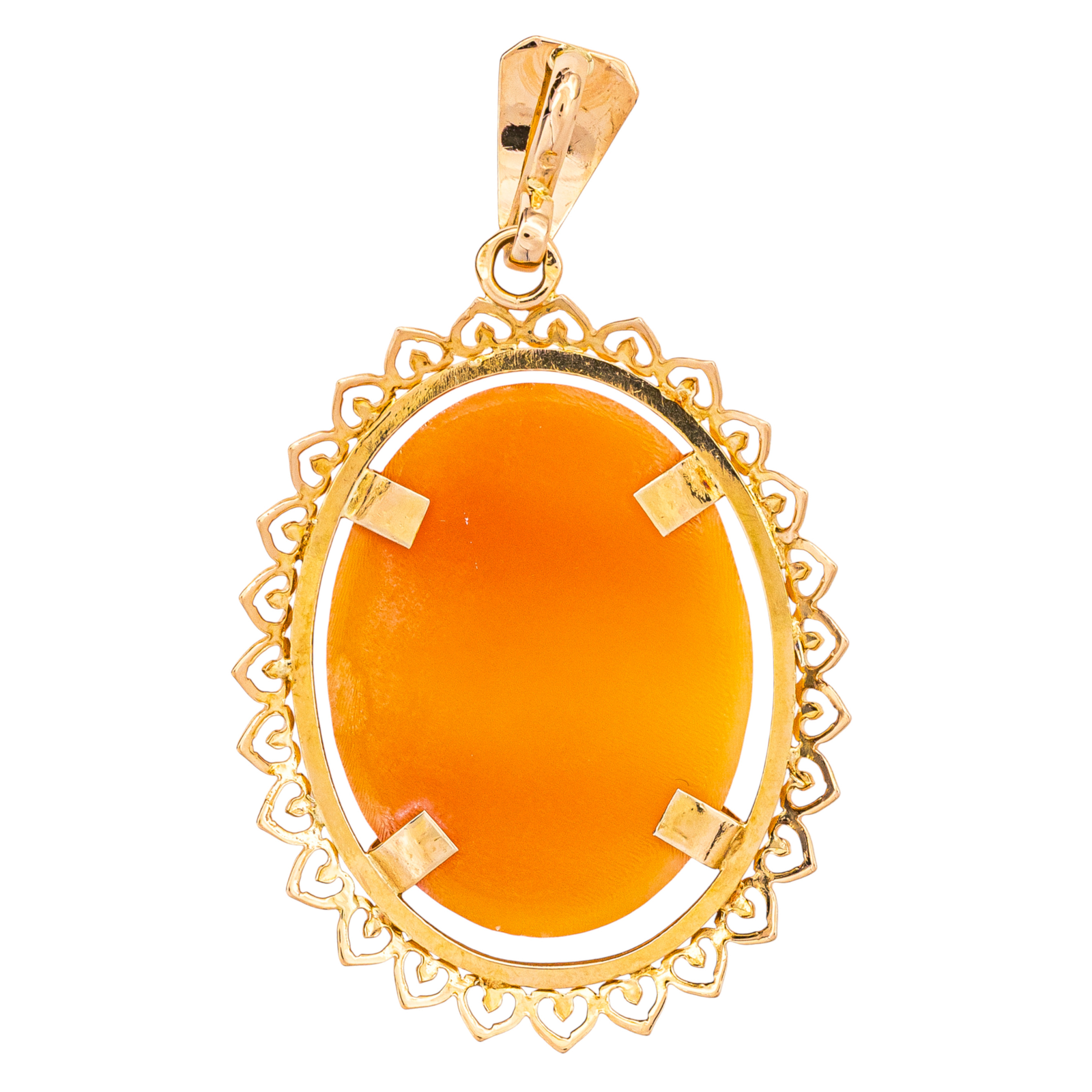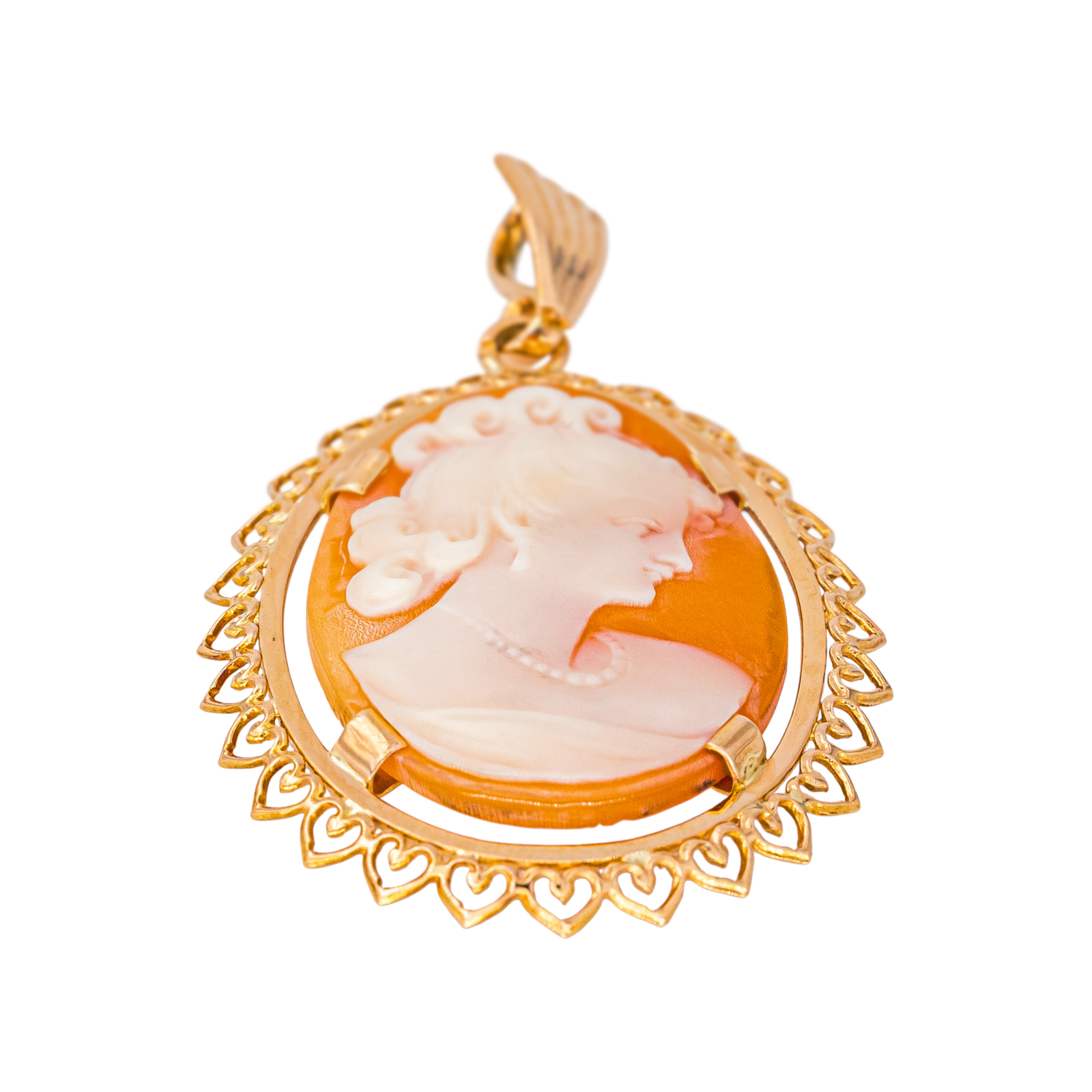 Pendentif camée, en or jaune 750 millièmes (18 carats), composé d'un pendentif ovale aux bords ajourés, retenant un camée de femme, coquille, dimensions du camée : 2,46 cm X 1,89 cm, dimension du pendentif (avec bélière): 4,59 cm X 2,73 cm, poids: 4,31 g, poinçon tête d'aigle, excellent état.