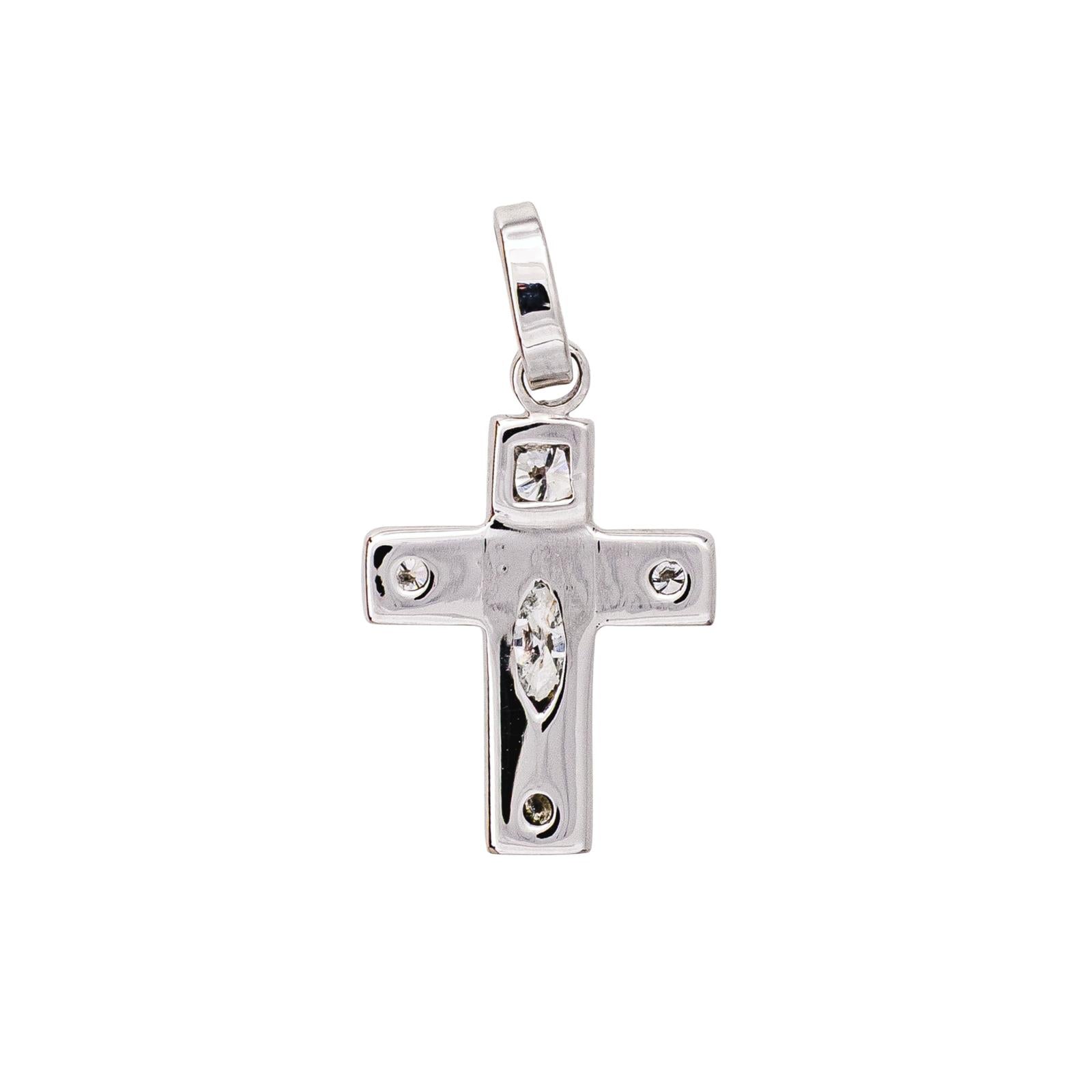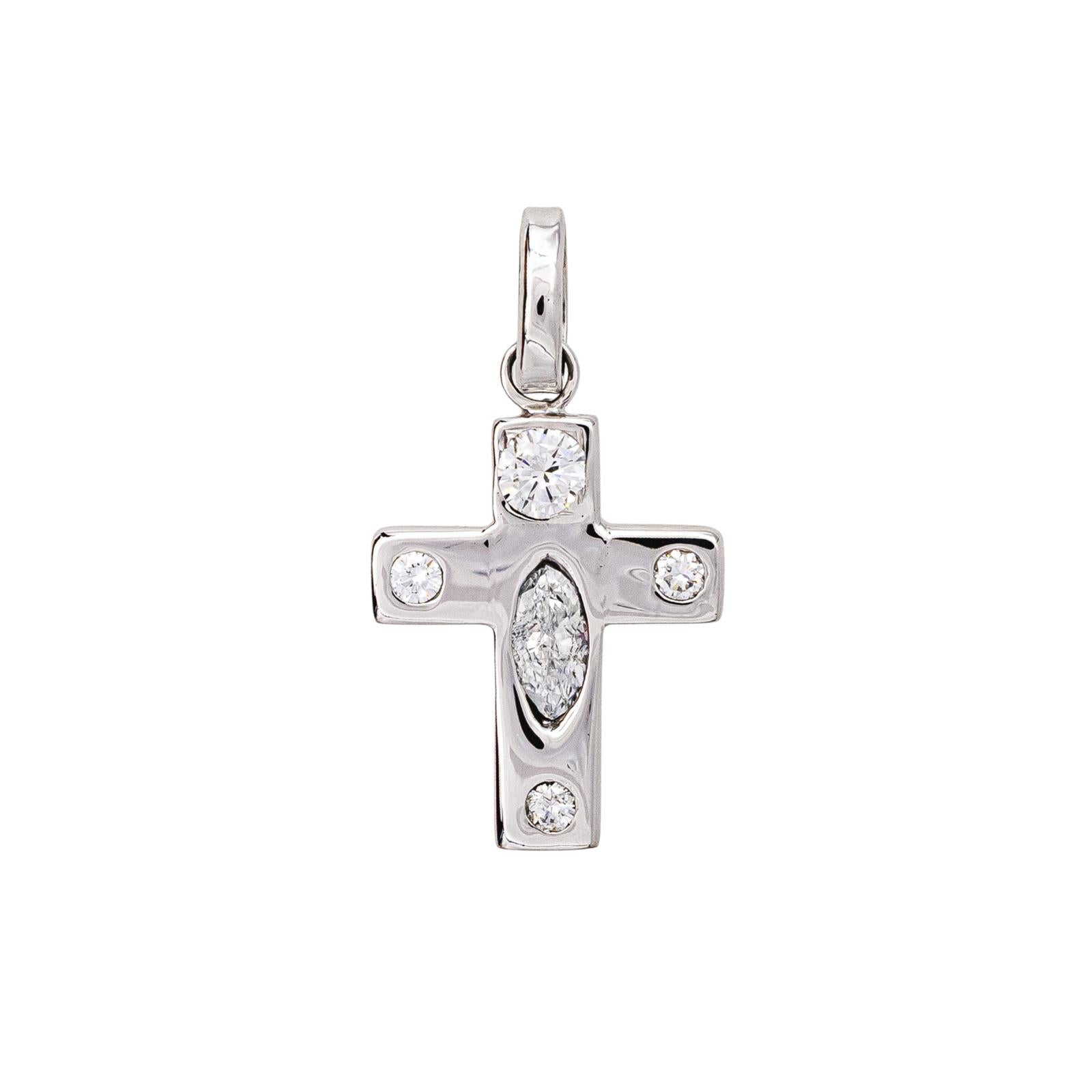 Pendentif en or blanc 750 millièmes (18 carats) testé, représentant une croix catholique, serti de 5 diamants, 4 taille brillant, environ H-SI, d'un poids total d'environ 0,23 ct, (un diamant d'un poids d'environ 0,20 ct, 3 diamants d'un poids d'environ 0,03 ct), un diamant taille marquise, environ H-P, d'un poids total d'environ 0,21 ct, poids total de diamants environ 0,44 ct, dimensions avec la bélière : 2,53 cm x 1,34 cm, poids total : 2,10 g, excellent état