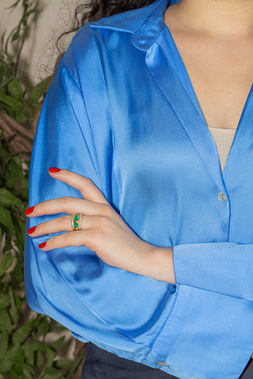 Bague en or jaune 750 millièmes (18 carats), sertie d'émeraudes et de diamants, 3 émeraudes taille ovale, d'un poids total d'environ 1,50 cts, (chaque émeraude d'un poids d'environ 0,50 ct), entourées de 84 diamants taille brillant, environ G-VS, d'un poids total d'environ 0,84 ct, (chaque diamant d'un poids d'environ 0,01 ct), largeur sur le dessus : 1,24 cm, tour de doigt : 54, poids total : 11,12 g, poinçon tête d'aigle, excellent état