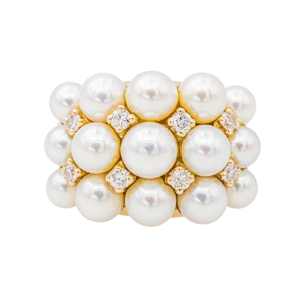 Bague en or jaune 750 millièmes (18 carats), sertie de 15 perles de culture (6 perles de 0,50 cm, 8 perles de 0,60 cm, et 1 perle de 0,66 mm), acompagnées de 8 diamants environ H-VS, d'un poids total d'environ 0,40 ct (chaque diamant d'un poids d'environ 0,05 ct), largeur sur le dessus: 1,83 cm, tour de doigt: 50, poids total: 27,19 g, poinçon hibou, excellent état