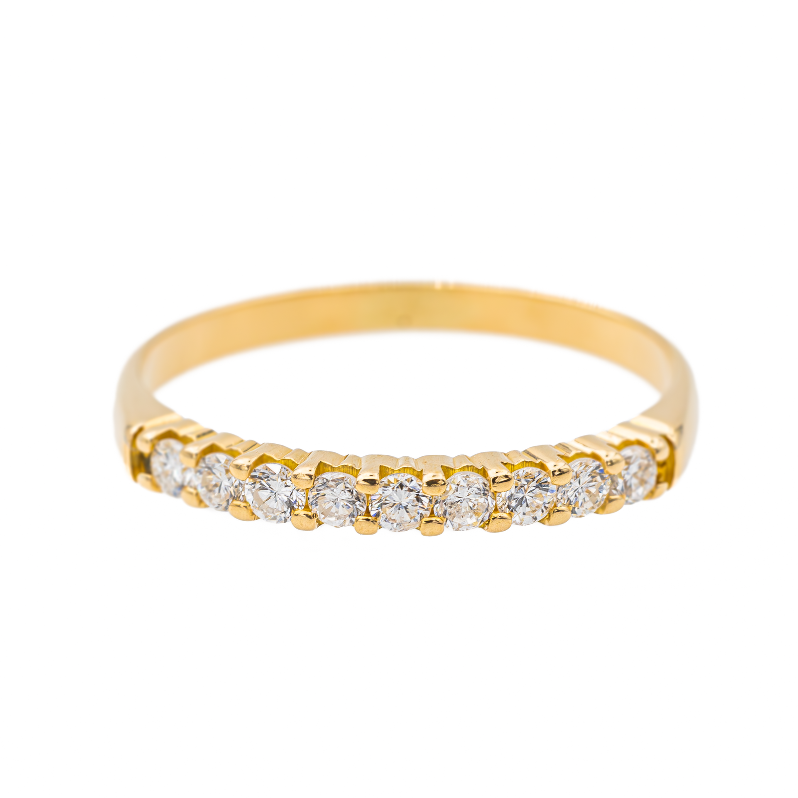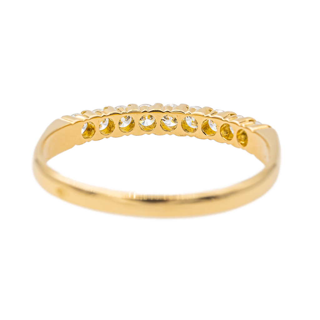 Demi-alliance en or jaune 750 millièmes (18 carats), sertie de 9 diamants taille brillant environ H-VS, d'environ 0,02 ct chacun, poids total diamants : environ 0,18 ct, largeur sur le dessus : 0,20 cm, tour de doigt : 47,5, poids total : 1,17 g, poinçon tête d'aigle, excellent état