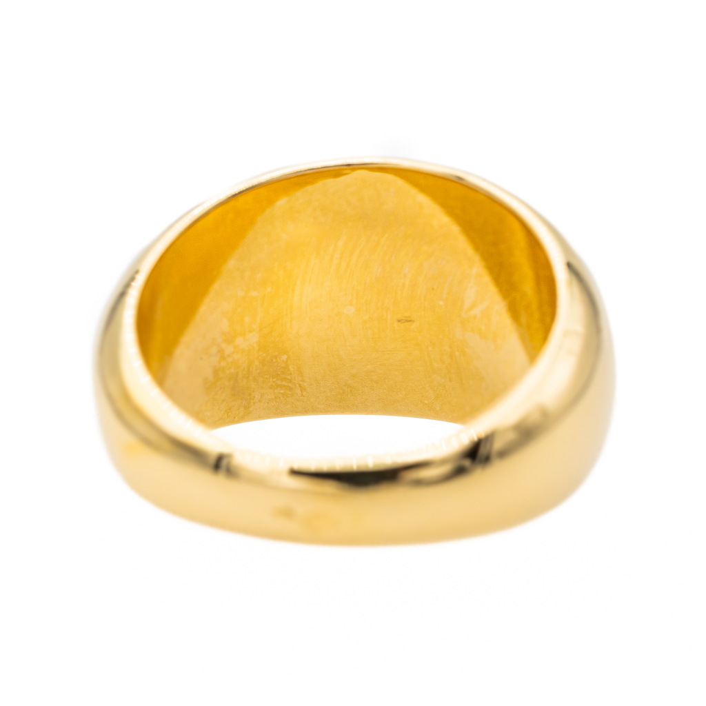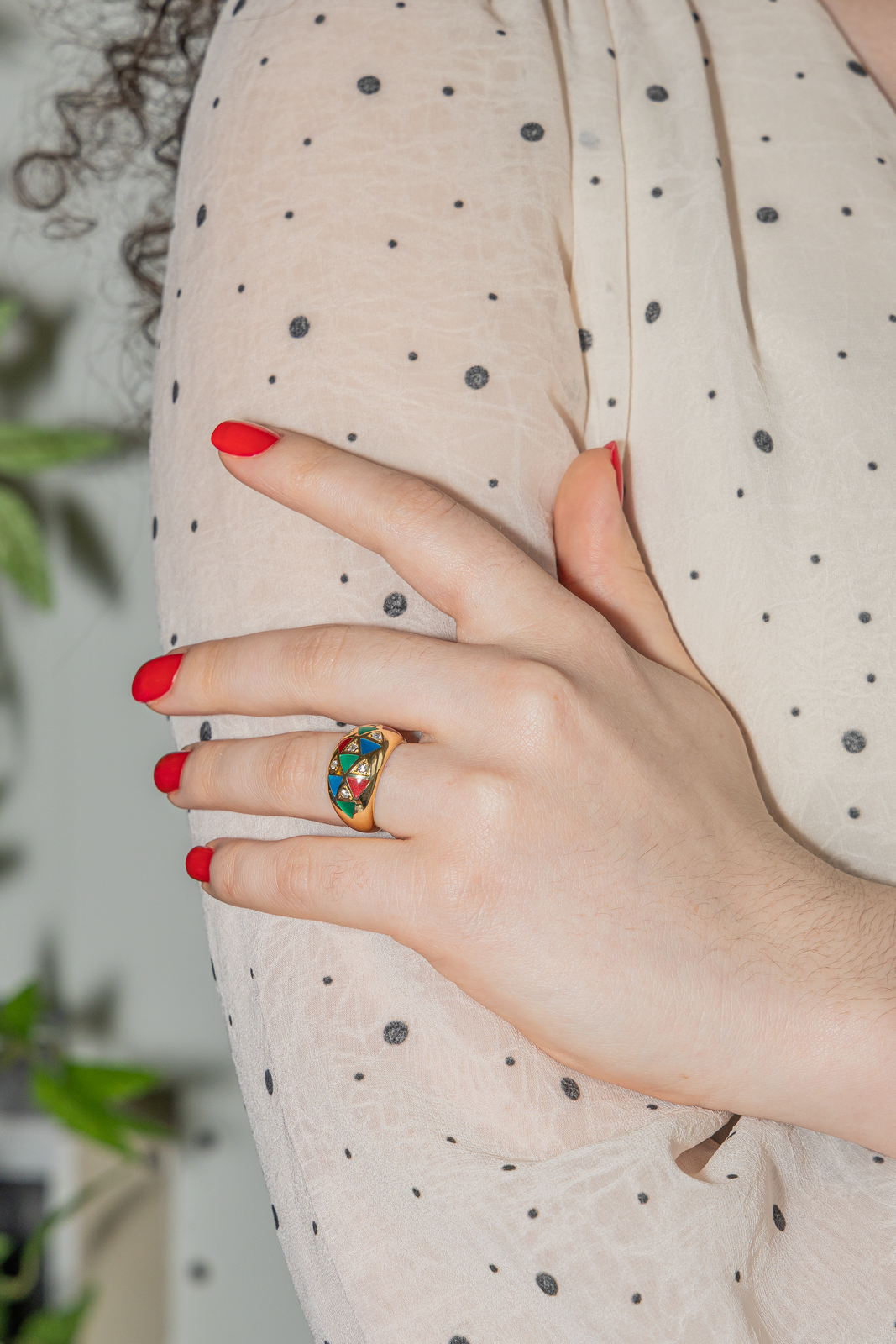 Bague en or jaune 750 millièmes (18 carats), émail coloré et sertie de 7 diamants taille brillant, environ H-VS, d'un poids total d'environ 0,14 cts, (chaque diamant d'un poids d'environ 0,02ct), largeur sur le dessus : 1,23 cm, tour de doigt : 52, poids total : 9,62 g, poinçon tête d'aigle, excellent état