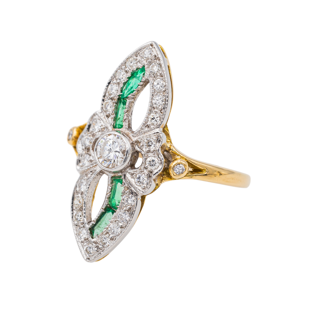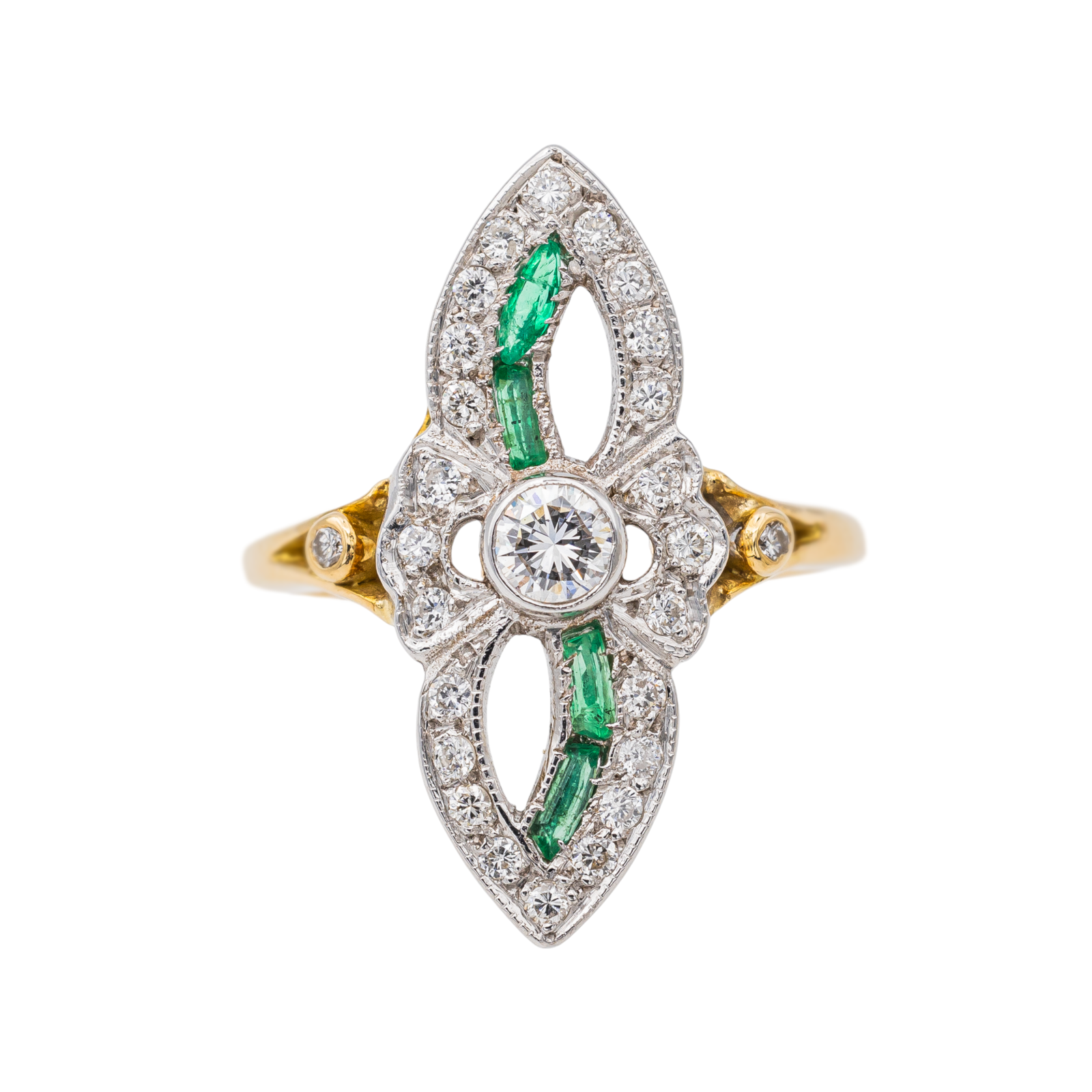 Bague en or jaune et blanc 750 millièmes (18 carats), sertie de diamants et d'emeraudes, 1 diamant central taille brillant, environ H-VVS, d'un poids total d'environ 0,23 ct, entouré de 4 émeraudes taille navette, d'un poids total d'environ 0,08 ct (chaque emeraude d'un poids d'environ 0,02 ct chacune), et de 26 diamants taille brillant, environ H-SI, d'un poids total d'environ 0,26 ct (chaque diamant d'un poids d'environ 0,01 ct), poids total diamants environ : 0,49 ct, largeur sur le dessus : 2,46 cm, tour de doigt : 53, poids total : 4,63 g, poinçon hibou, excellent état
