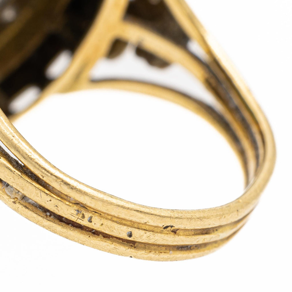 Bague sertie de saphirs et de diamants, en or jaune 750 millièmes (18 carats), un saphir central vert taille ovale, d'un poids d'environ 2,43 cts, entouré de 20 diamants taille mixte (brillant et ancien), environ H-SI, d'un poids total d'environ 0,20 ct, (chaque diamant d'un poids d'environ 0,01 ct), entouré de 19 saphirs bleus taille brillant, d'un poids total d'environ 1,14 cts, (chaque saphir d'un poids d'environ 0,06 ct), largeur sur le dessus: 2,09 cm, tour de doigt: 52, poids total: 7,24 g, poinçon hibou, excellent état