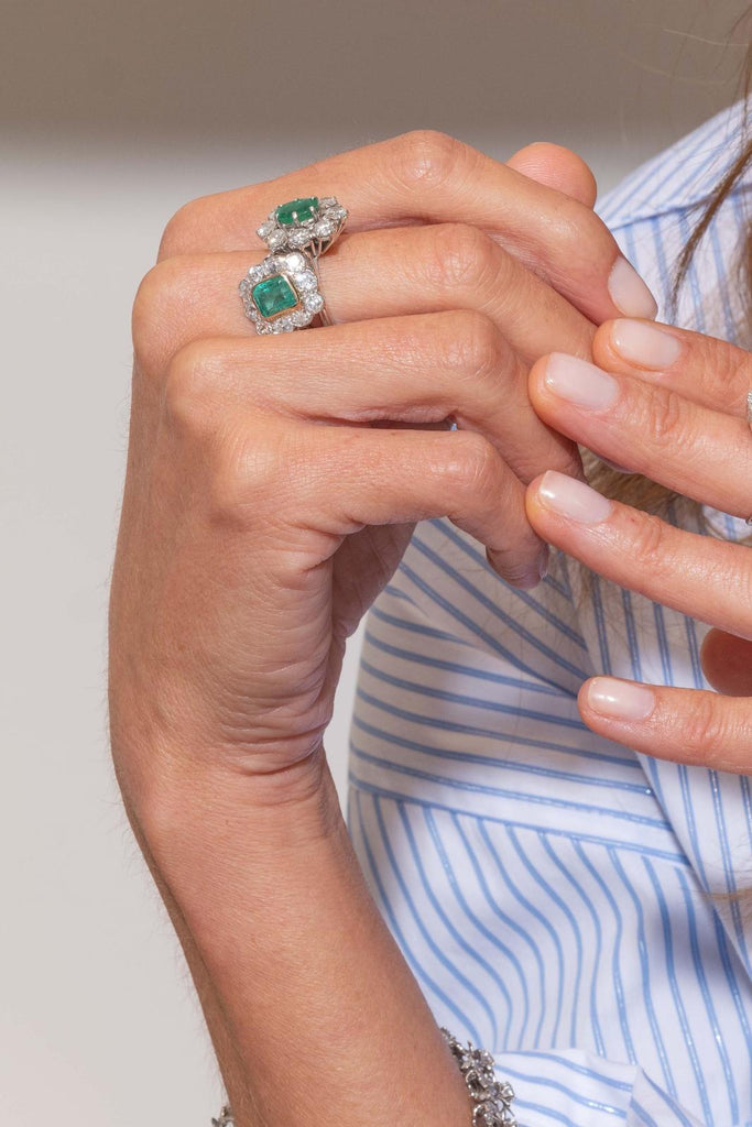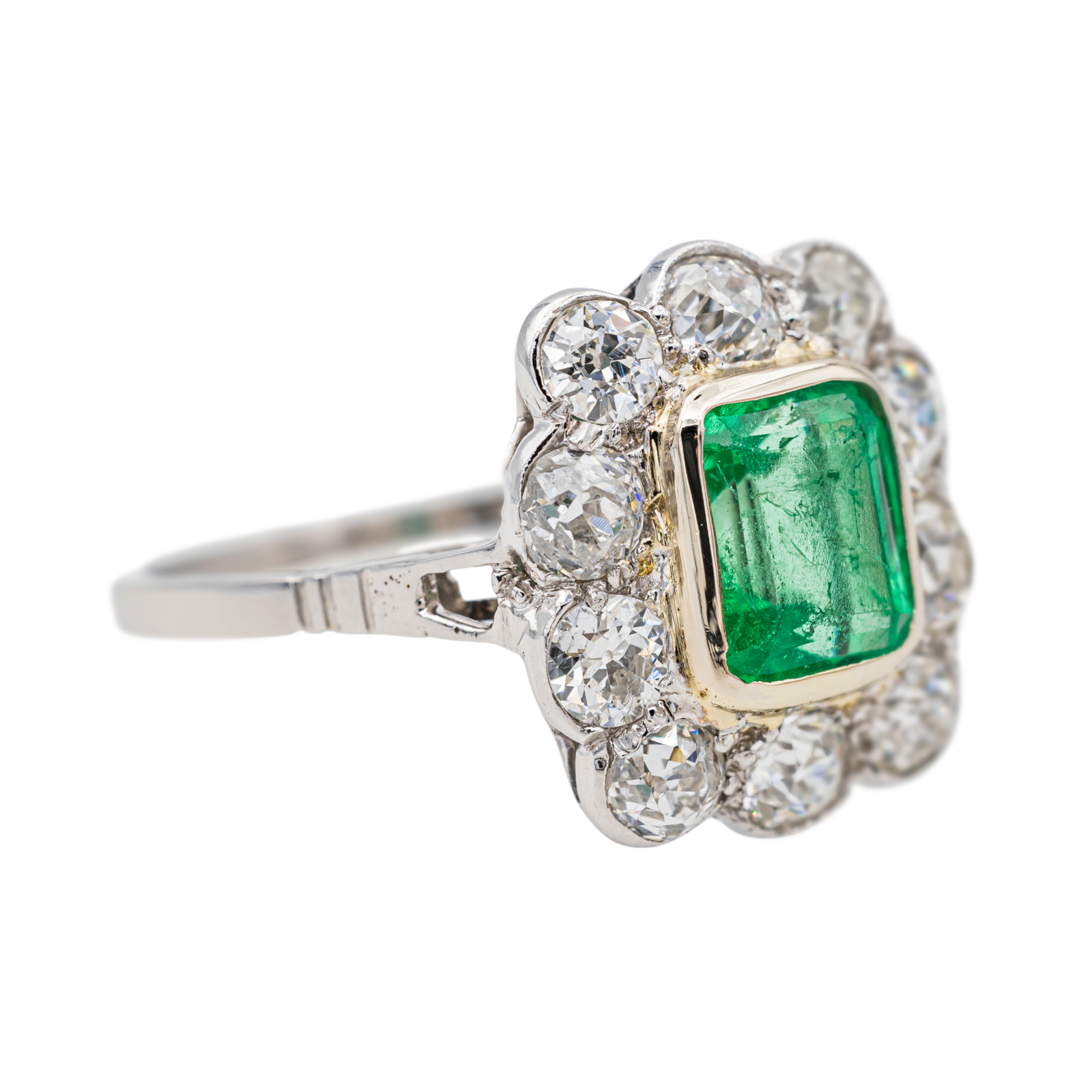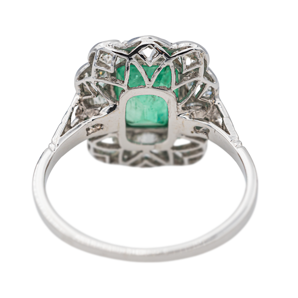 Bague en platine 950 millièmes, sertie d'une émeraude et de diamants, une émeraude taille émeraude d'un poids total d'environ 1,39 cts, entourée de 10 diamants taille ancienne, environ H/SI, d'un poids total d'environ 1,10 cts, (chaque diamant d'un poids d'environ 0,11 ct), largeur sur le dessus : 1,52 cm, tour de doigt : 55, poids total : 4,25 g, poinçon mascaron, excellent état
