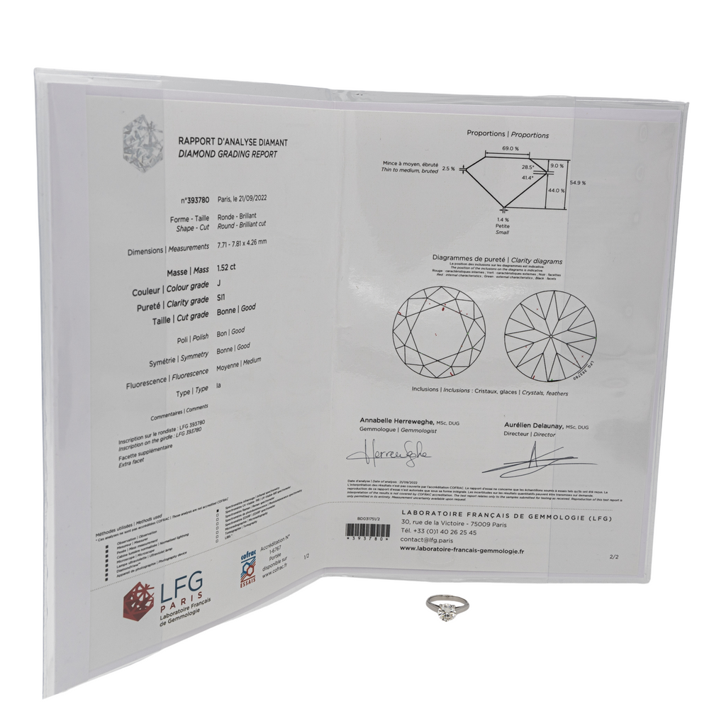 Solitaire en or blanc 18 carats (750 millièmes), serti d'un diamant d'environ 1,52 cts et certifié J/SI1 par le LFG, Tour de doigt : 51, Largeur: 0,78 cm, Poids total: 4,45 g, Poinçon tête d'aigle, Excellent état