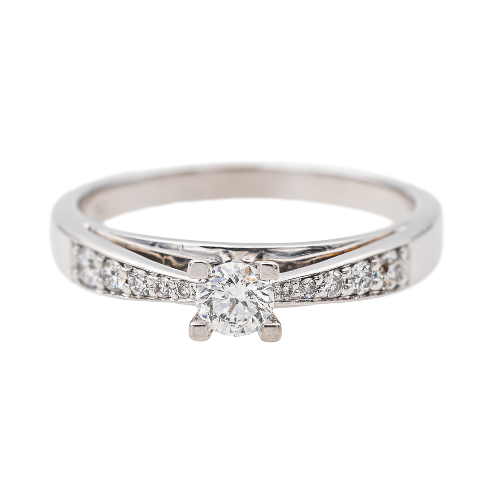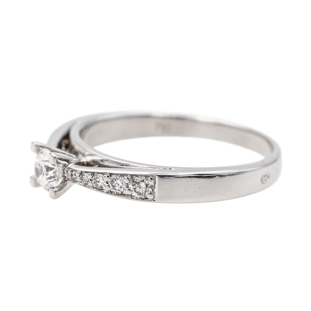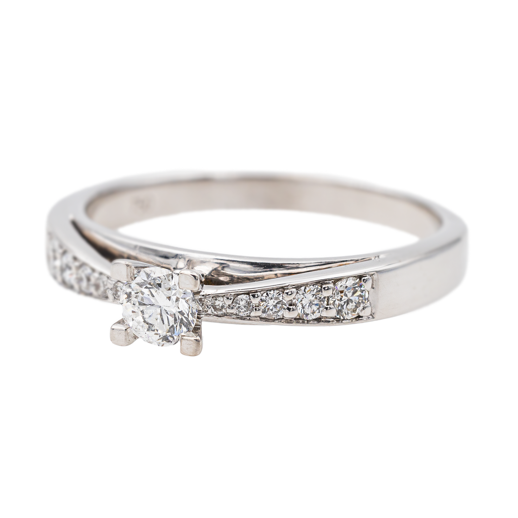 Bague en or blanc 750 millièmes (18 carats), sertie de 11 diamants taille brillant environ G-SI, d'un poids total d’environ 0,50 ct, (un diamant d'environ 0,30 ct, 2 diamants d'environ 0,05 ct, 2 diamants d'environ 0,03 ct et 6 diamants d'environ 0,007 ct), largeur sur le dessus : 0,45 cm, tour de doigt : 60, poids total : 5,09 g, poinçon tête d'aigle, excellent état