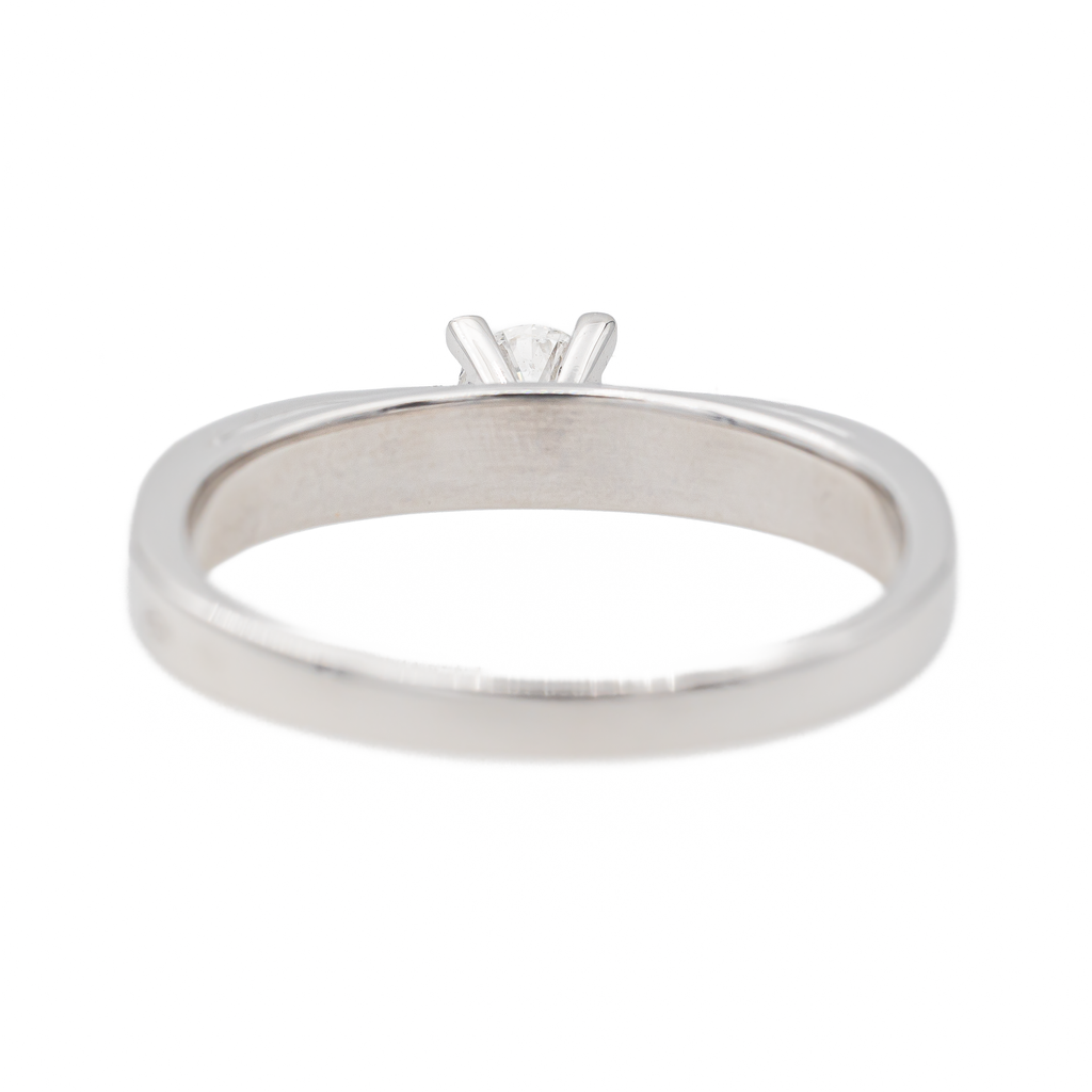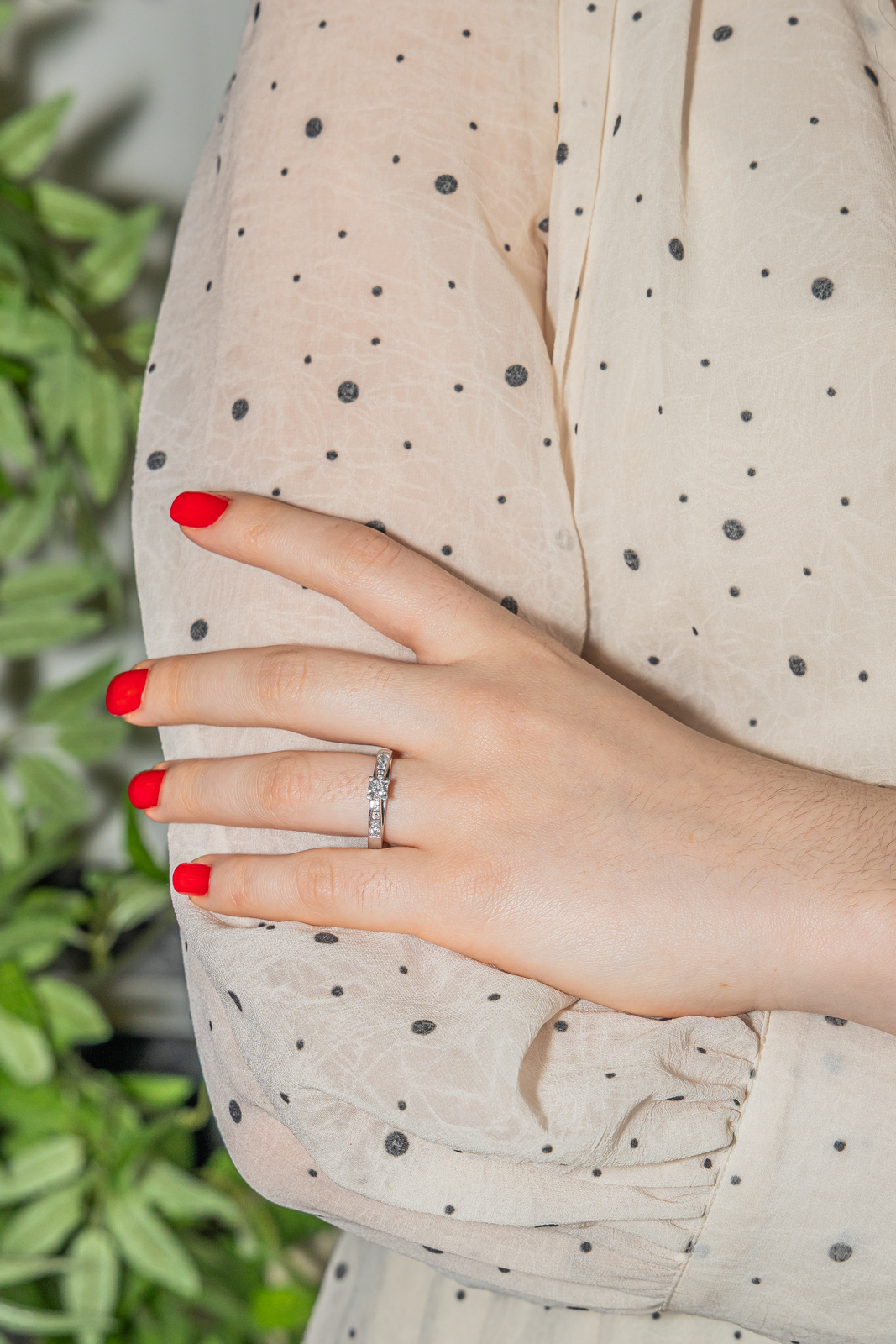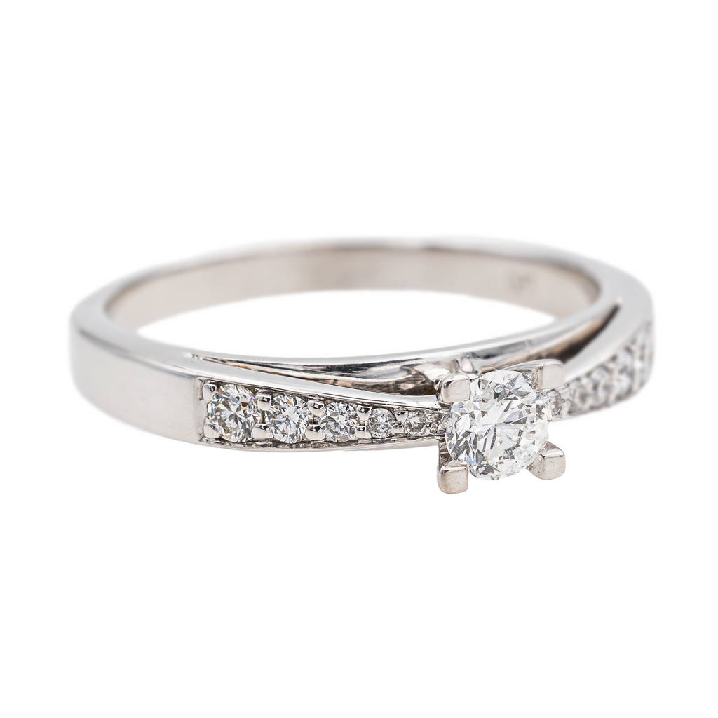 Bague en or blanc 750 millièmes (18 carats), sertie de 11 diamants taille brillant environ G-SI, d'un poids total d’environ 0,50 ct, (un diamant d'environ 0,30 ct, 2 diamants d'environ 0,05 ct, 2 diamants d'environ 0,03 ct et 6 diamants d'environ 0,007 ct), largeur sur le dessus : 0,45 cm, tour de doigt : 60, poids total : 5,09 g, poinçon tête d'aigle, excellent état