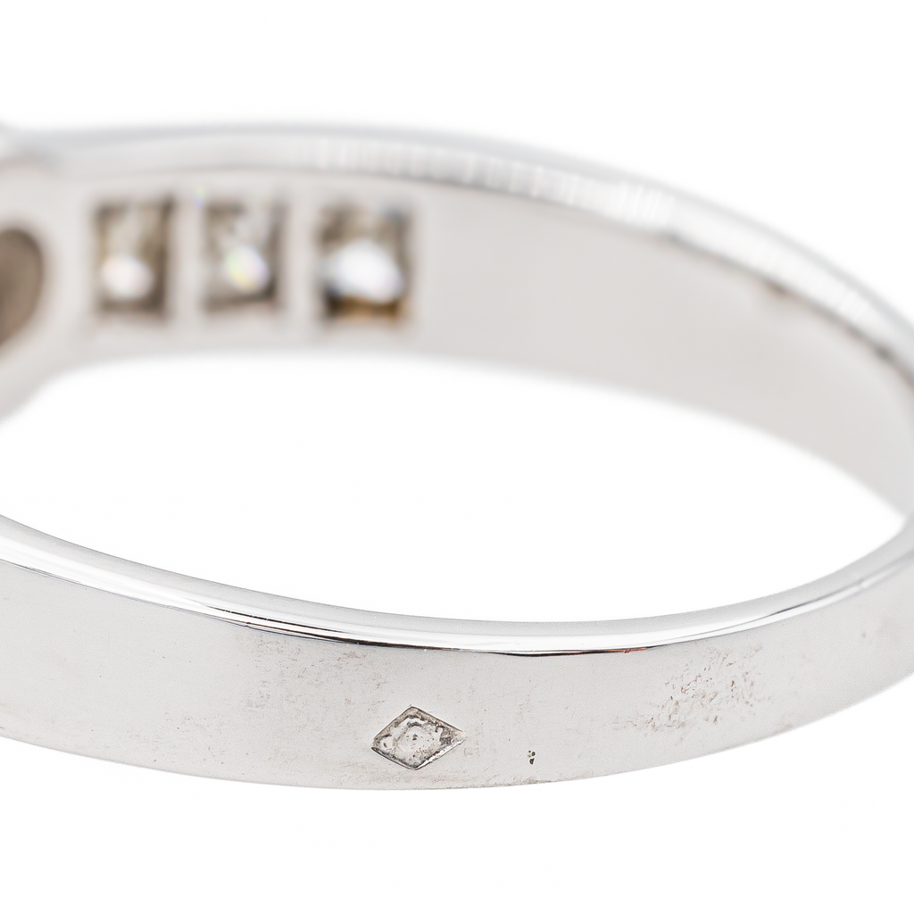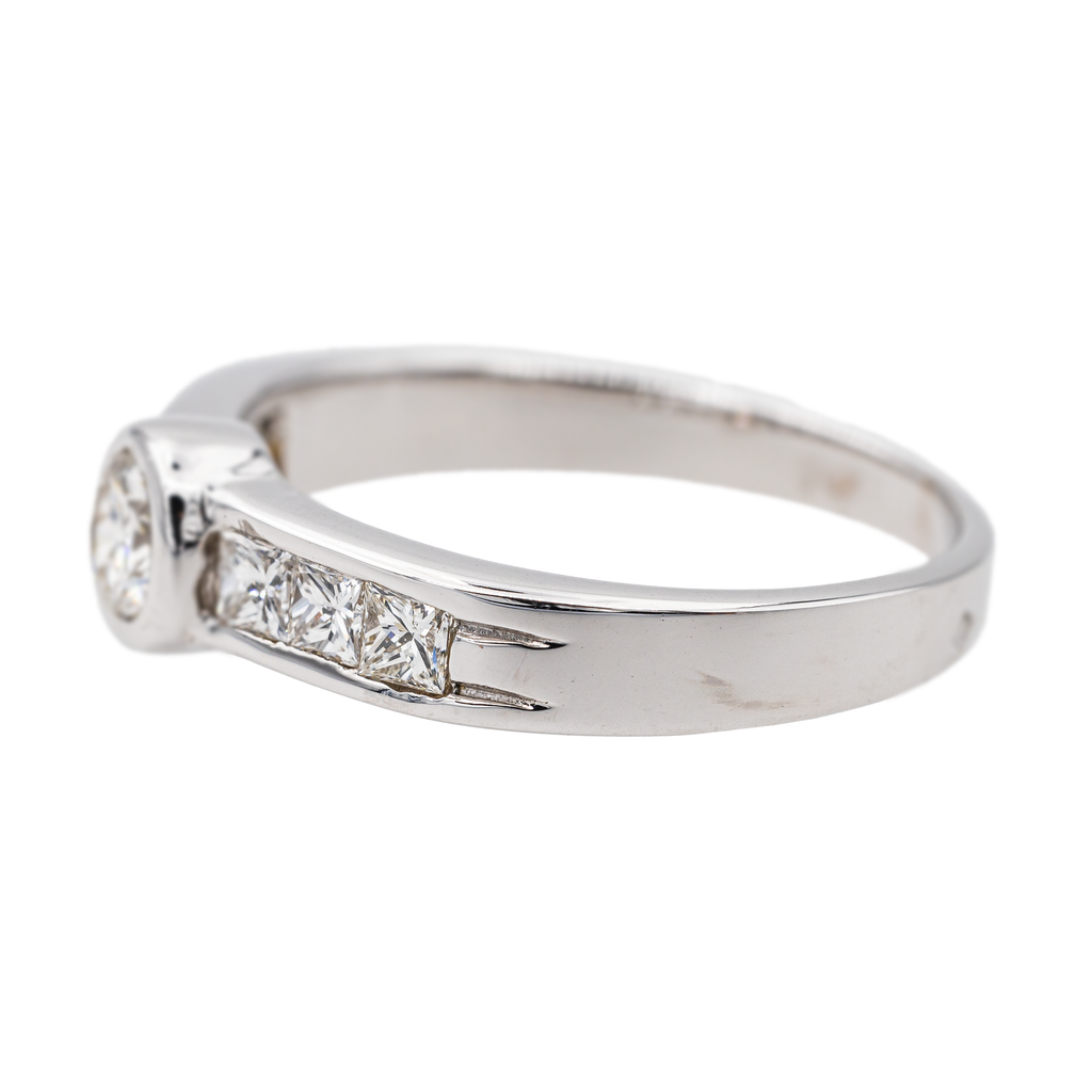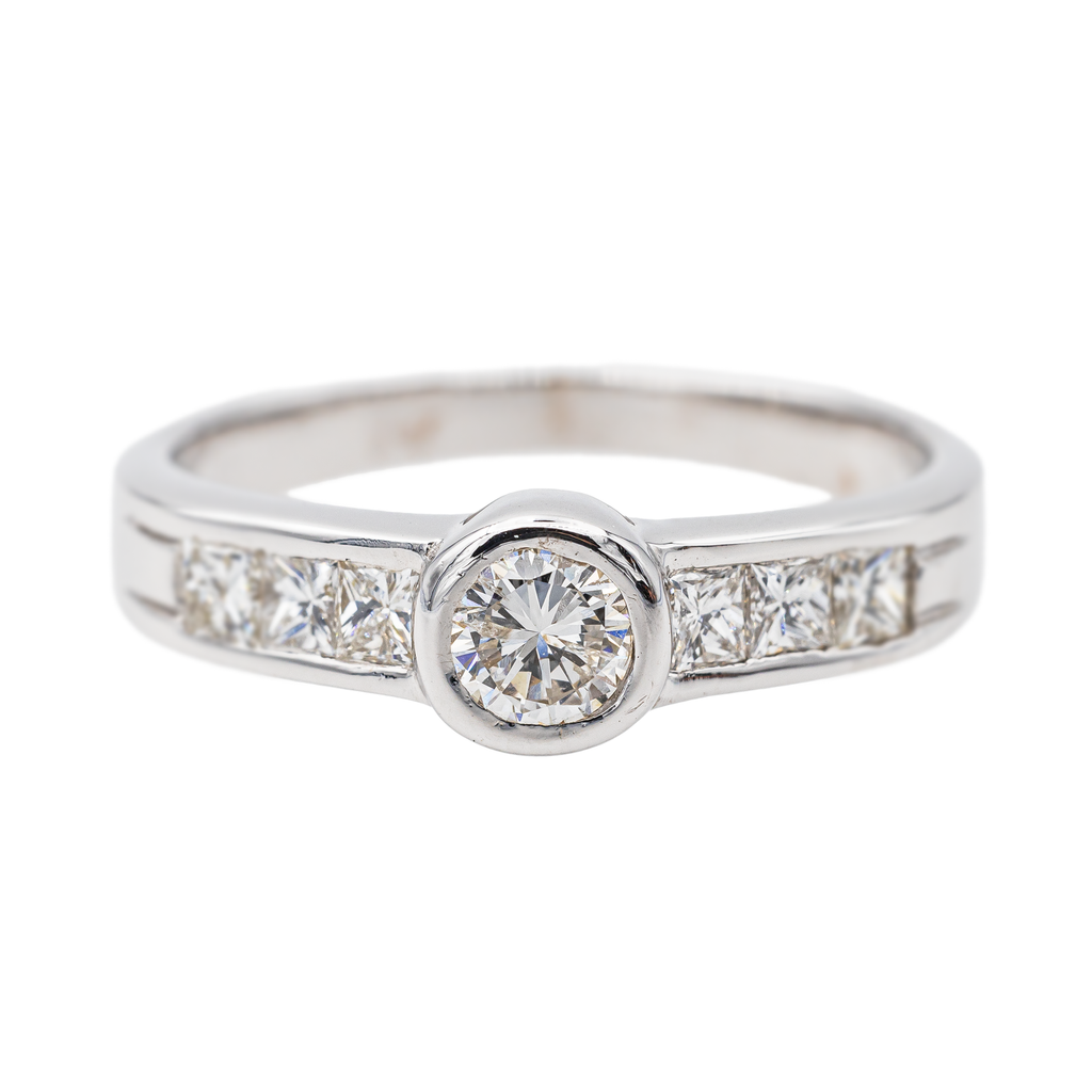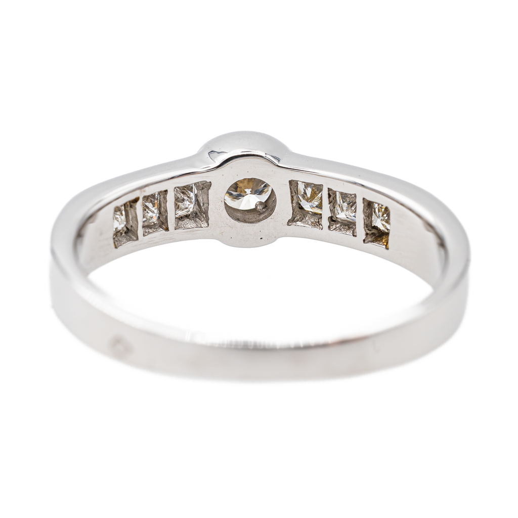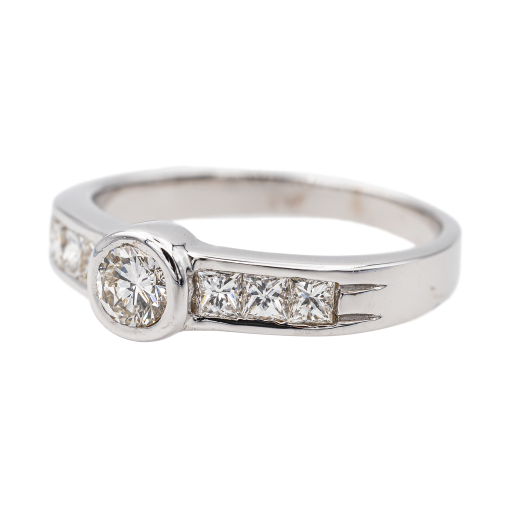 Bague solitaire en or blanc 750 millièmes (18 carats), sertie de diamants, un diamant taille brillant, environ H-SI, d'un poids total d'environ 0,31 ct, entouré de 6 diamants taille princesse, environ H-VS, d'un poids total d'environ 0,42 ct, (chaque diamant d'un poids d'environ 0,07 ct), poids total diamants environ : 0,73 ct, largeur sur le dessus : 0,60 cm, tour de doigt : 57, poids total : 4,84 g, poinçon tête d'aigle, excellent état