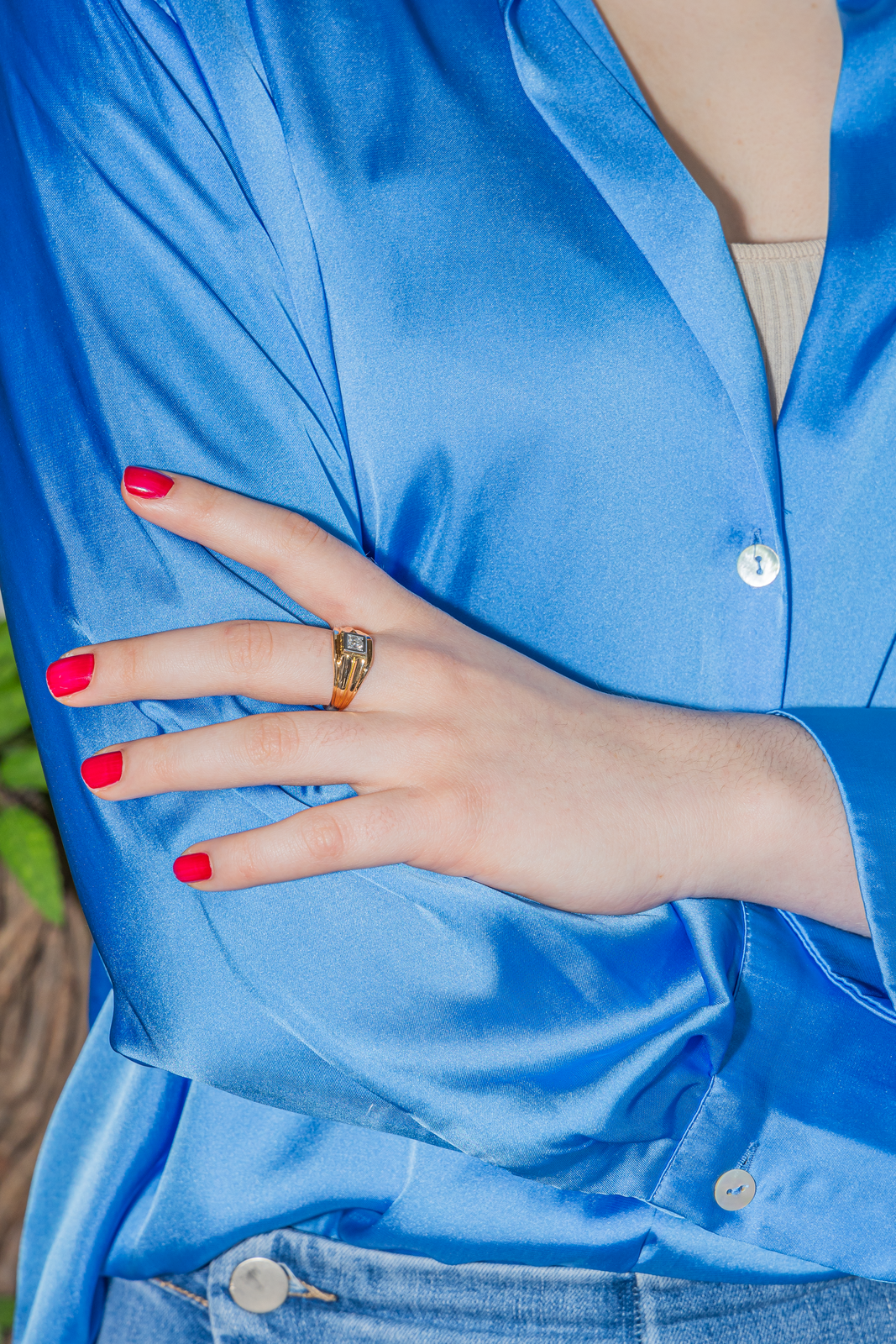 Bague tank en or rose 750 millièmes (18 carats), sertie d’un diamant taille brillant environ H-SI, d'un poids total d’environ 0,20 ct, largeur sur le dessus : 1,05 cm, tour de doigt : 58,5, poids total : 7,78 g, poinçon hibou, excellent état