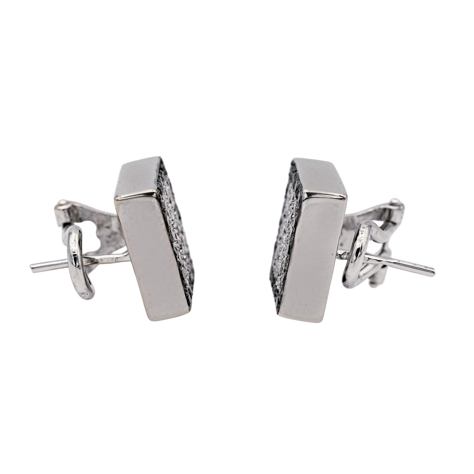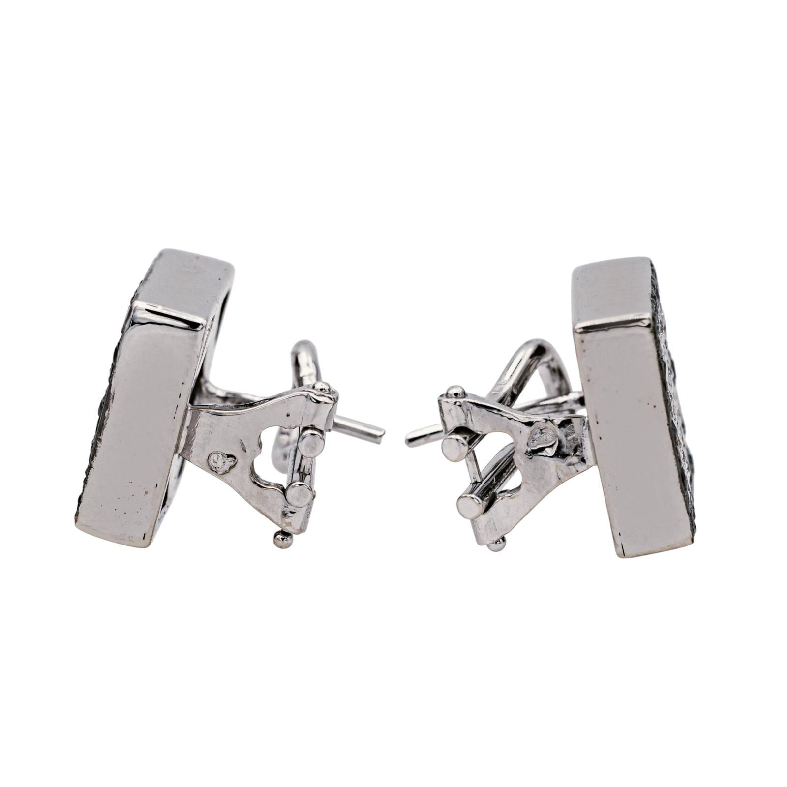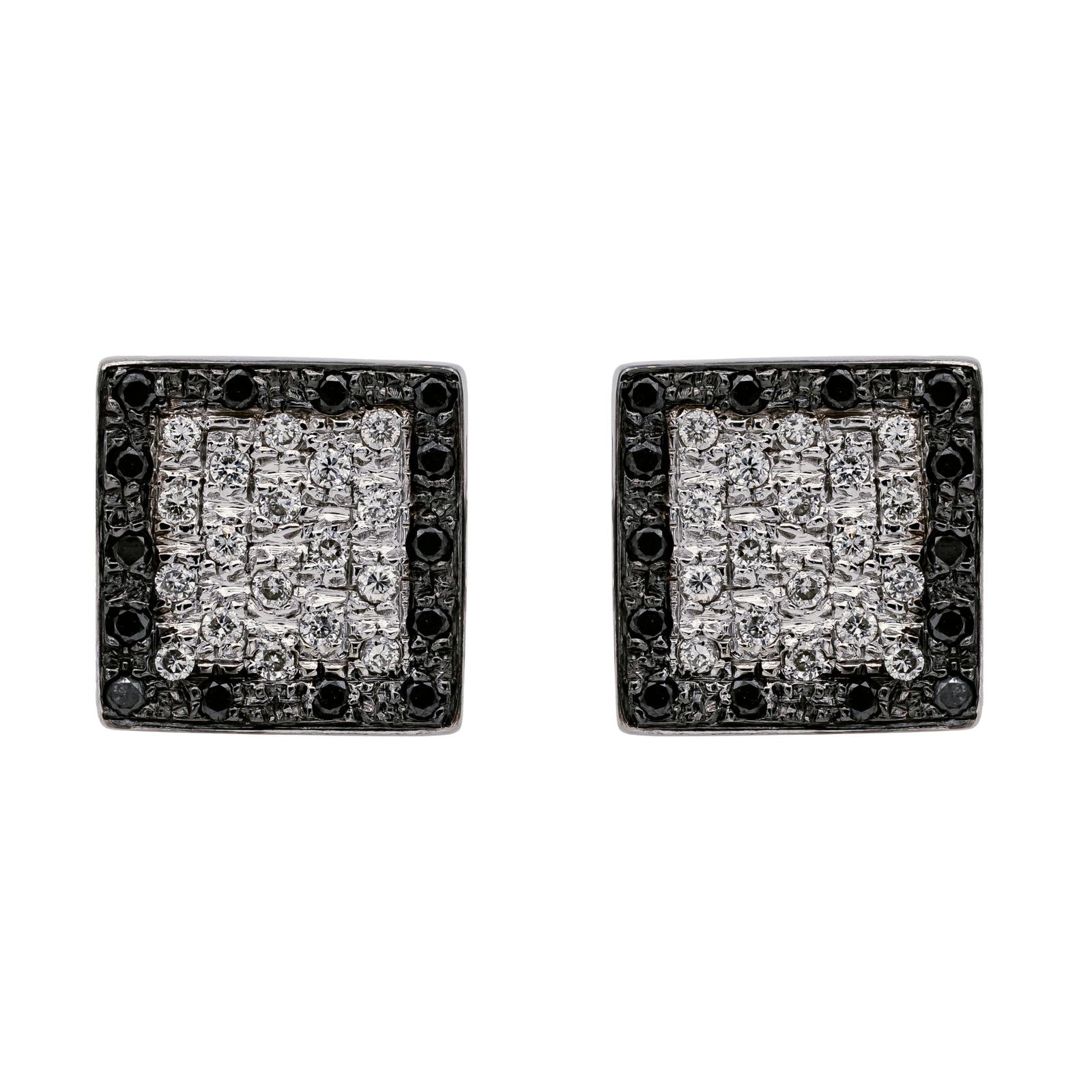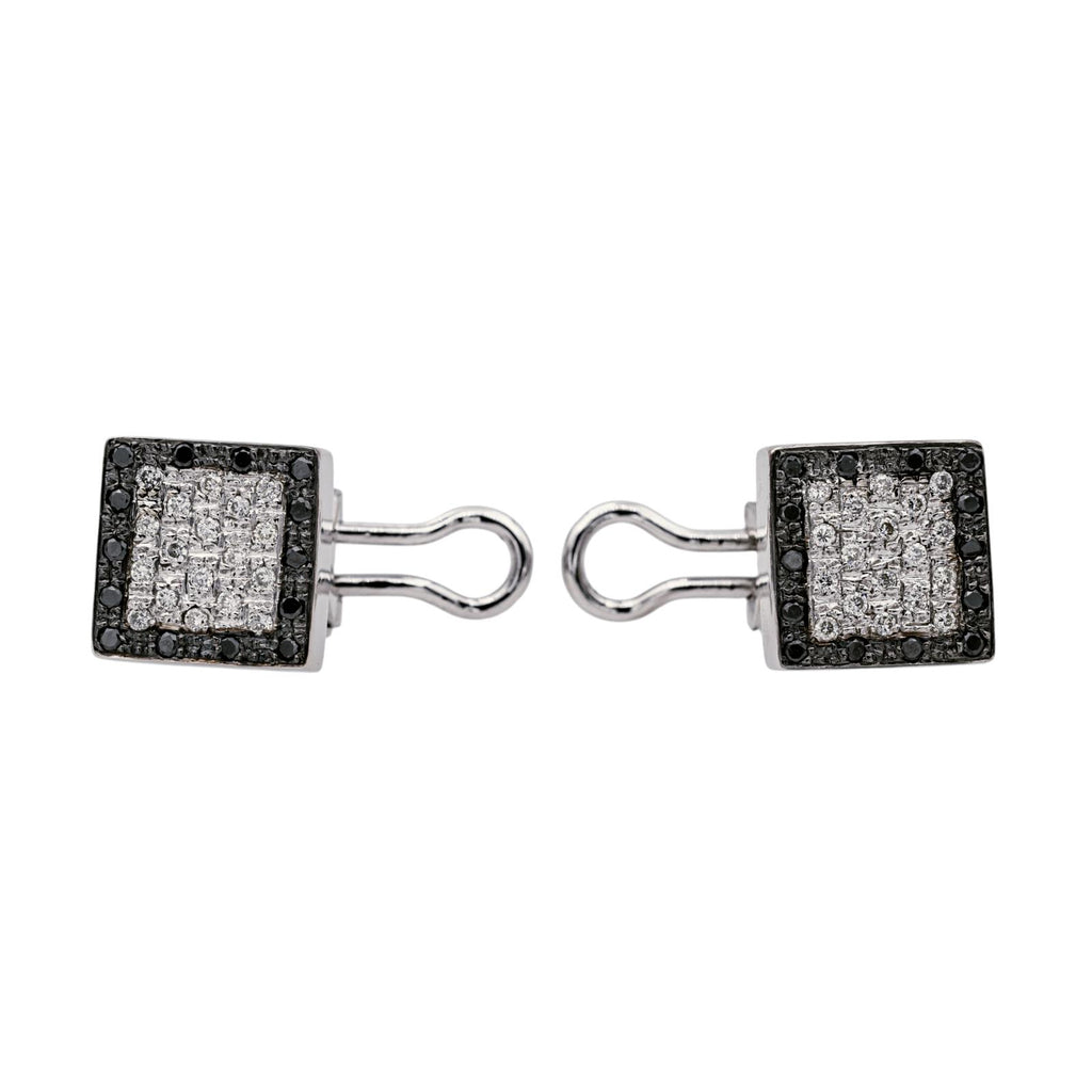 Paire de boucles d’oreilles en or blanc 750 millièmes (18 carats), sertie de diamants, 36 diamants taille brillant, environ G-SI, d'un poids total d'environ 0,14 ct, (chaque diamant d'un poids d'environ 0,14 ct), entourés de 28 diamants noirs, taille brillant, d'un poids total d'environ 0,28 ct, (chaque diamant d'un poids d'environ 0,01 ct), poids total diamants environ : 0,64 ct, dimensions : 1,26 cm x 1,26 cm, poids total : 9,71 g, poinçon hibou, excellent état
