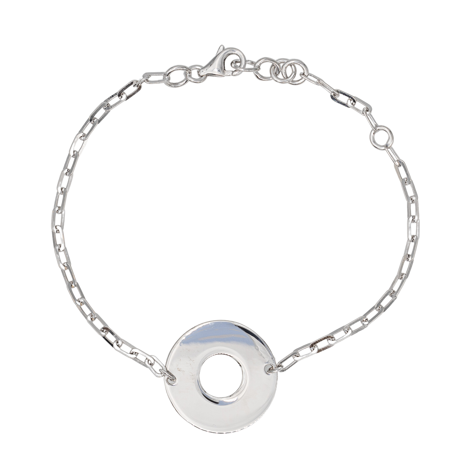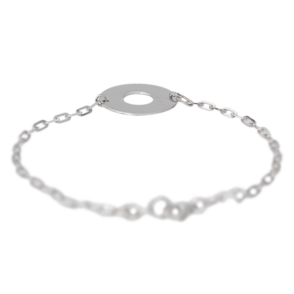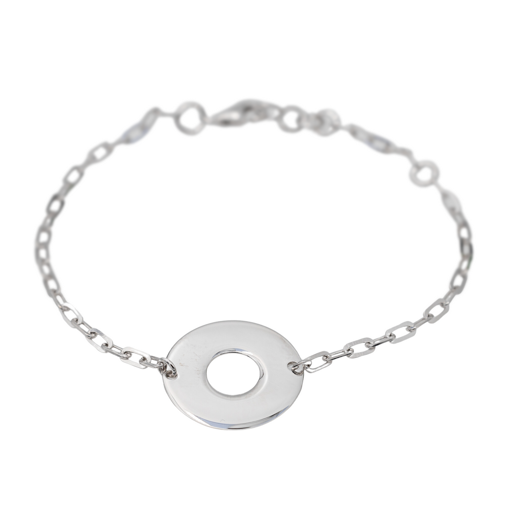 Bracelet en or blanc 750 millièmes (18 carats), motif cercle ajouré de 1,75 cm de diamètre, chaine en maille forçat limée, longueur : 17 cm, ajustable à 14 cm, Poids total: 4,12 g, poinçon hibou, excellent état