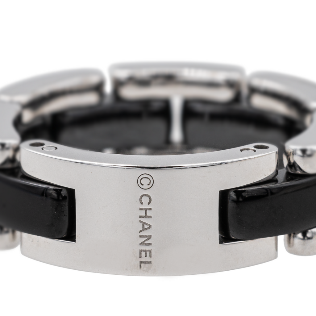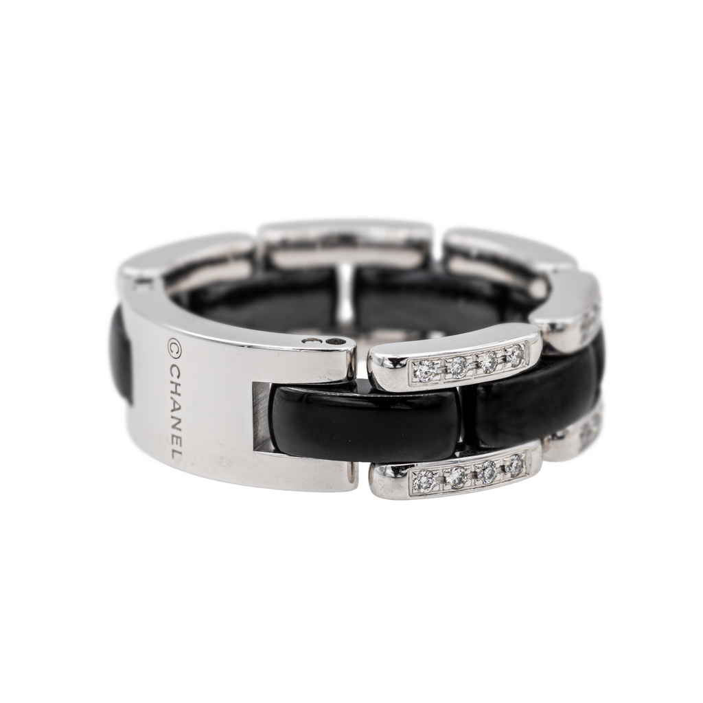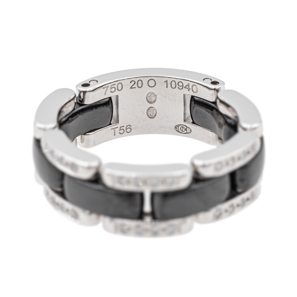 Bague signée de la Maison Chanel, collection Ultra, petit modèle, en or blanc 750 millièmes (18 carats), et céramique noire, sertie de 40 diamants, taille brillant, environ G/VS, poids total diamants environ 0,22 ct, tour de doigt : T56, numérotée 20O10940, poinçon saint Bernard, poids total : 10,71 g, excellent état