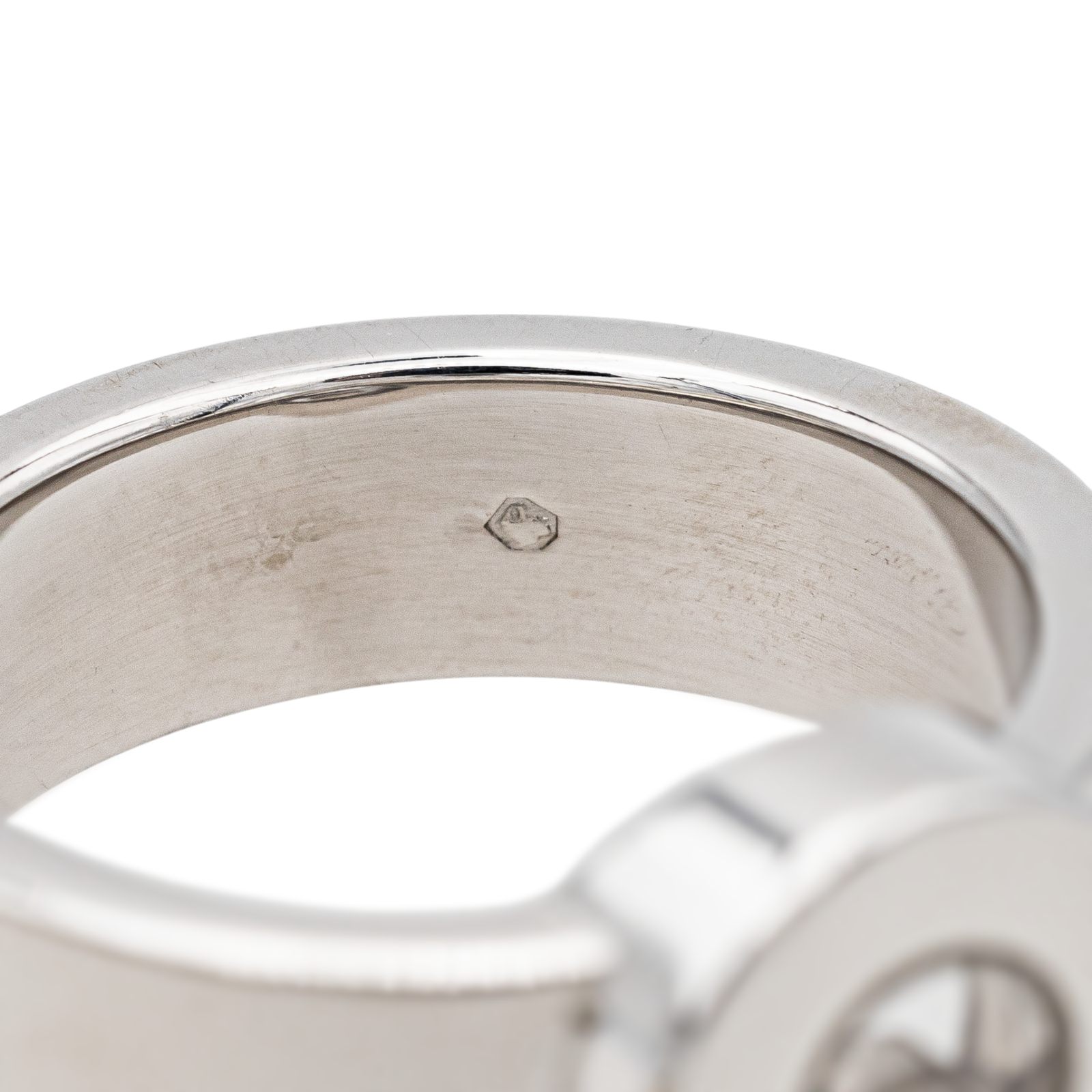 Bague signée de la Maison Chopard en or blanc 750 millièmes (18 carats), modèle "Happy Diamonds", sertie d'un diamant mobile, environ G-VS, d'un poids total d'environ 0,03 ct, largeur sur le dessus : 0,99 cm, tour de doigt : 52, poids total : 12,94 g, poinçon Saint Bernard, Signature visible sur verre, Gravure chopard sur l'anneau et numéro de série effacé par le polissage, excellent état