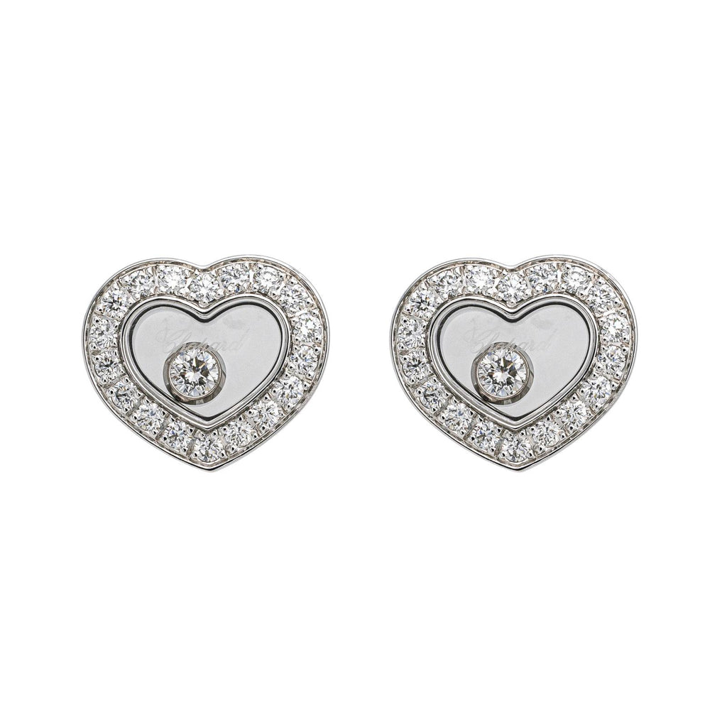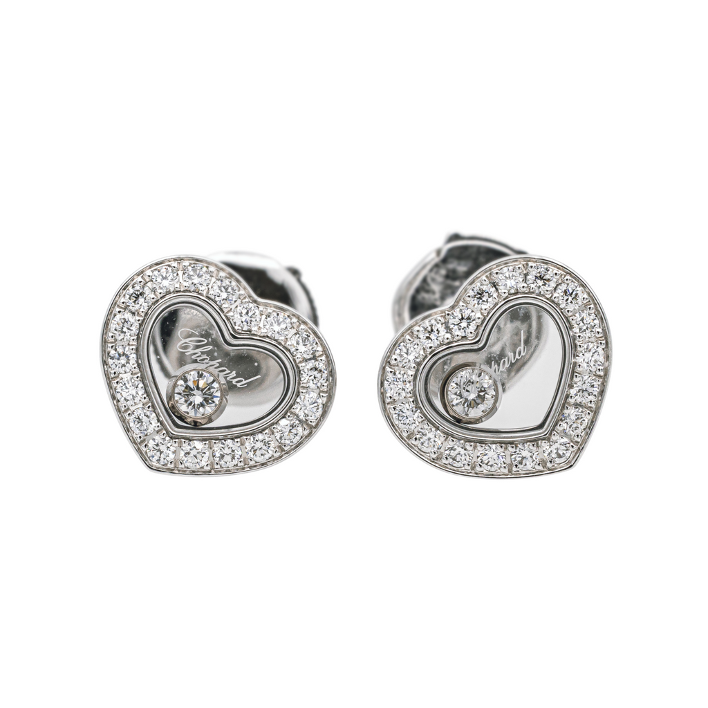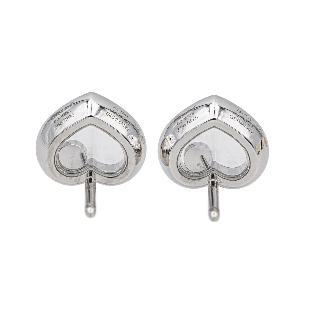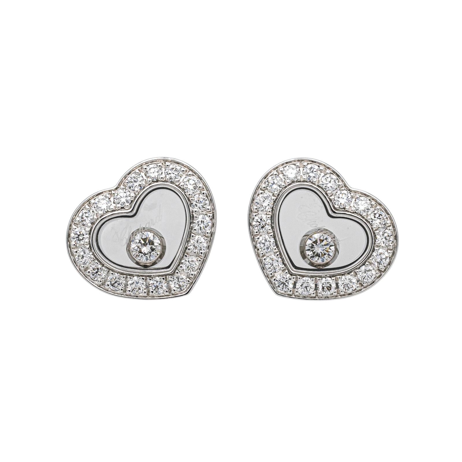 Boucles d'oreilles signées de la Maison Chopard, modèle cœur, collection Happy Diamonds, en or blanc 750 millièmes (18 carats), pavées de 36 diamants taille brillants environ F/ VVS, et de deux diamants mobiles, poids total diamants: 0,38 cts, fermoir alpa, dimensions cœurs : 1,05 cm x 0,95 cm, poids total: 5,94 g, numérotées : 83A054- 6567896, poinçon saint bernard, full set, excellent état, jamais portées