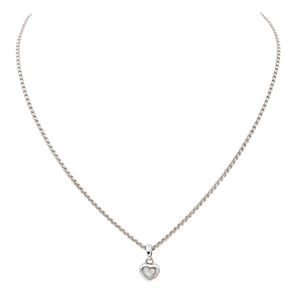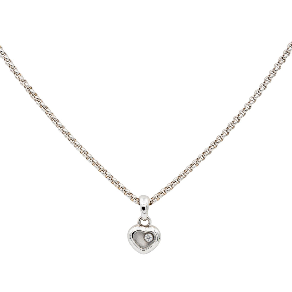 Collier signé et numéroté de la Maison Chopard or blanc 750 millièmes (18 carats), modèle Happy Diamonds, pendentif cœur avec un diamant à l'interieur, 1 diamant environ G-VVS, d'un poids total d'eniron 0,05 ct, maille jaseron, numéro de série : 2299673 79/4854, longueur de la chaine : 42,5 cm, dimensions du pendentif avec bélière: 1,53 cm x 0,90 cm, poids total : 10,90 g, poinçon hibou, excellent état.