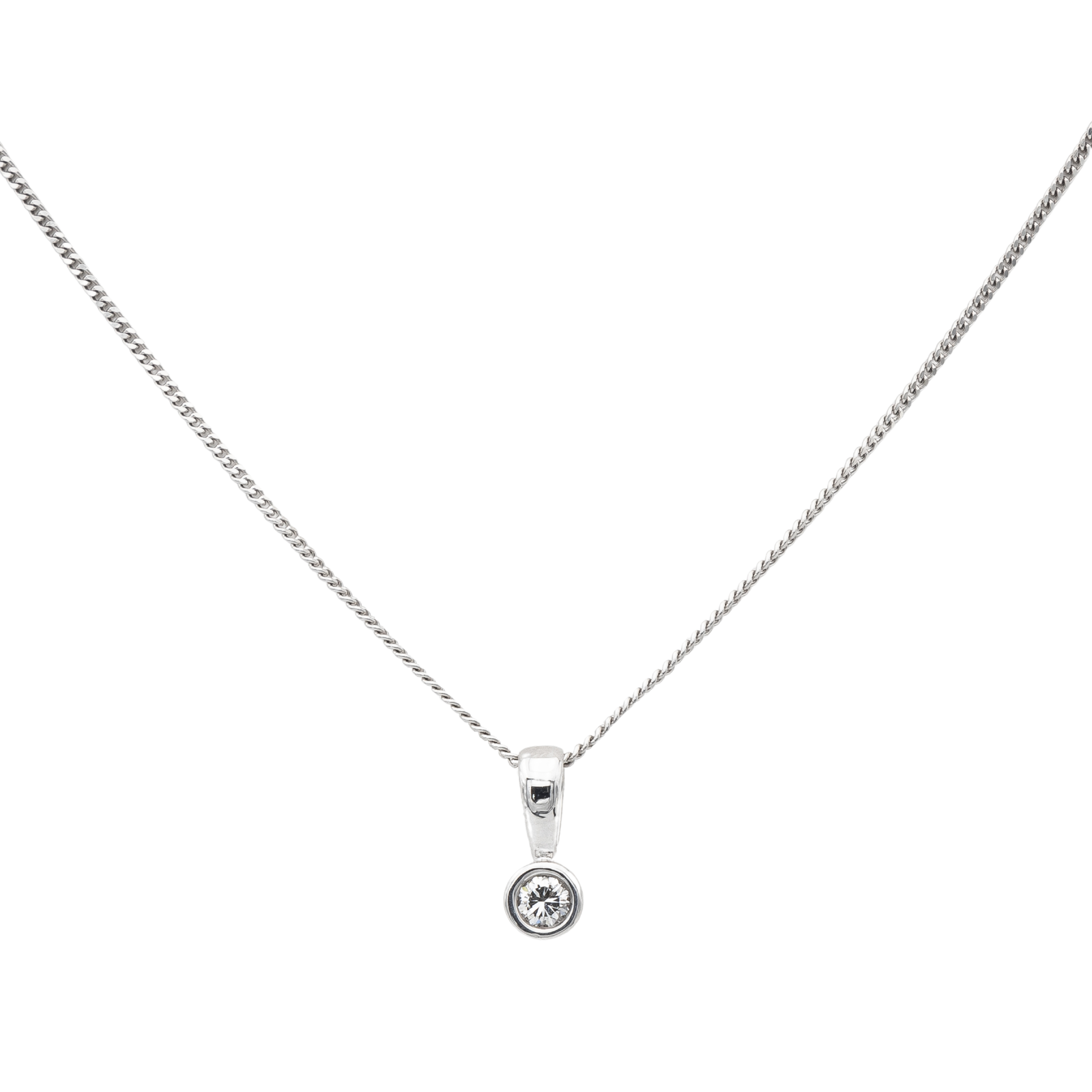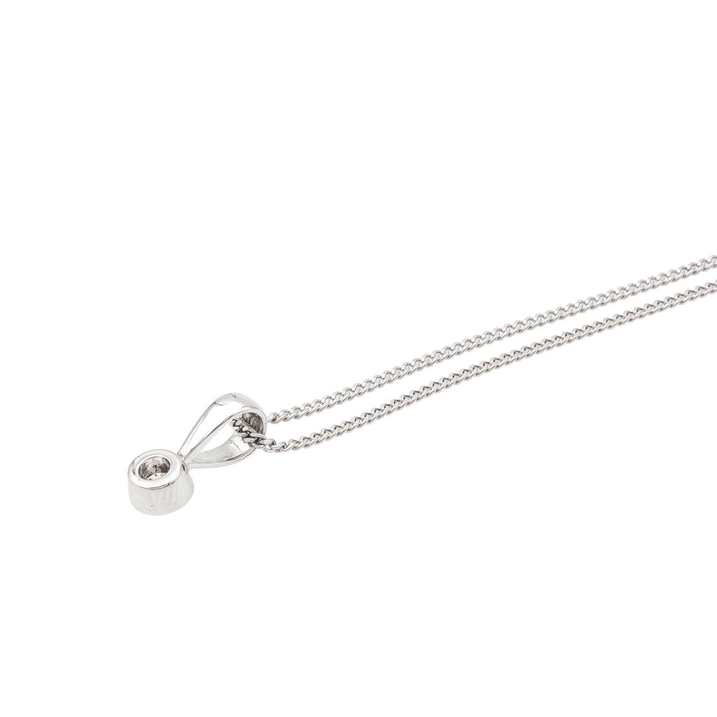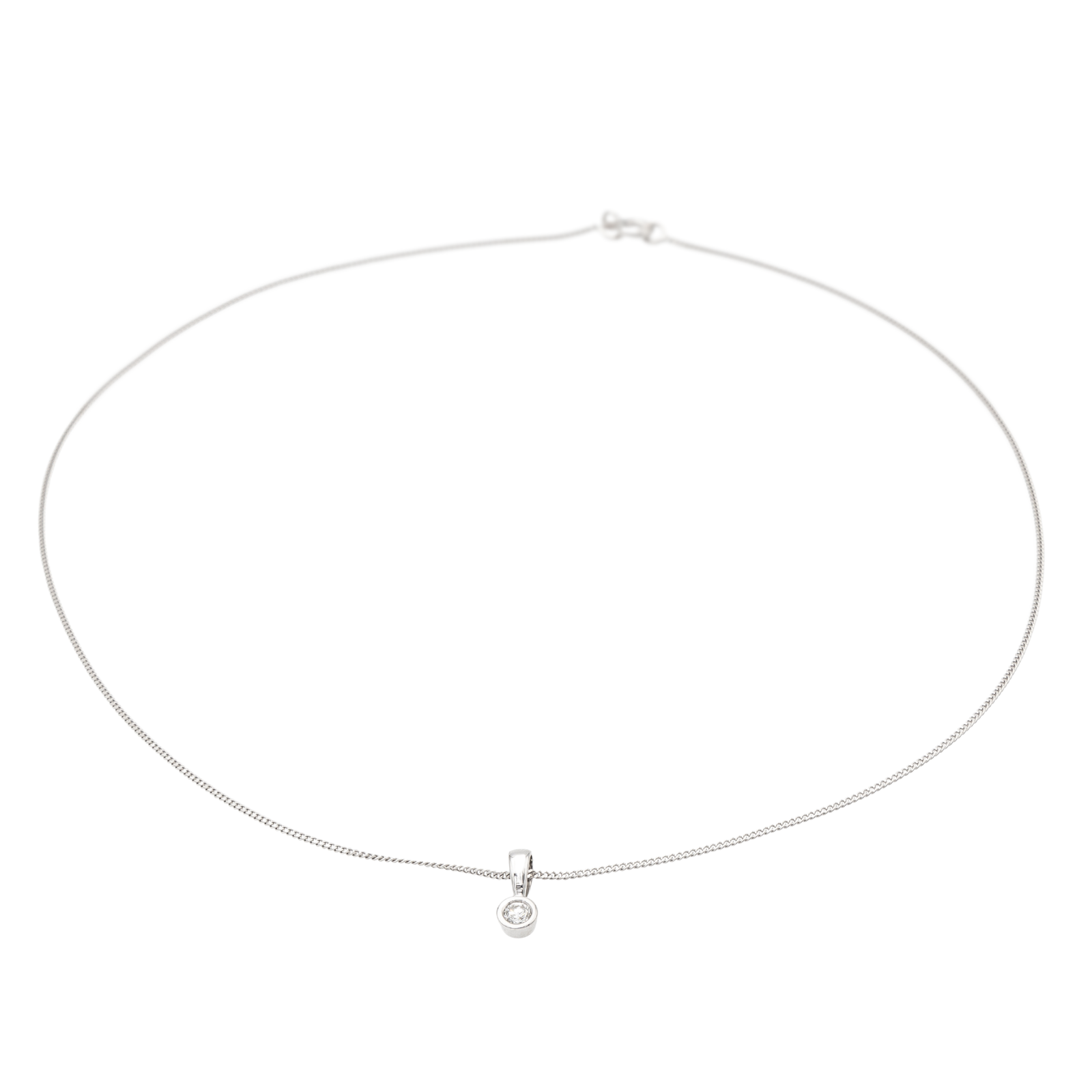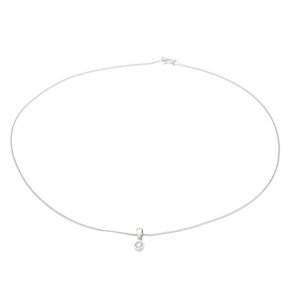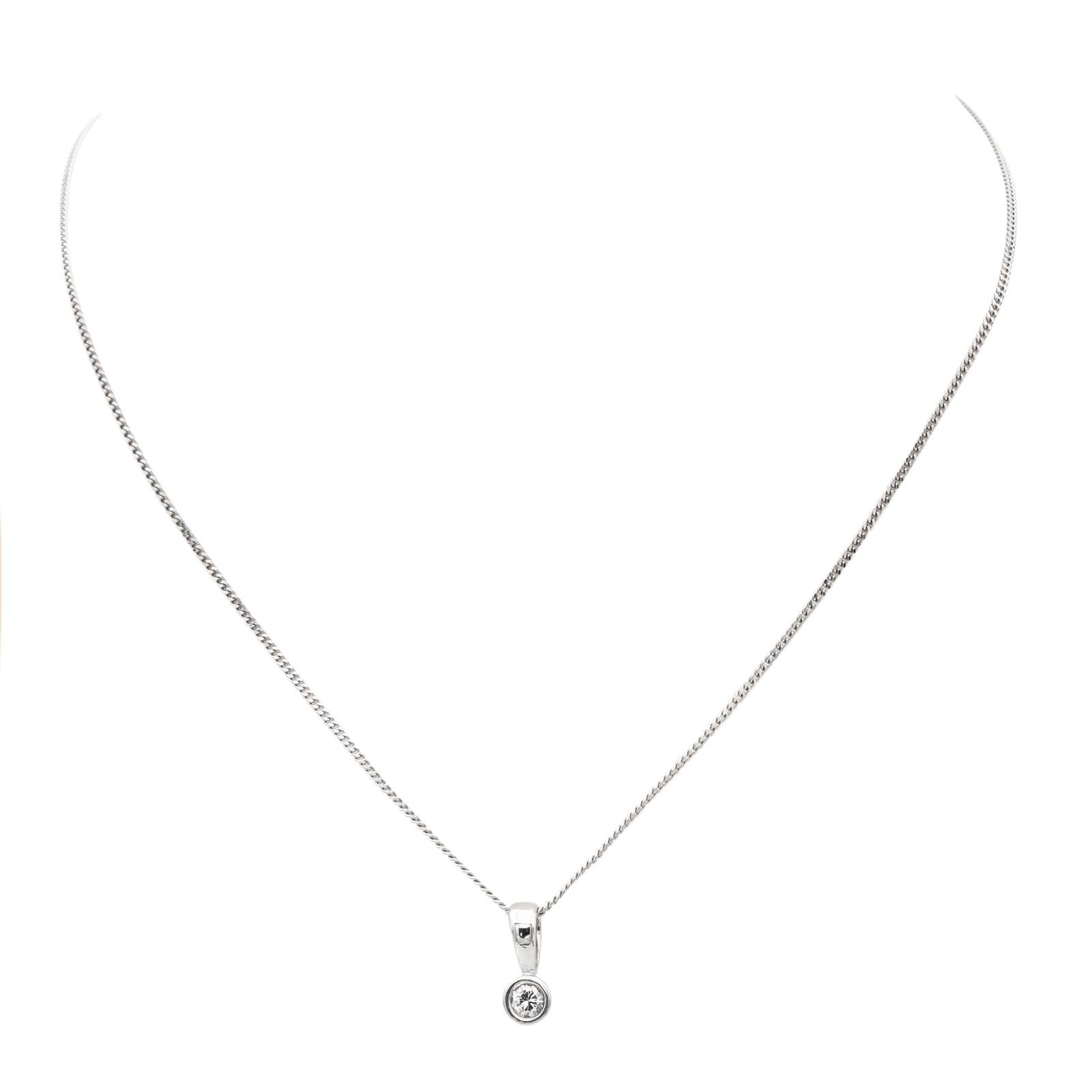 Collier en Or blanc 750 millièmes (18 carats), Pendentif serti clos diamant taille brillant G-H V-SI d'environ 0,11 ct, Dimensions pendentif: 1,1 cm x 0,45 cm, longueur chaîne: 40 cm, largeur chaîne: 0,09 cm, Poinçon tête d'aigle, Poids total: 2,46 g, état neuf